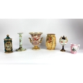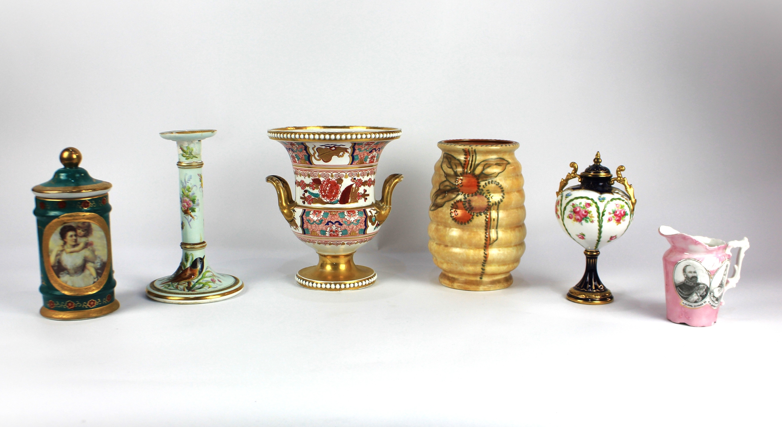 A Worcester porcelain candlestick, handpainted against the pale blue duck egg ground with a bird, insects and butterflies, bearing puce mark to base, height 20.5cm; a Charlotte Read Crown Ducal vase, of ribbed form; an Edward VII and Queen Alexandra commemorative jug; a covered porcelain jar decorated against the teal coloured ground with a panel portrait of a woman and child; a Royal Doulton two handled covered urn, painted with sprays of roses within leaf swag border; and a Spode imari two handled campagna vase, height 20cm (6) (AF)
