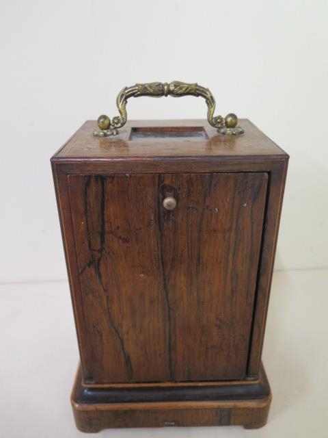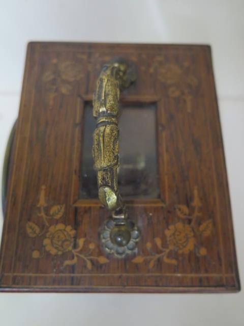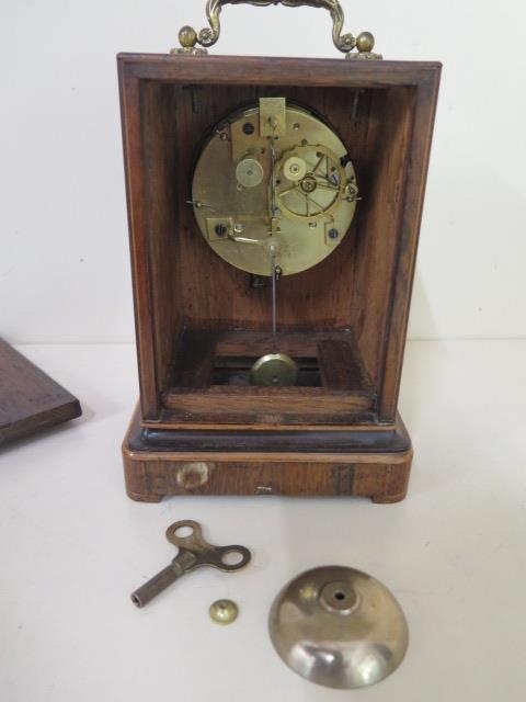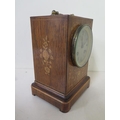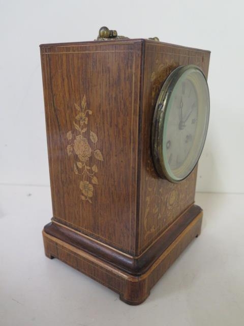 An early 19th century French marquetry inlaid rosewood carriage clock, the movement engraved Meyer Paris, with silk suspension, 21cm tall x 14cm x 11cm, in good overall condition, running and strikes on half and on the hour