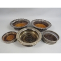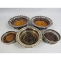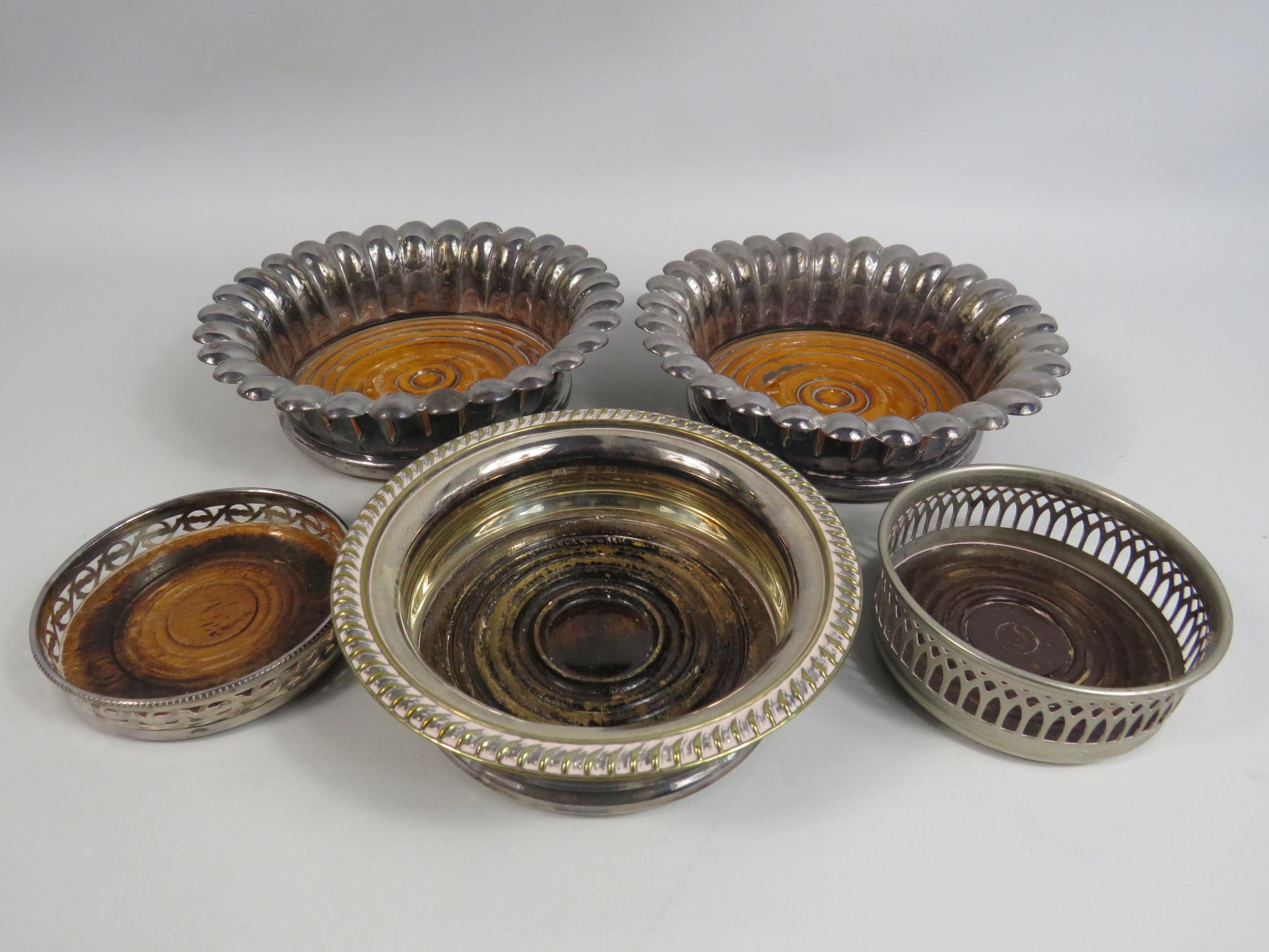 5 Vintage silverplated and wooden wine bottle coasters.