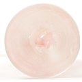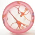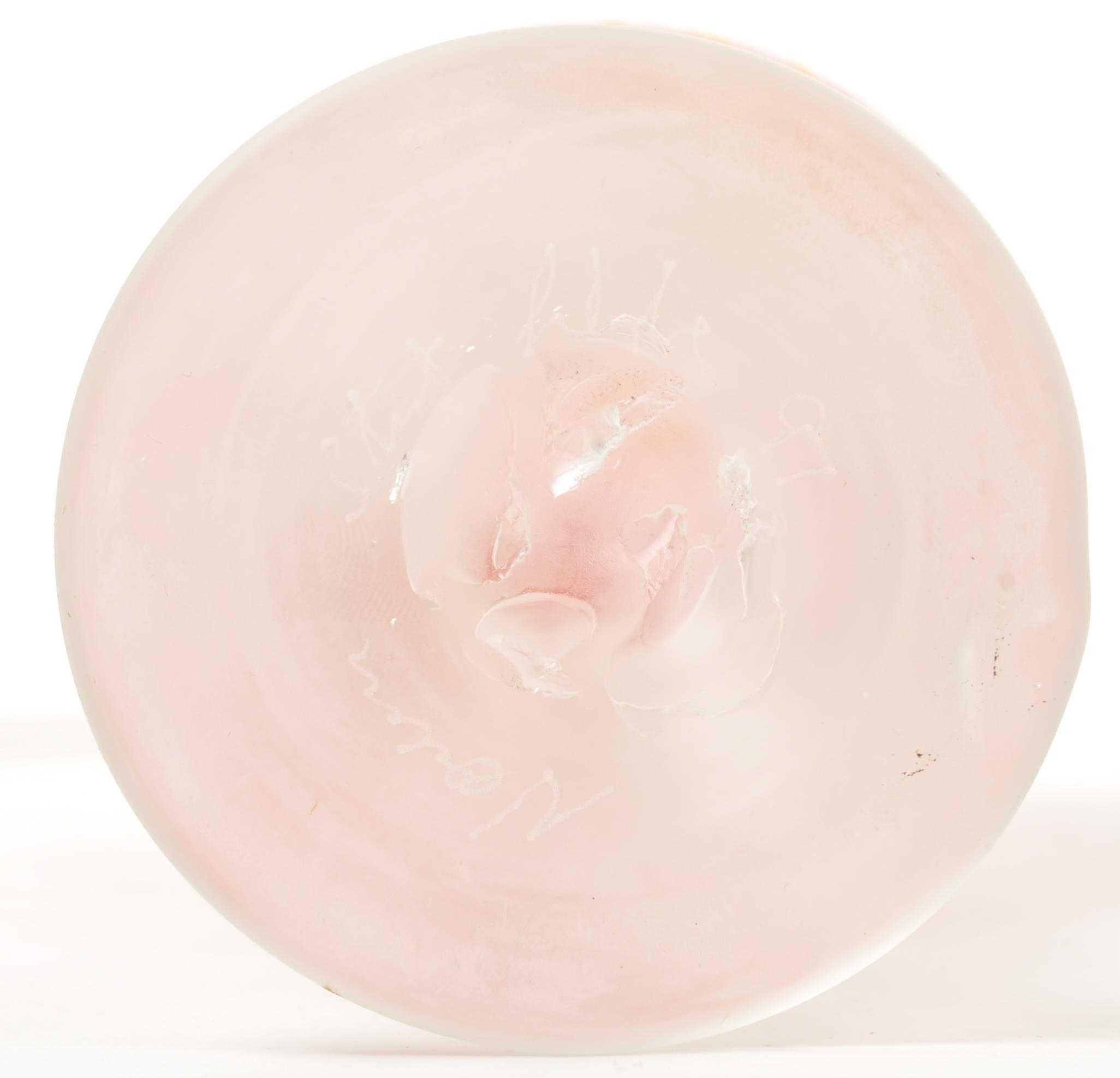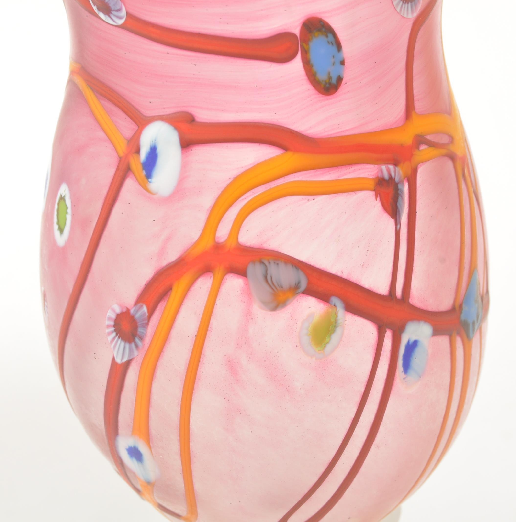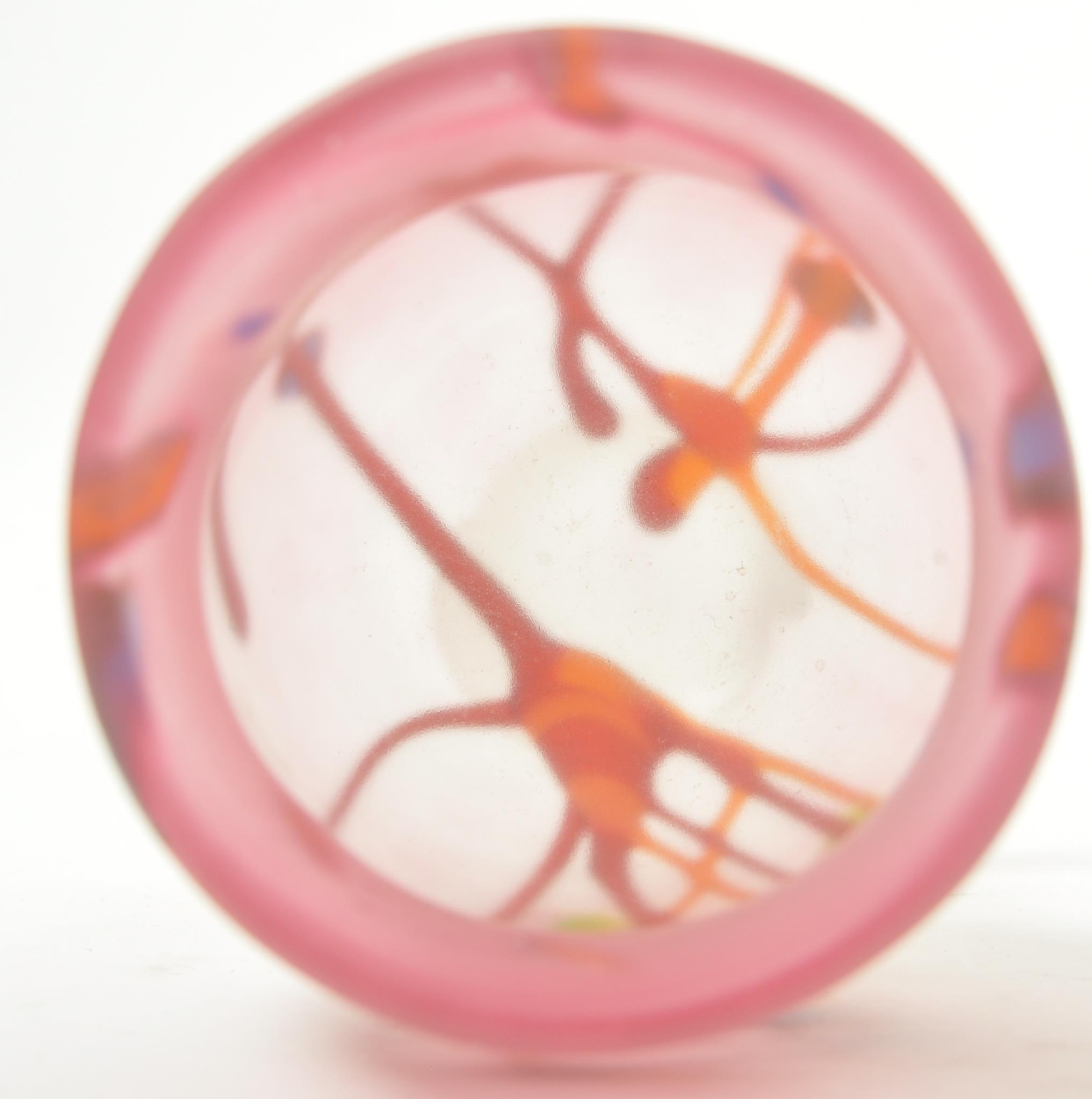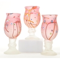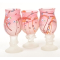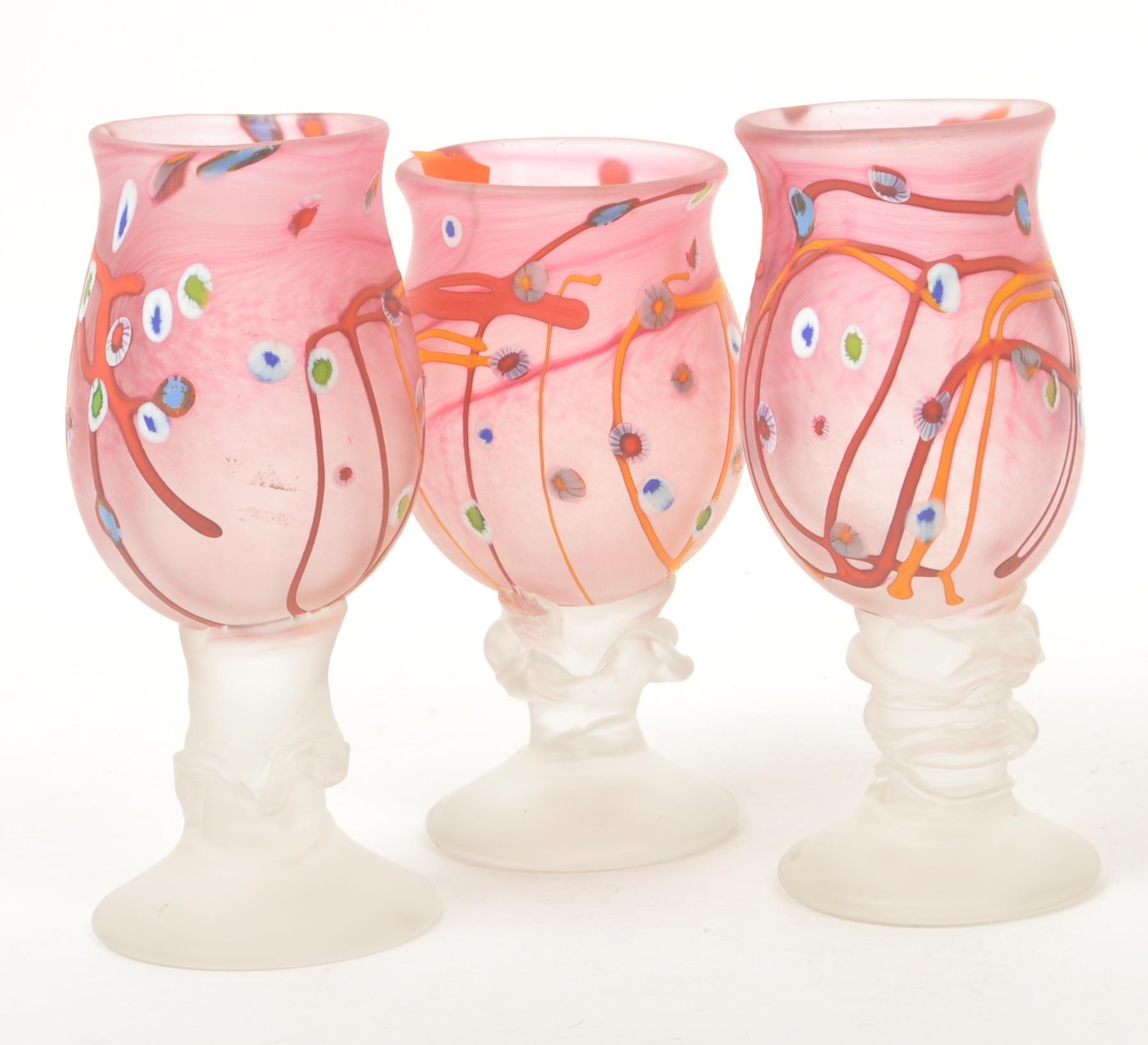A set of three 20th century studio art glass hand blown stemmed glasses. Each glass raised on a rounded clear base, with crushed stem. Having pink glass bodies, with flared rim, featuring abstract line design and millefiori details.