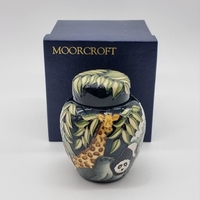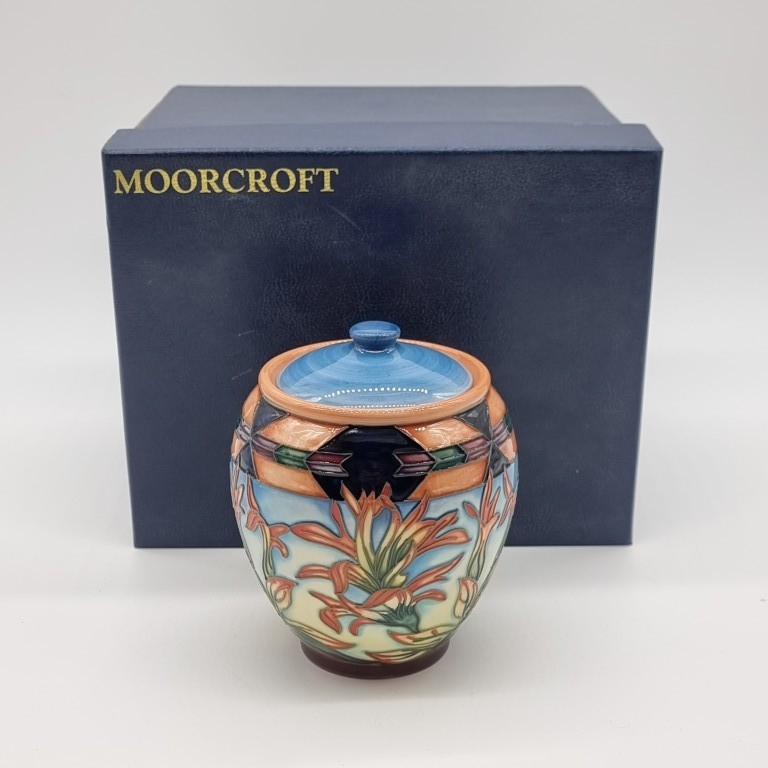 A Moorcroft 'Indian Paintbrush' pattern jar and cover, 14.5cm high, boxed.