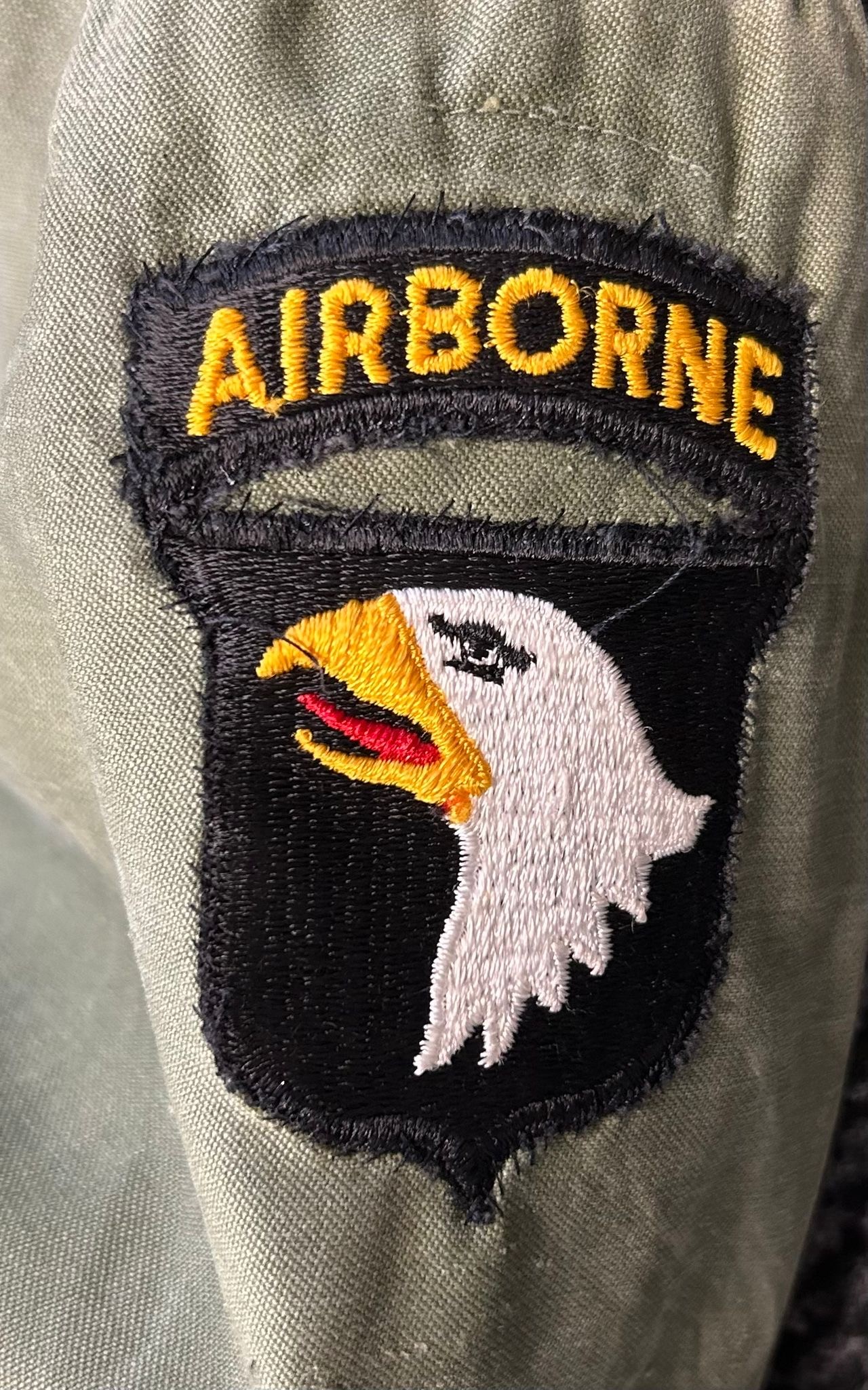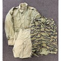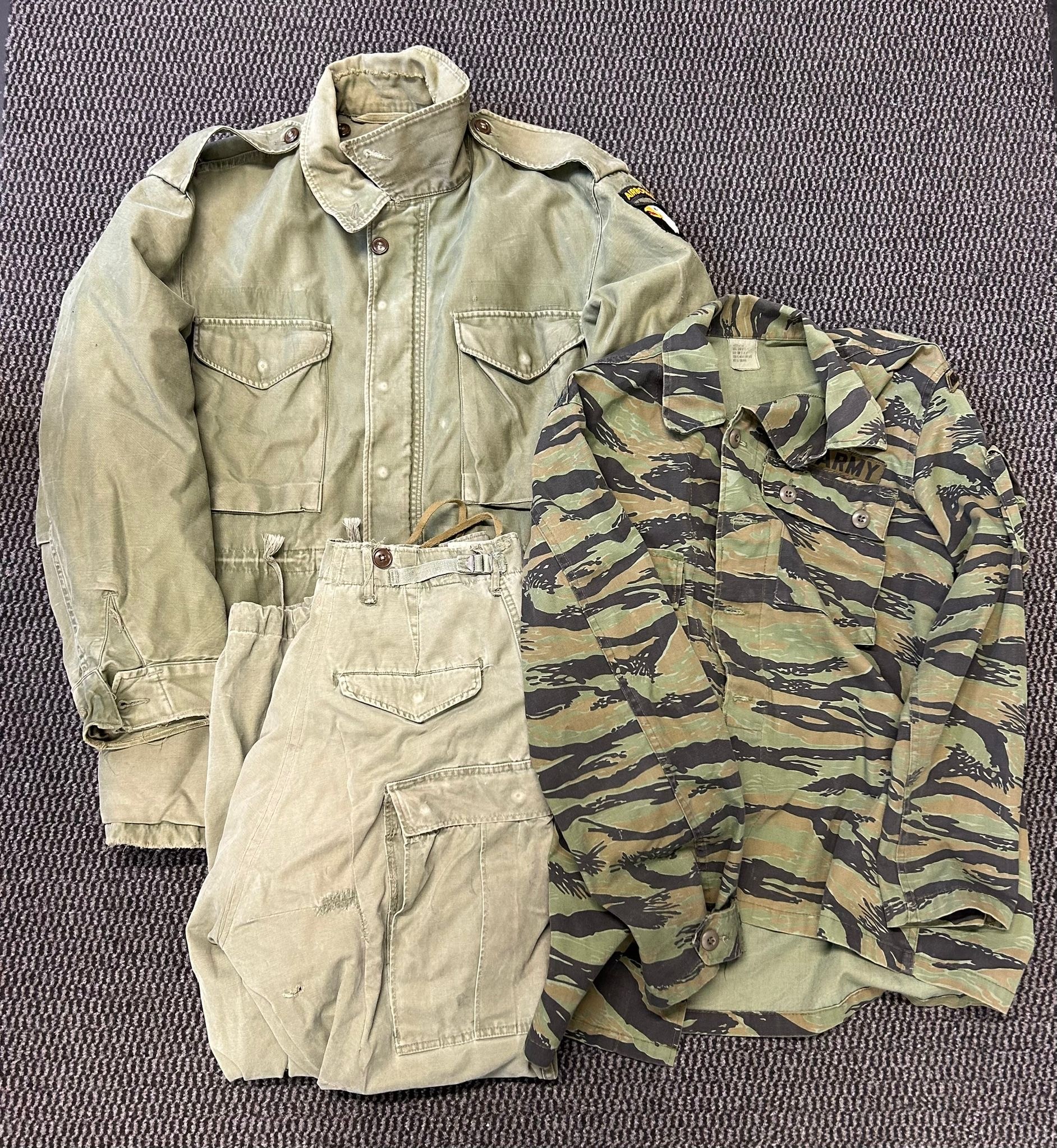 A U.S. vietnam war period tiger stripe combat shirt with special forces insignia. VGC A 1955 Pattern U.S. olive drab field jacket with airborne insignia complete with companion combat trousers GC ( some combat wear )