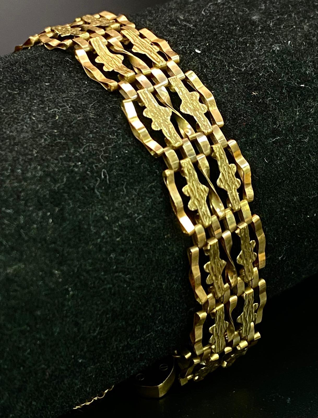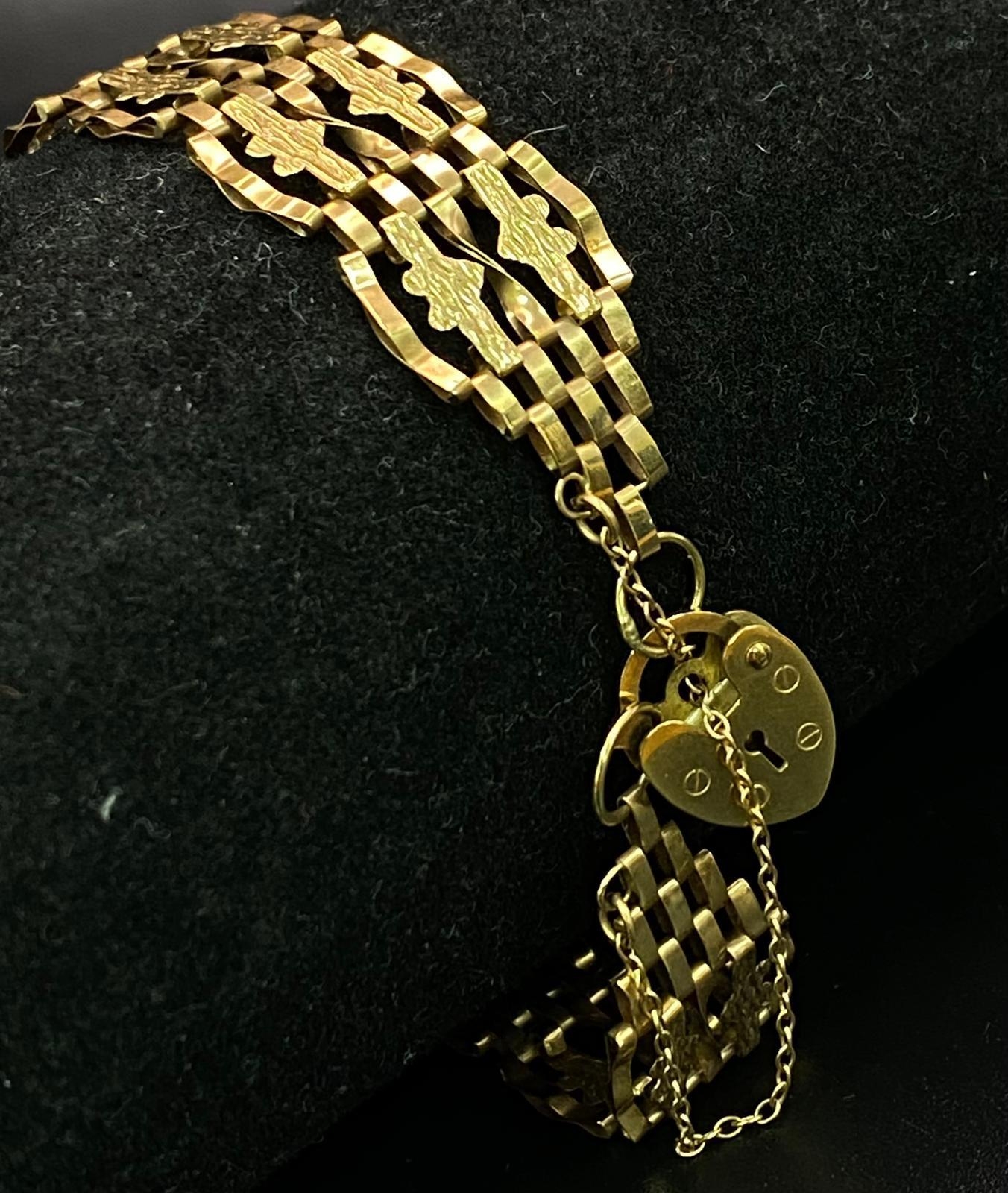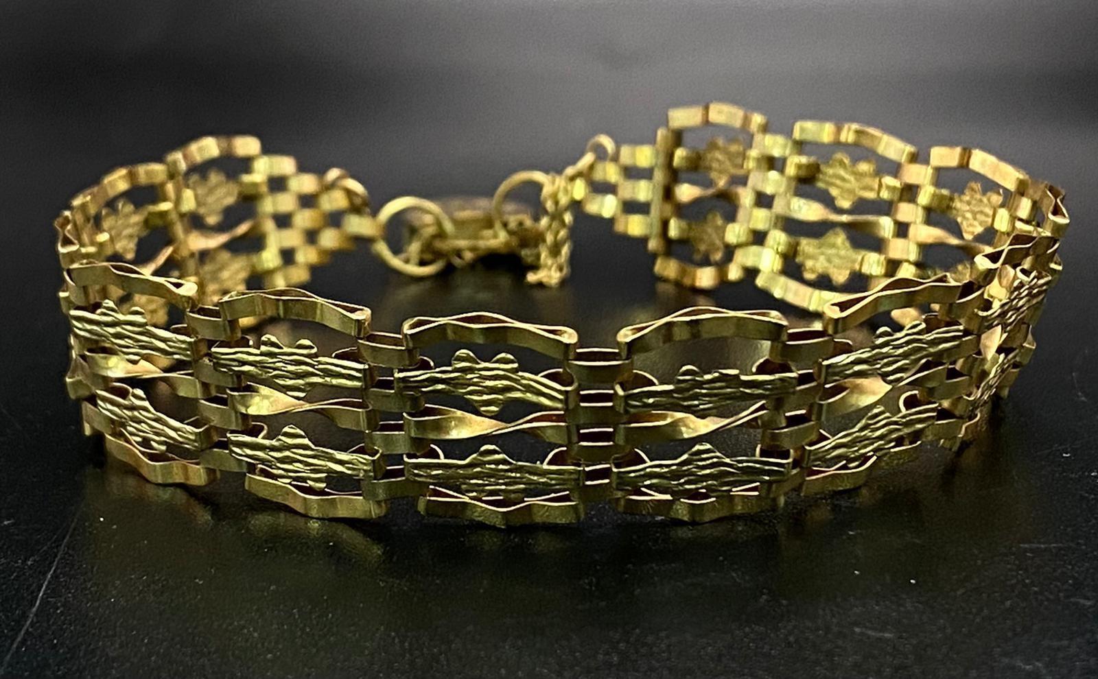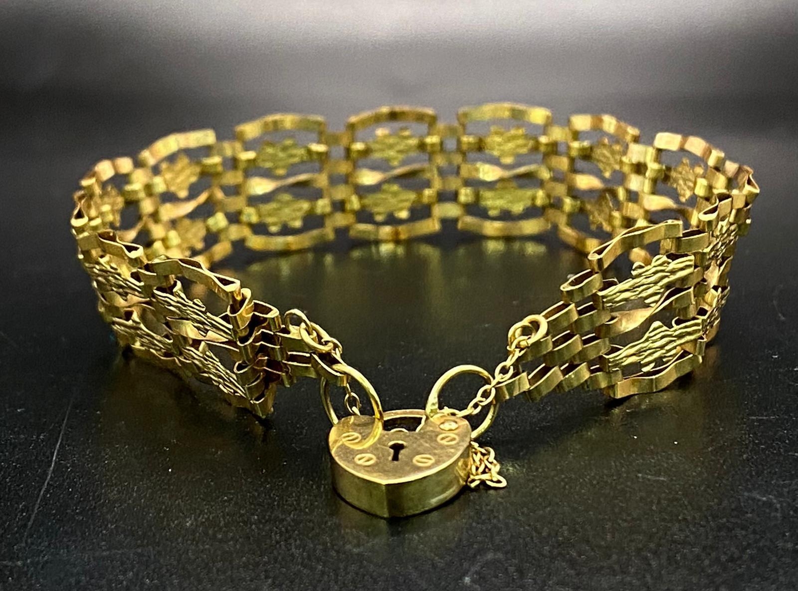A VINTAGE 9K ROSE GOLD ROMANTIC GATE BRACELET , ADORNED WITH HEARTS THROUGHOUT . 6.6gms