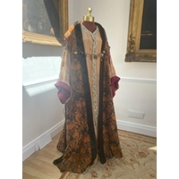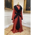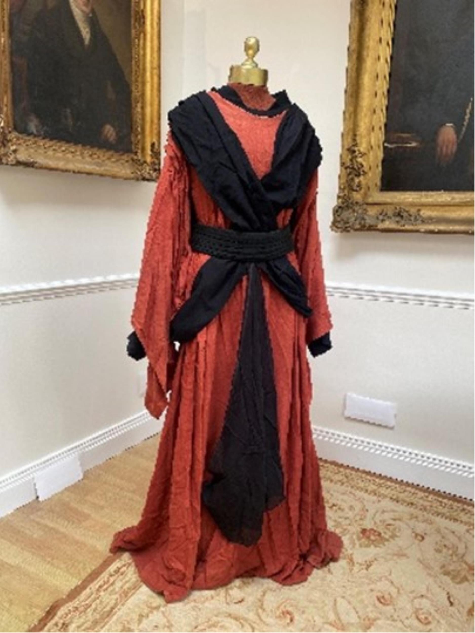 A mens Buddhist style robe in rust linen, with black under-garment and black decorative belt, labelled Glyndebourne Festival Opera (Idomeneo)