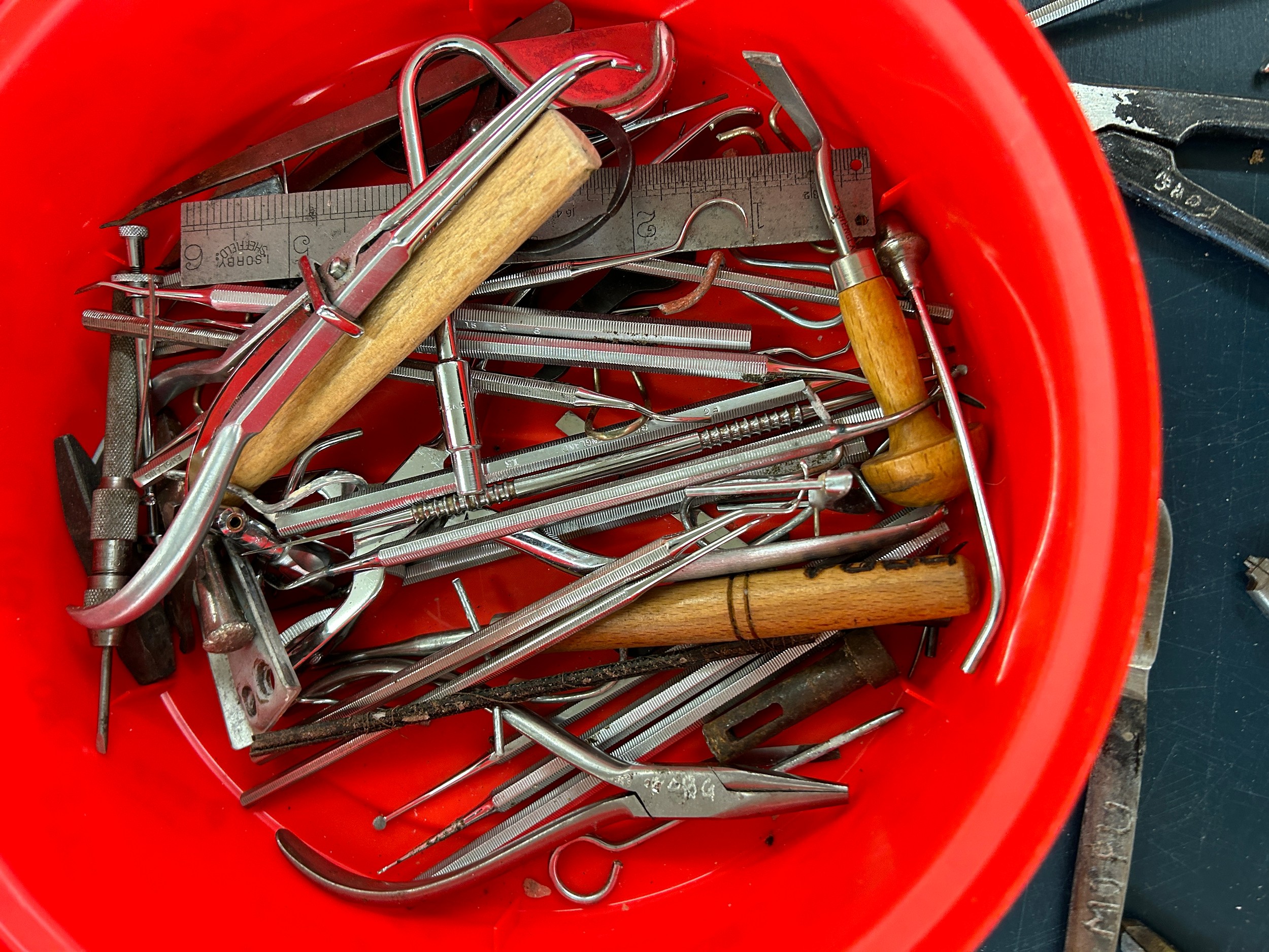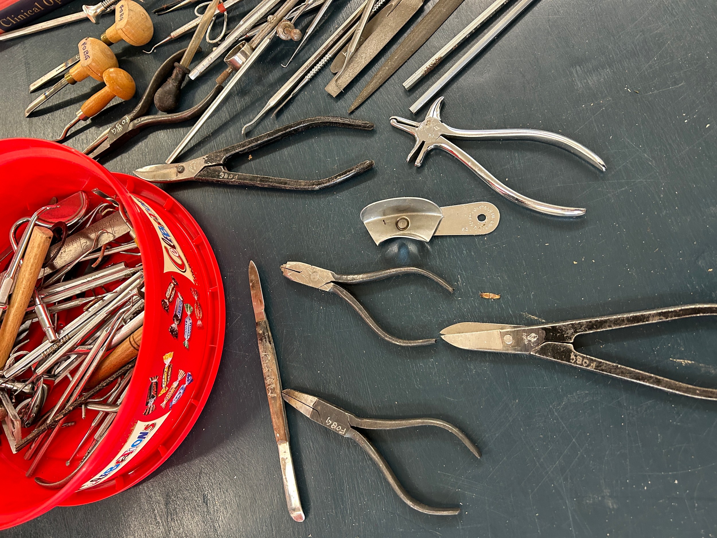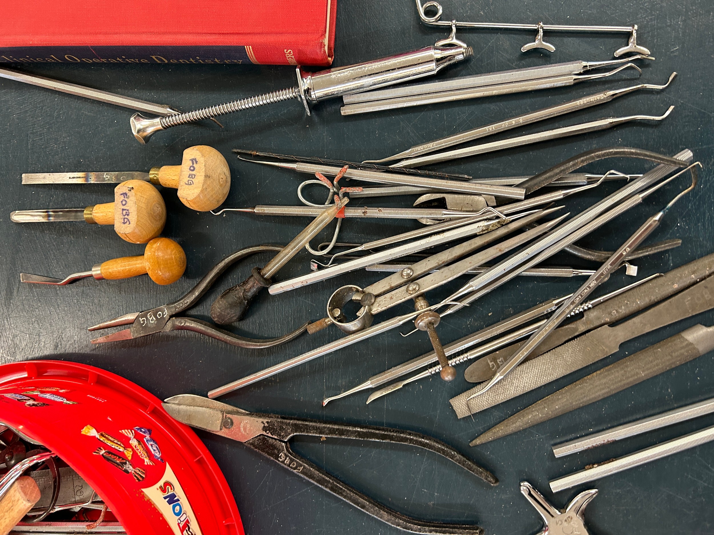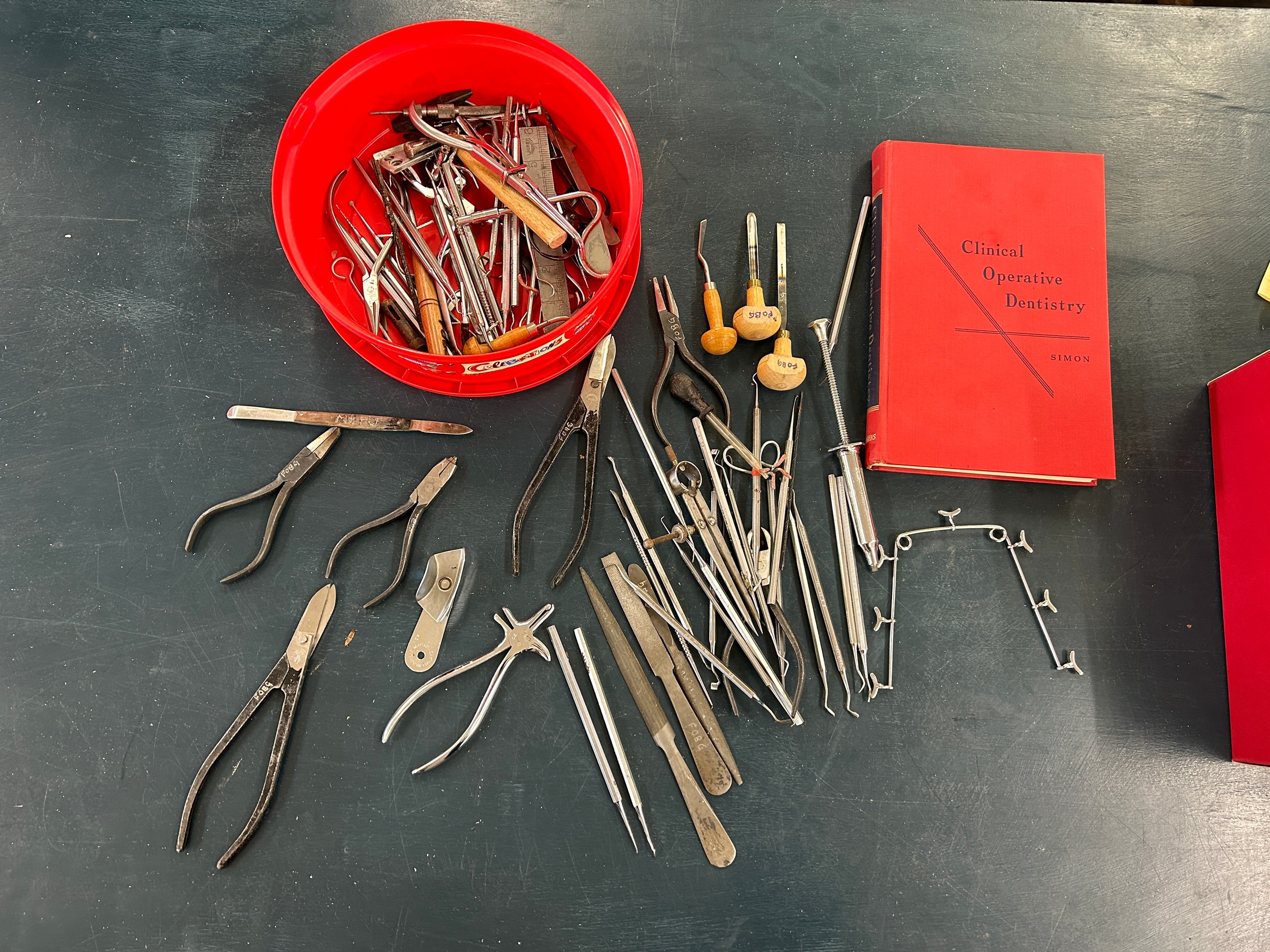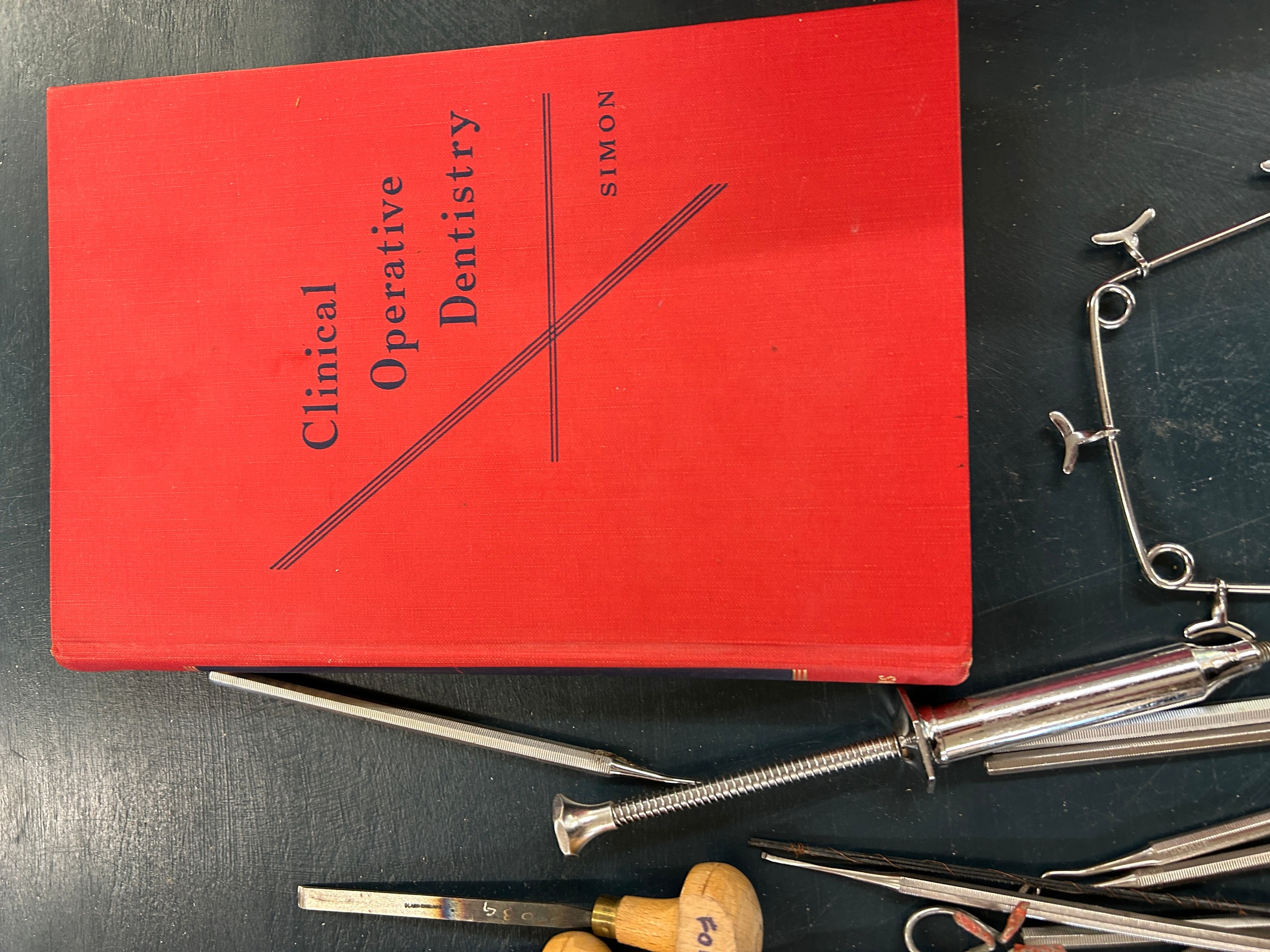 Selection of dentist equipment includes clamps, book etc