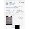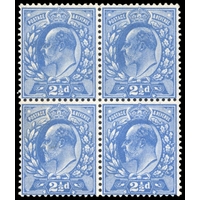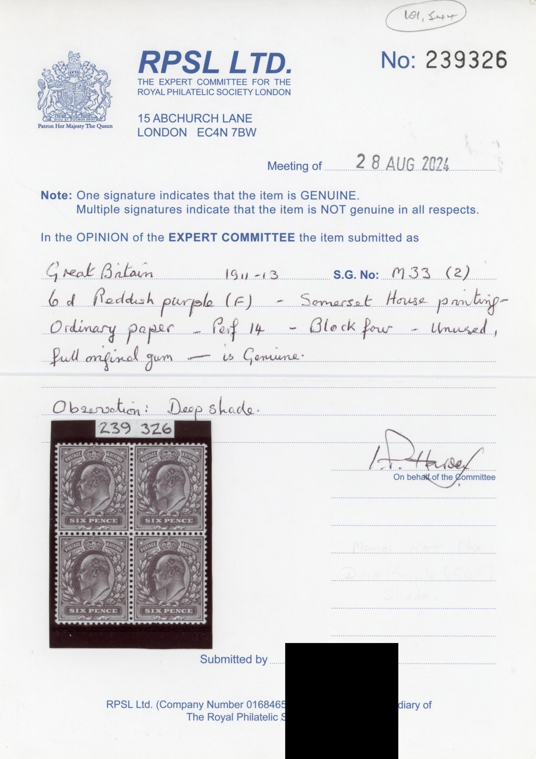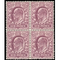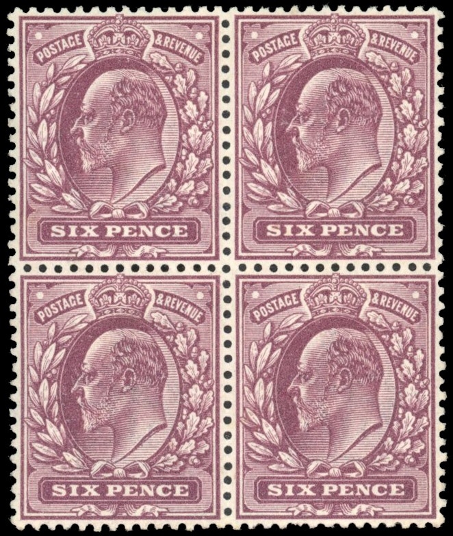 1911-13 Somerset House 6d reddish purple (fluorescent ink), unmounted mint block of four in a remarkable deep shade which we believe to be a â??golden brownâ?? fluorescence variety. RPS Certificate (2024) stating â??deep shadeâ??. SG 298 var, Spec M3