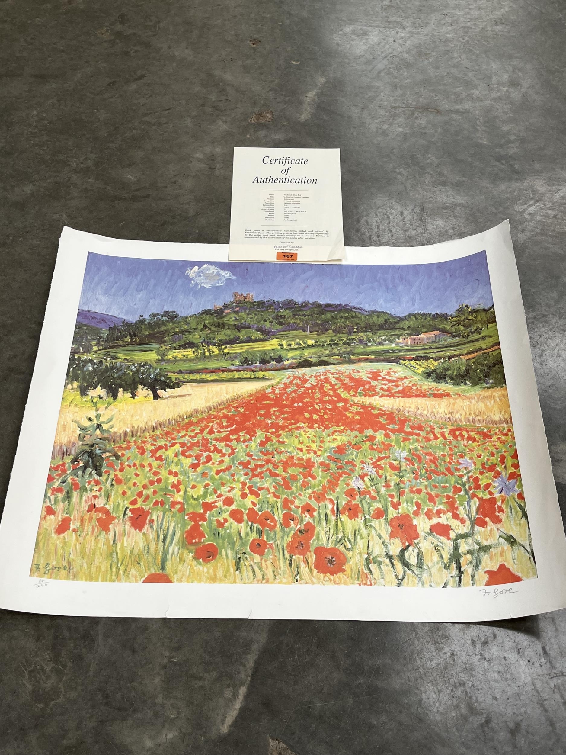 FREDERICK GORE. C.B.E; R.A; BRITISH 1913-2009. A Field of Poppies, Lacoste. Signed in pencil and numbered 68/250. Lithograph 27' x 32' paper size. The lot with certificate. Unframed.