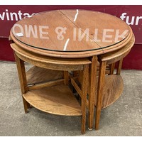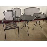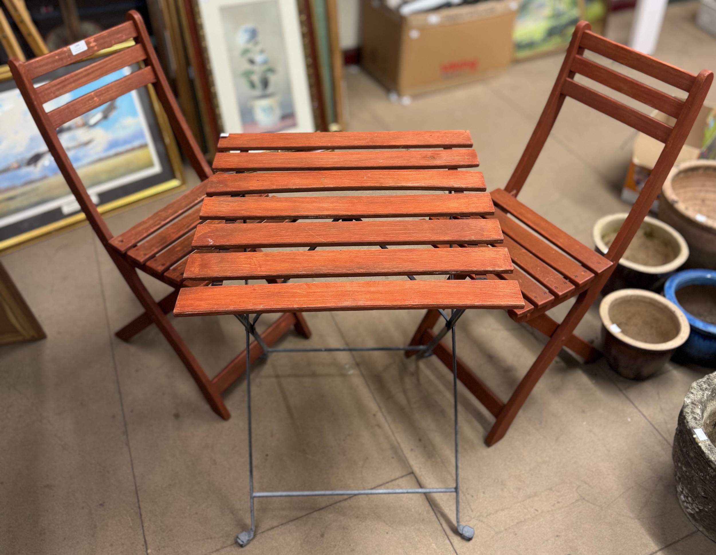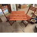 A small wooden folding garden table and two chairs