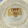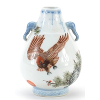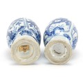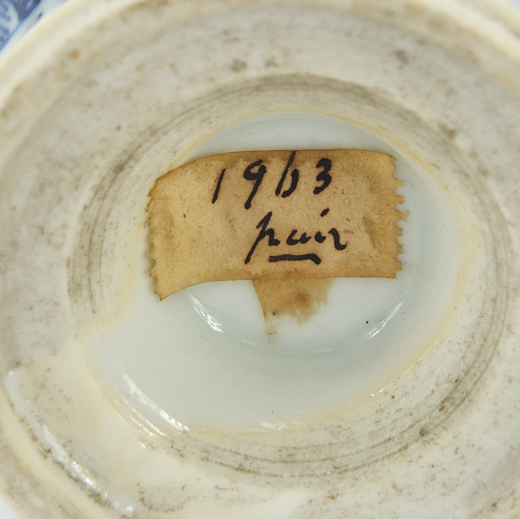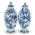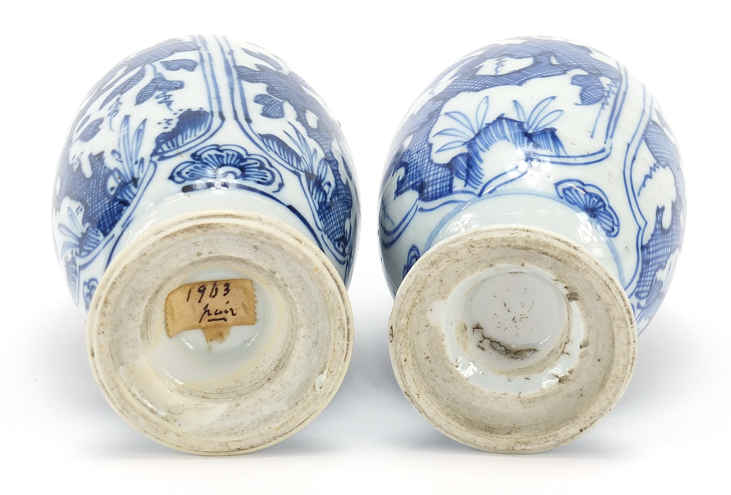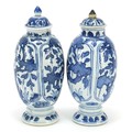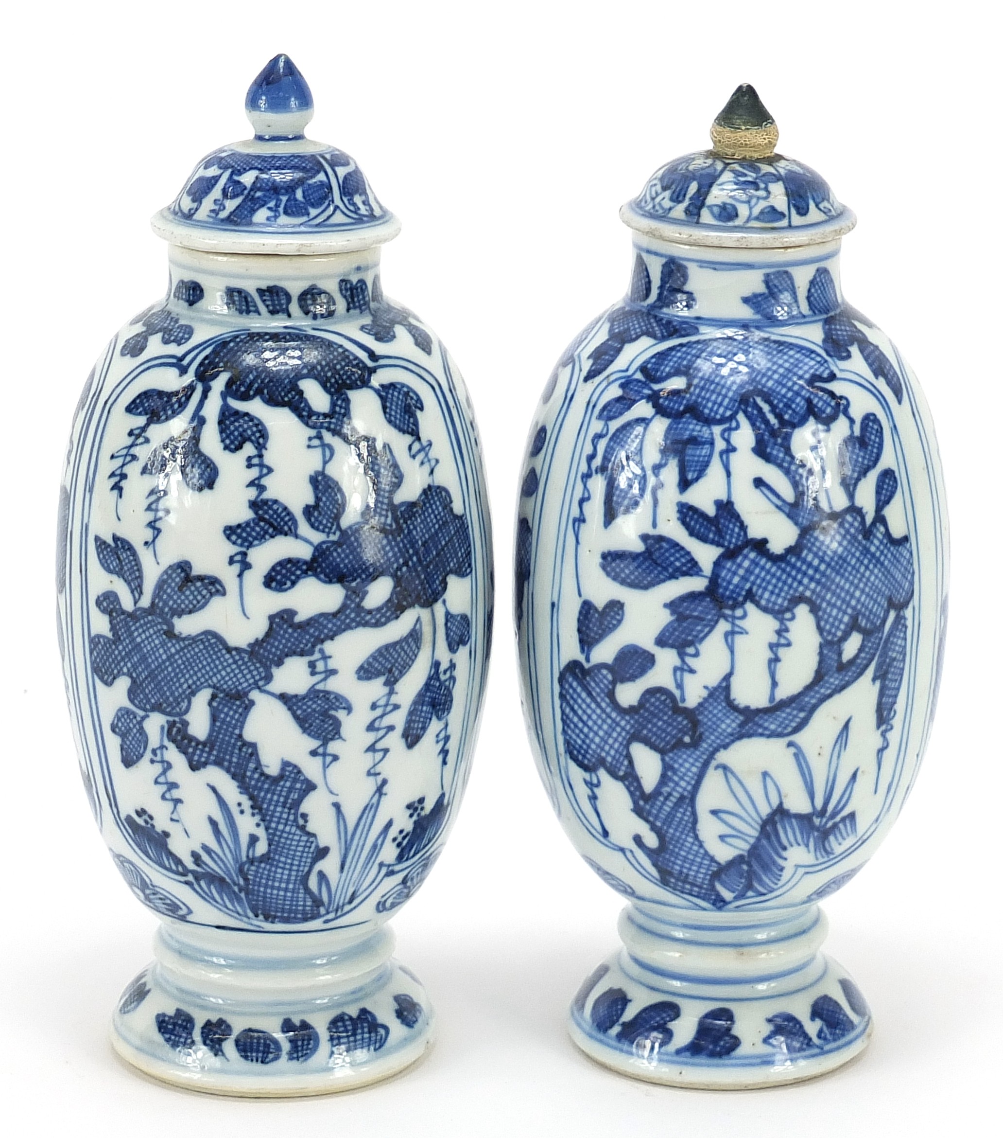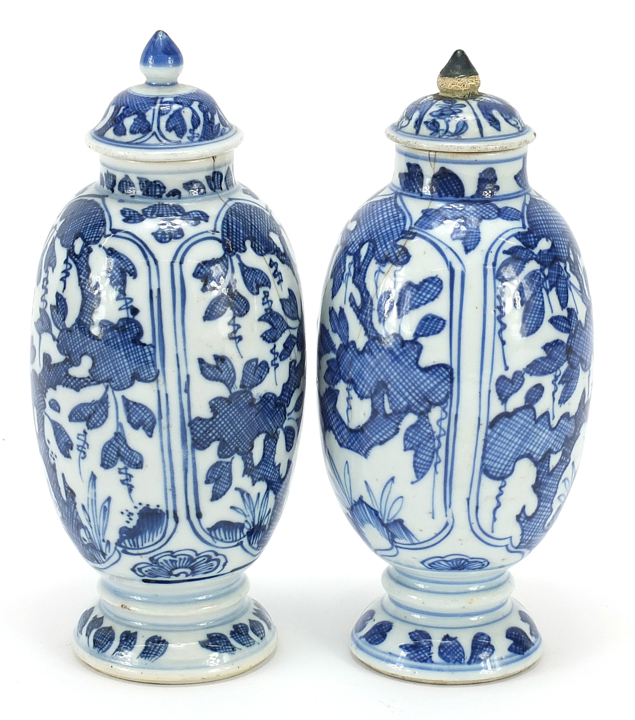 Matched pair of Chinese blue and white porcelain vases and covers hand painted with panels of flowers, one with inscribed paper label to the base, the largest 17cm high
