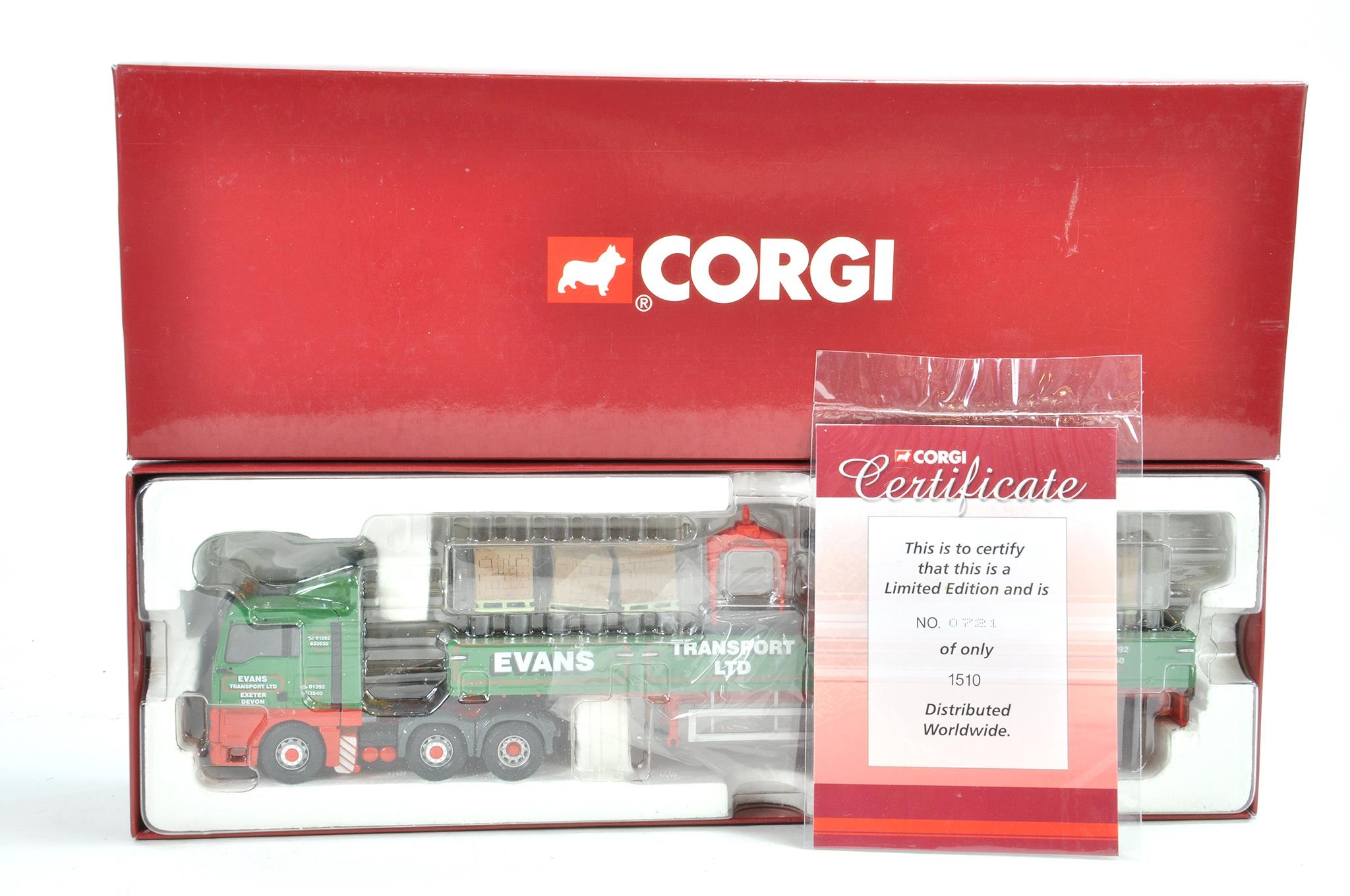 Corgi Diecast Model Truck issue comprising No. MAN Dropside Crane in the livery of Evans. Appears to be complete, good in box, missing outer.