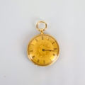 A late 19th century Moulinie Swiss ladies yellow metal fob watch, the circular dial with Roman numerals and central floral engraving, set to engraved casa with enamelled and diamond set reverse, interior case stamped '18k' and movement stamped 'Moulinie Geneve' 3.5cm wide, gross weight 34gms (including movement)