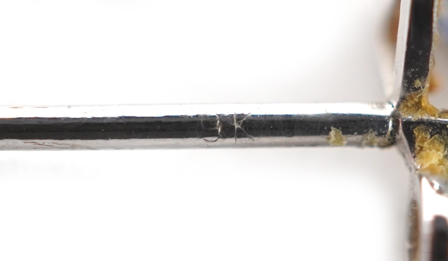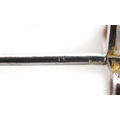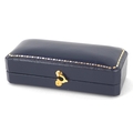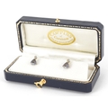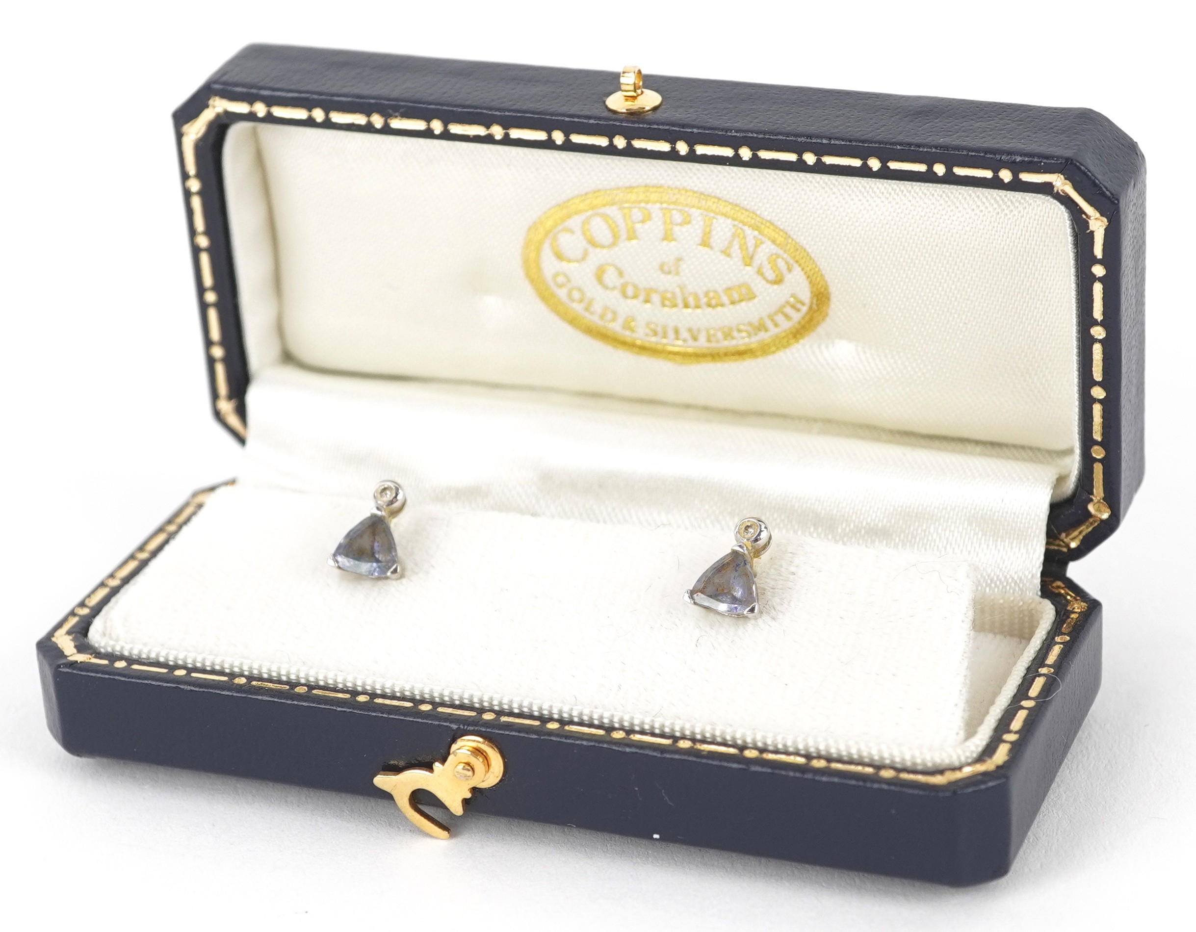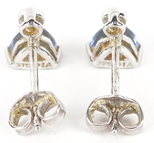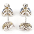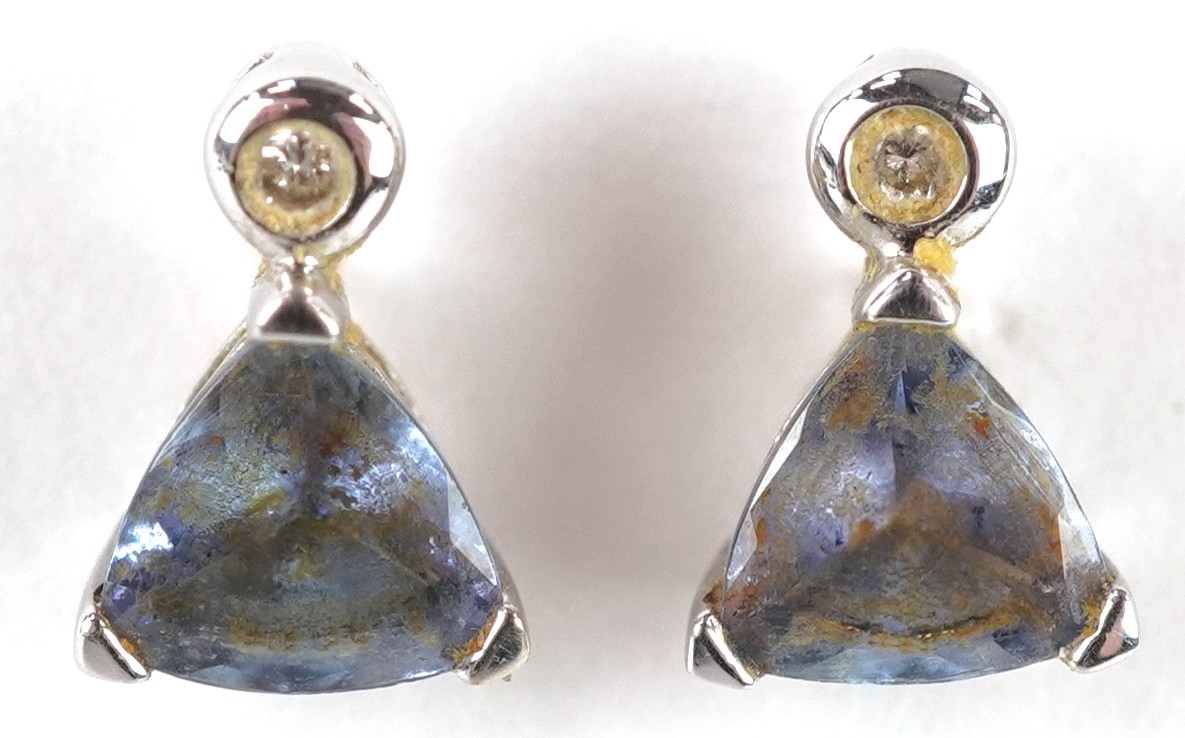 A pair of 9ct white gold diamond and blue stone stud earrings, 7.9mm high, total 1.0g.