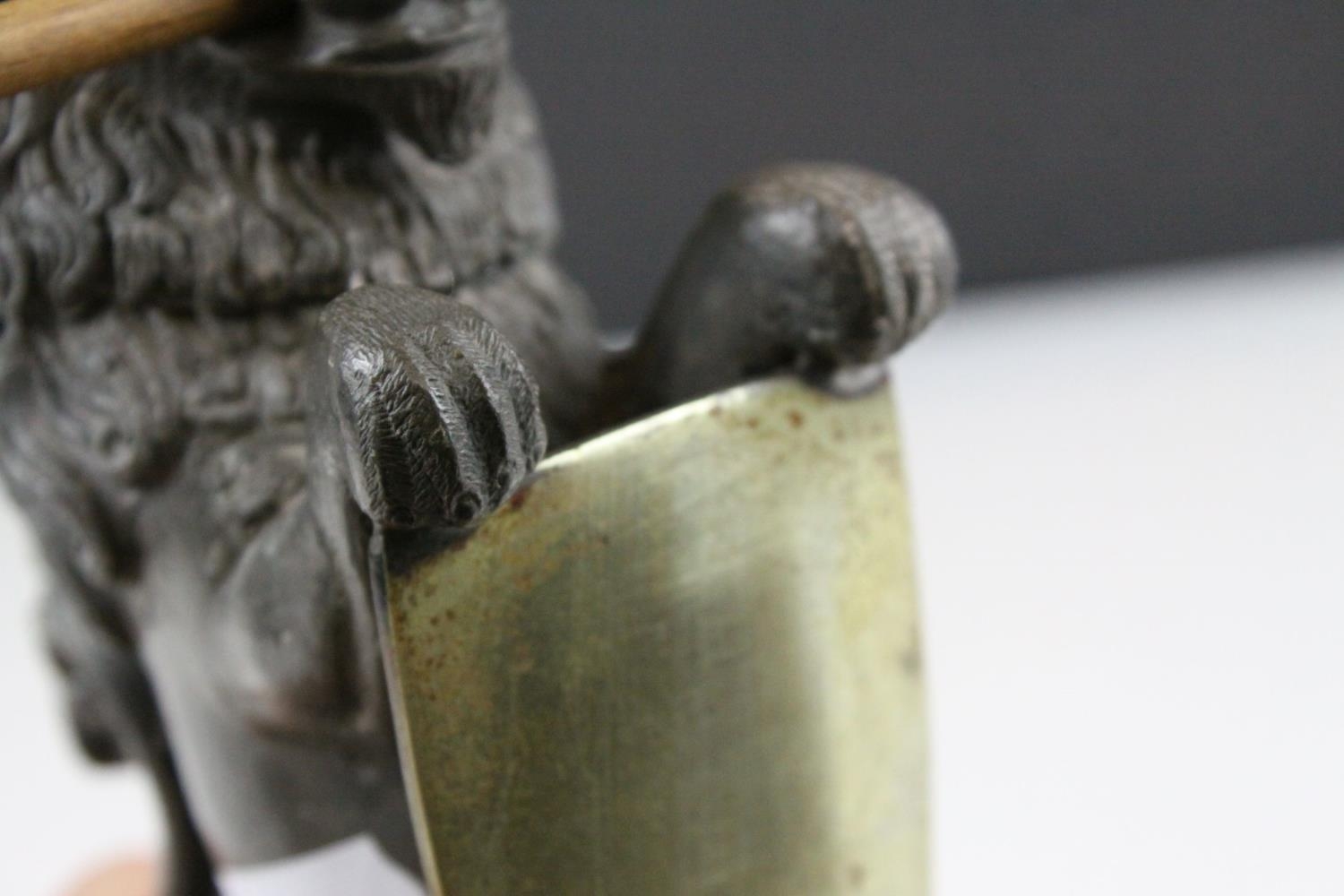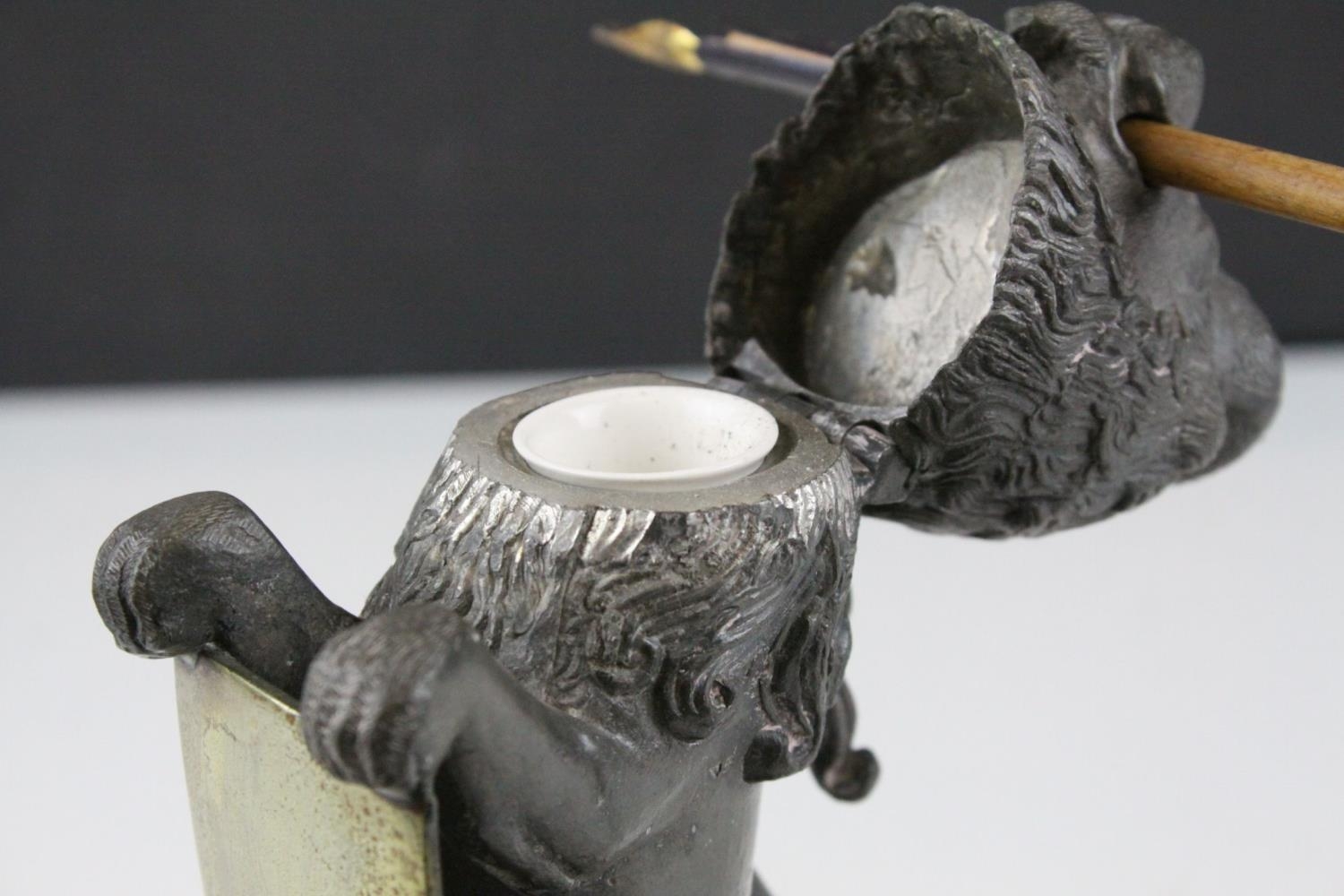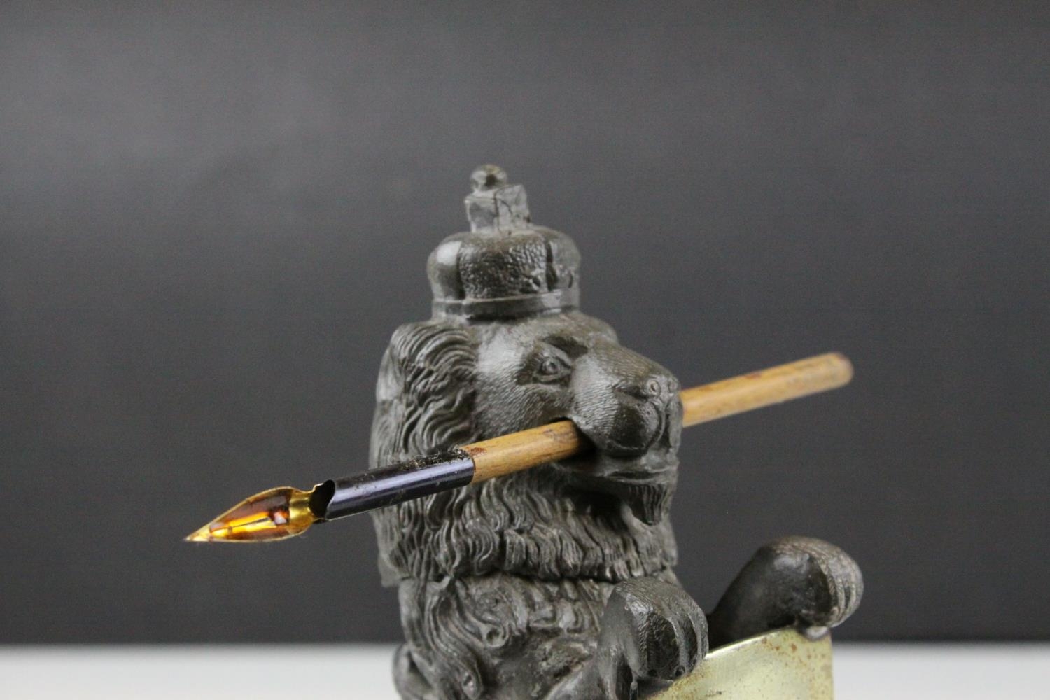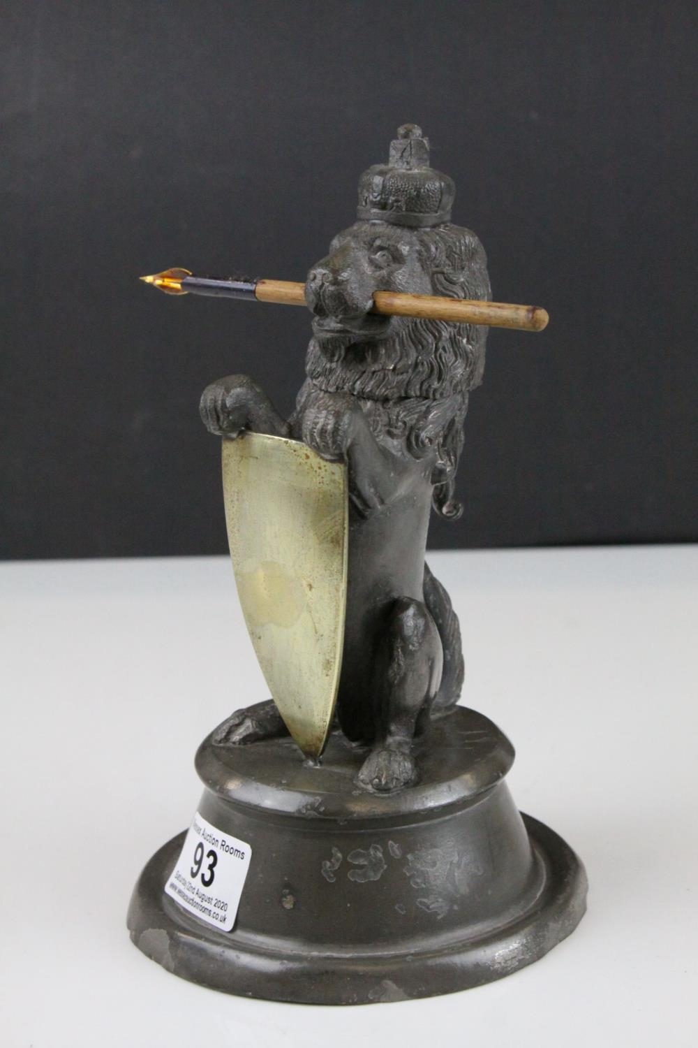 19th century Pewter Inkwell and Quill Holder in the form of a Lion sitting on his back legs and holding a Brass Shield Shaped Plaque, h.24cms