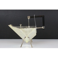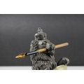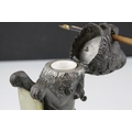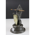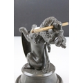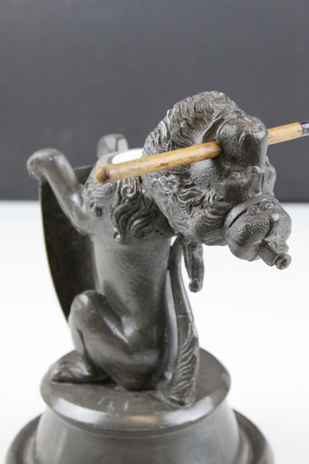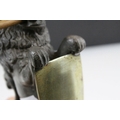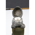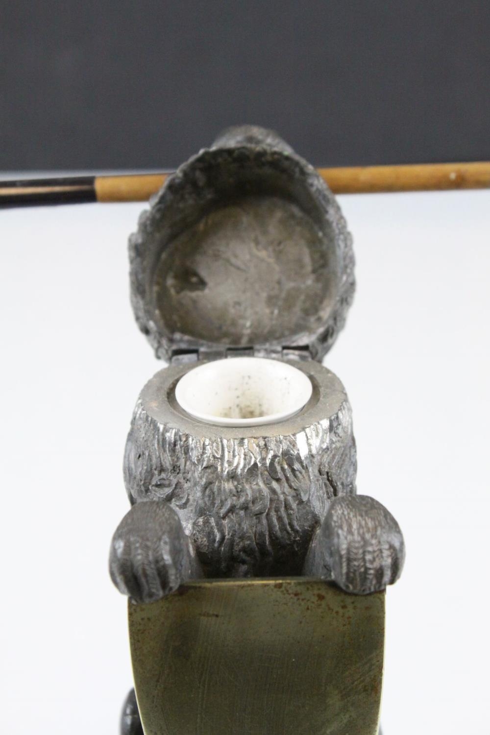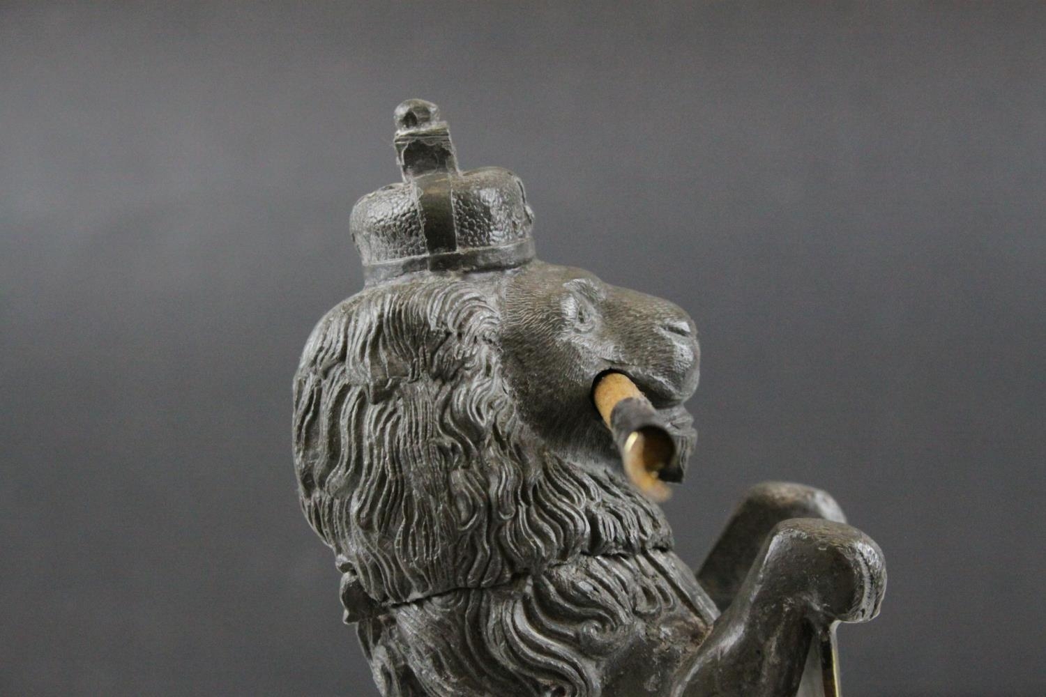 19th century Pewter Inkwell and Quill Holder in the form of a Lion sitting on his back legs and holding a Brass Shield Shaped Plaque, h.24cms