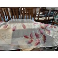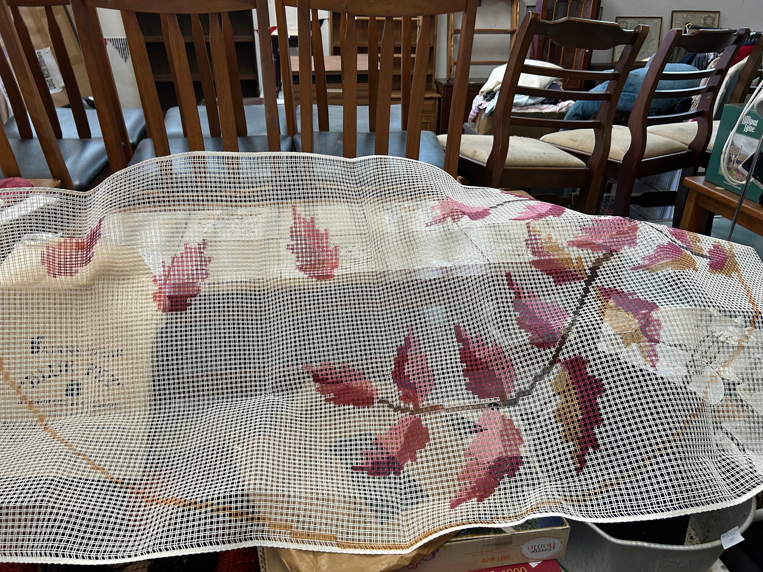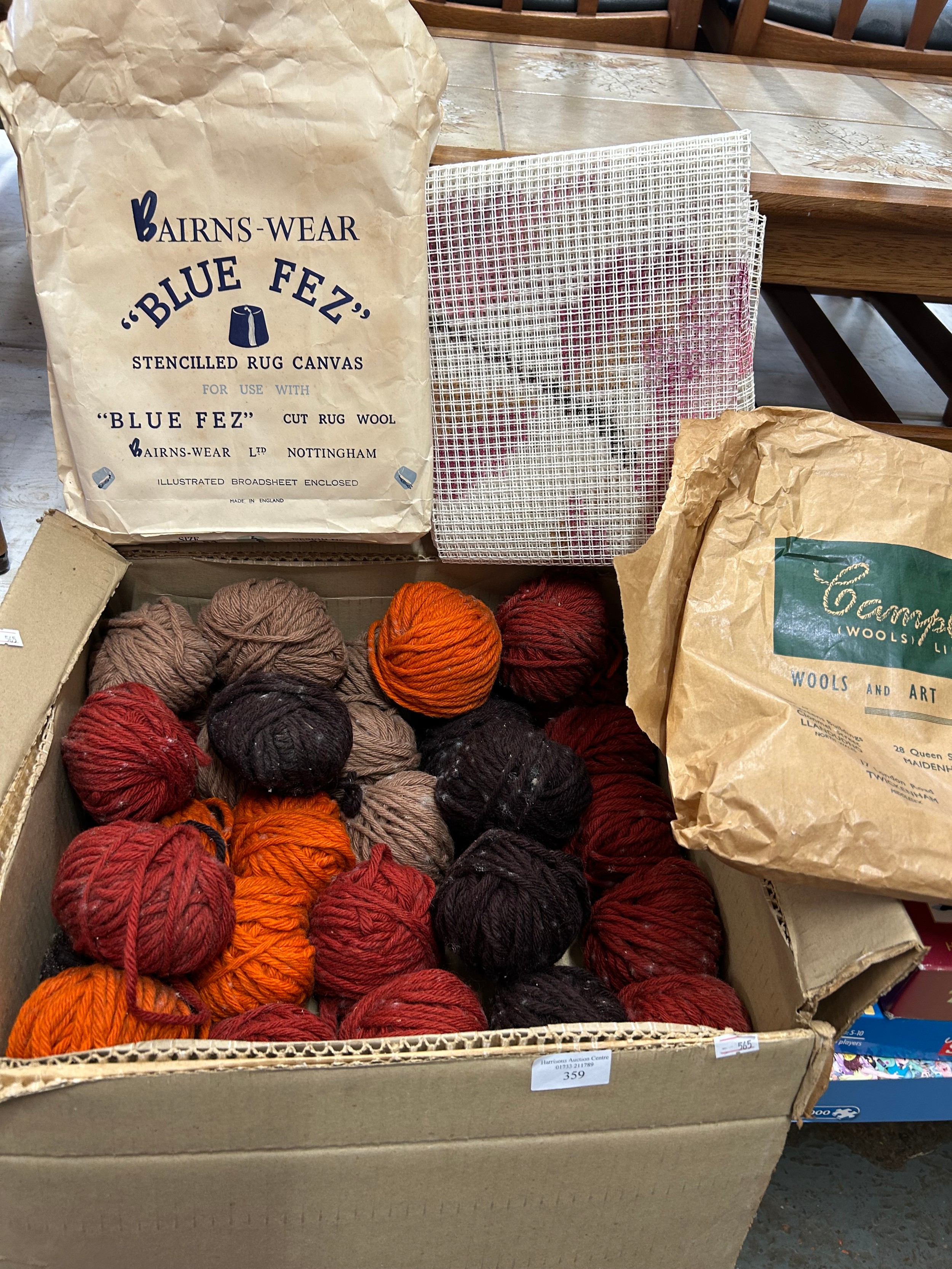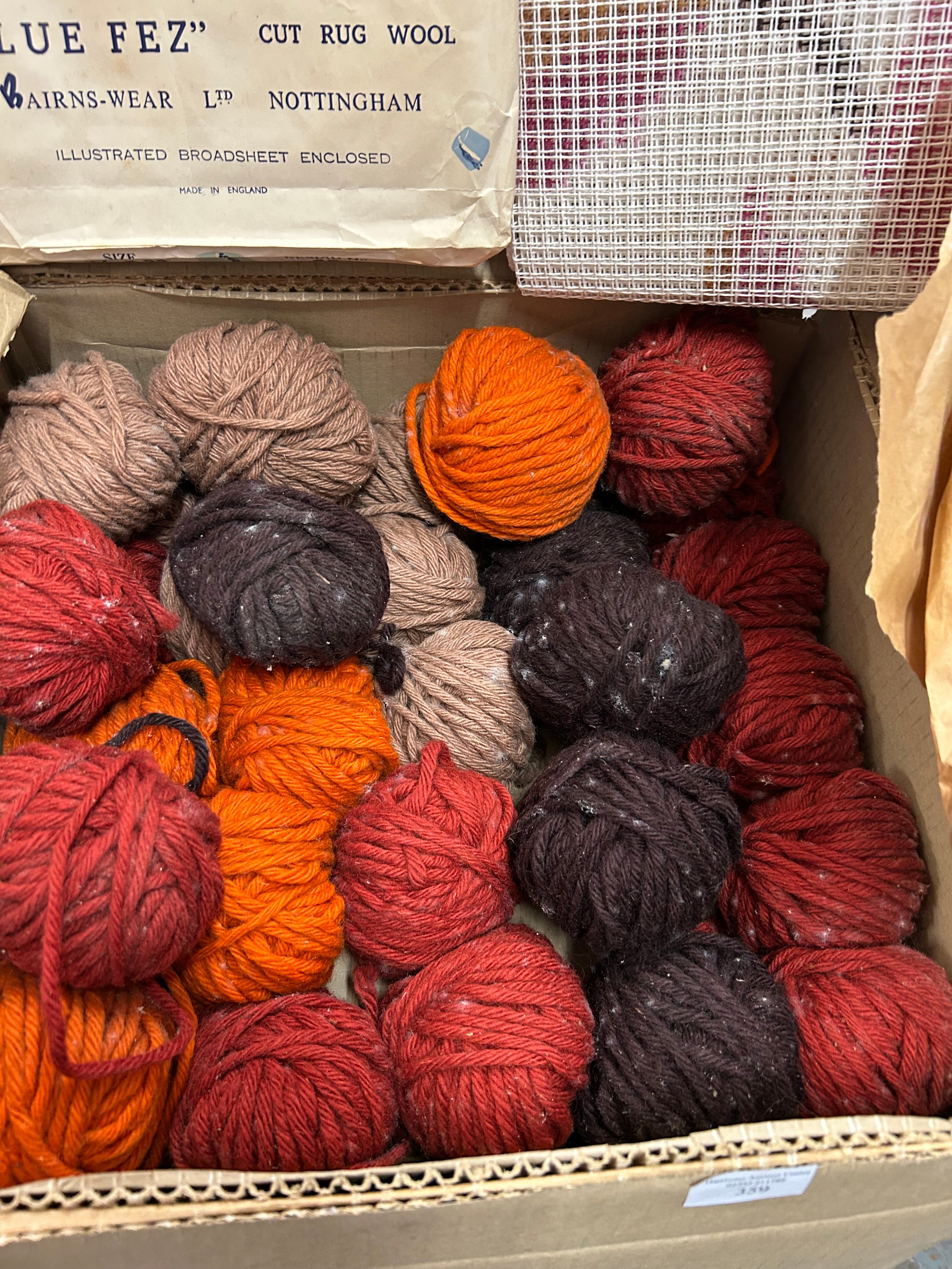 Large box of vintage balls of wool in autumnal russet colours together with a stencilled rug canvas