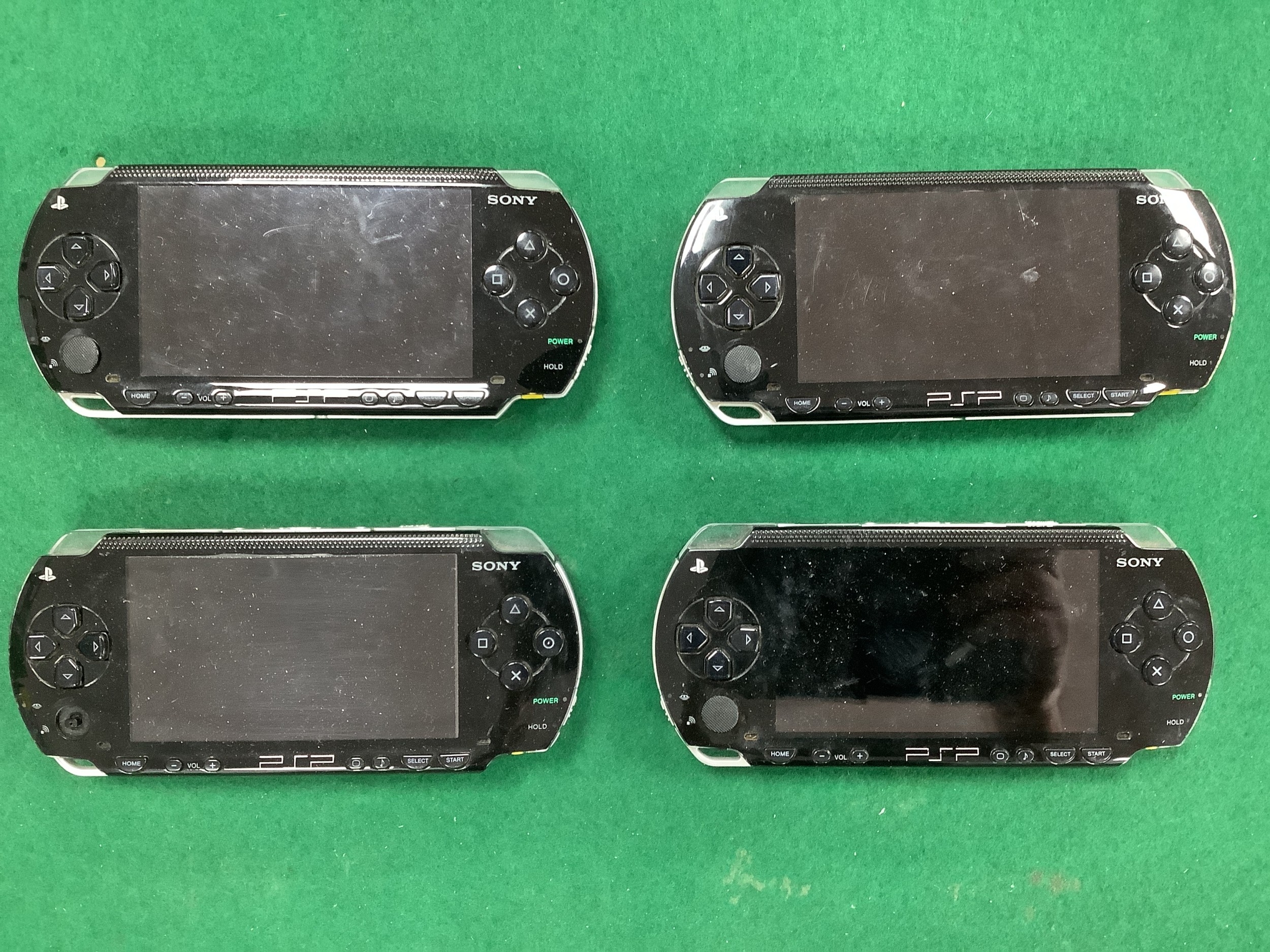 Four Sony PSP Handheld Gaming Consoles. One missing battery cover. All untested sold as spares/repair.