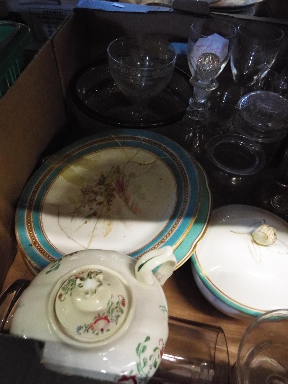 A mixed selection of china and glass-ware to include tea pot, sugar bowl etc
