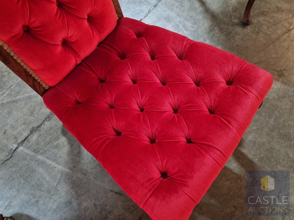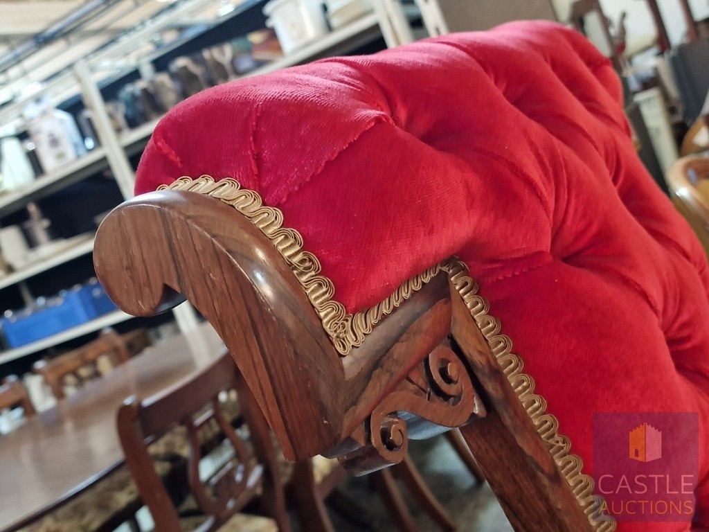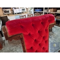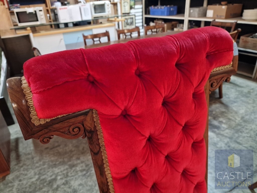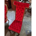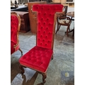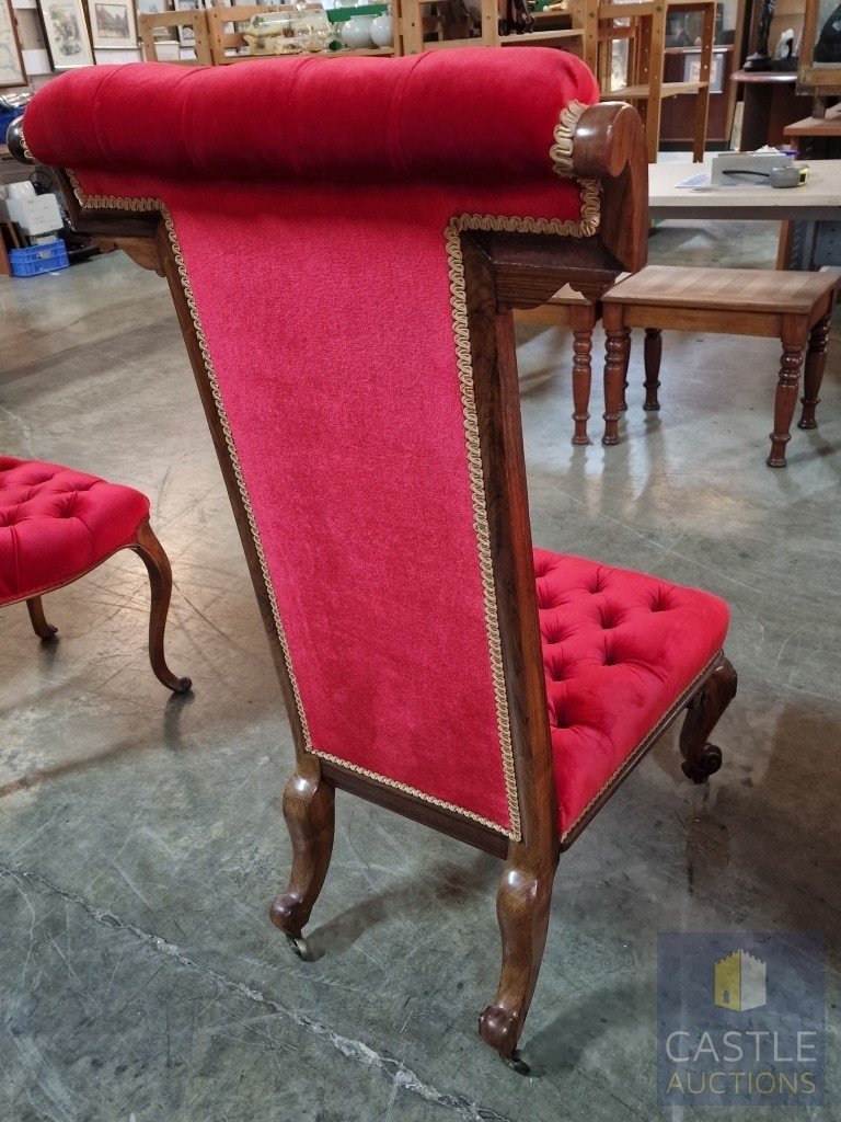 Victorian Style Prayer Chair, Upholstered with Button Back Red Fabric, Carved Wood Surround with Scroll Details and Front Cabriole Legs with Casters