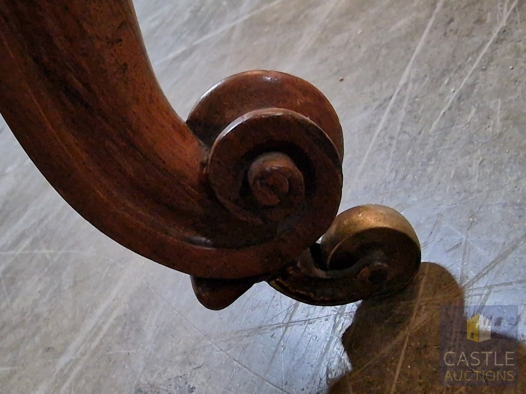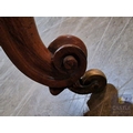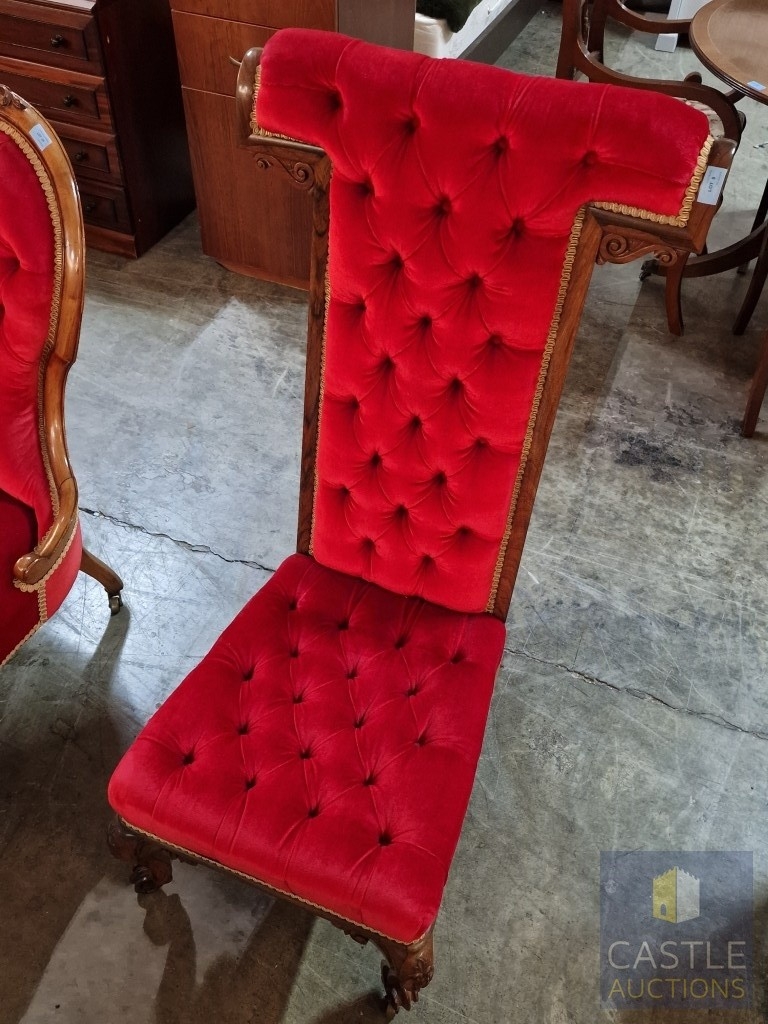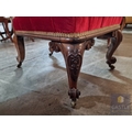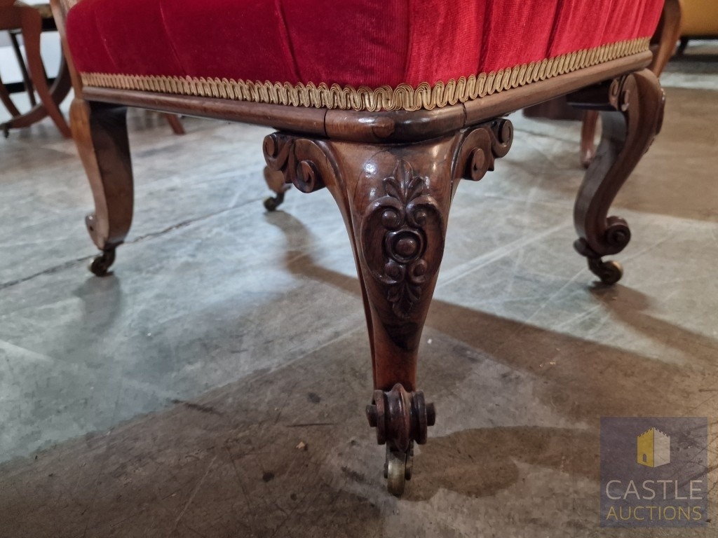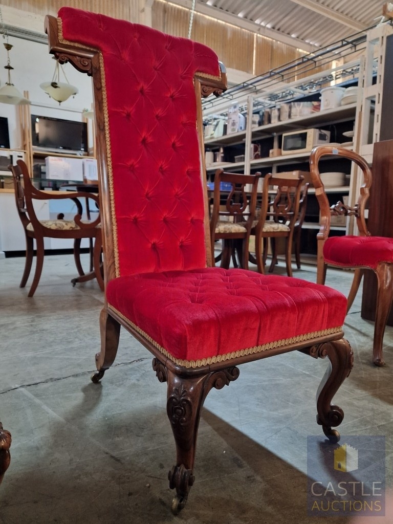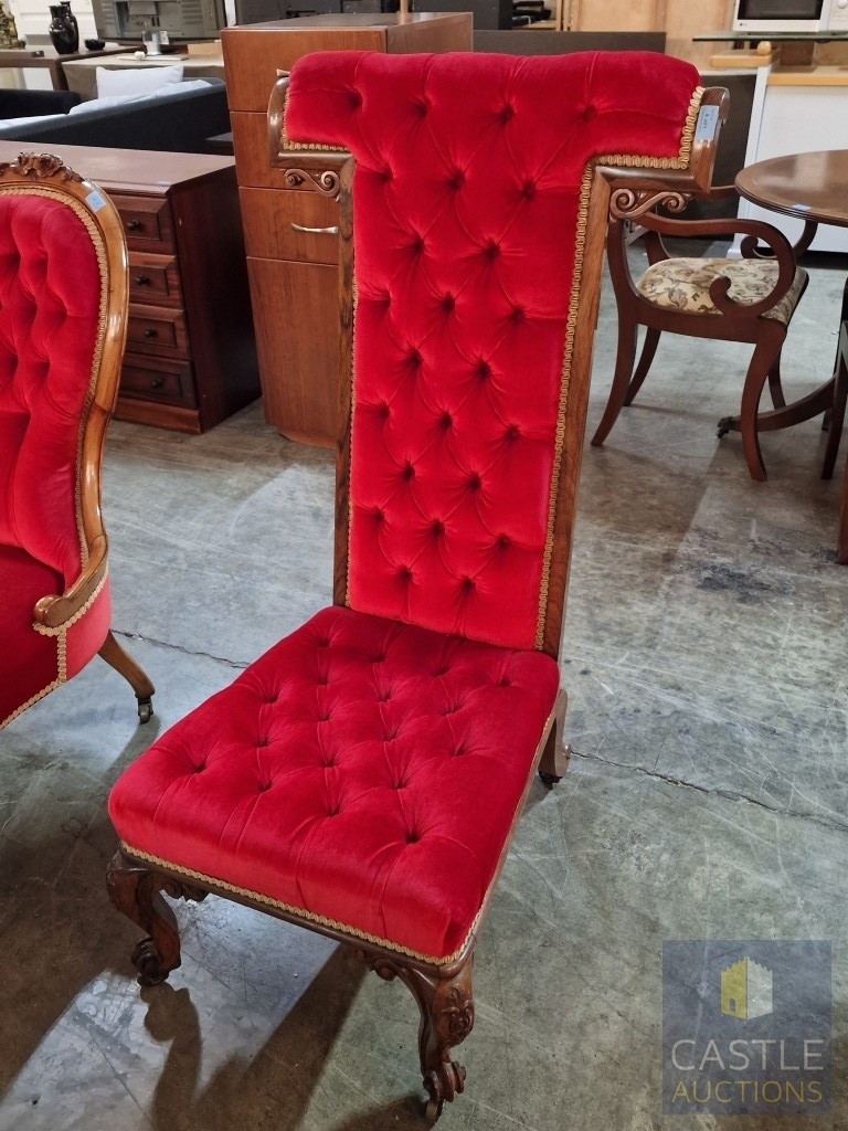 Victorian Style Prayer Chair, Upholstered with Button Back Red Fabric, Carved Wood Surround with Scroll Details and Front Cabriole Legs with Casters