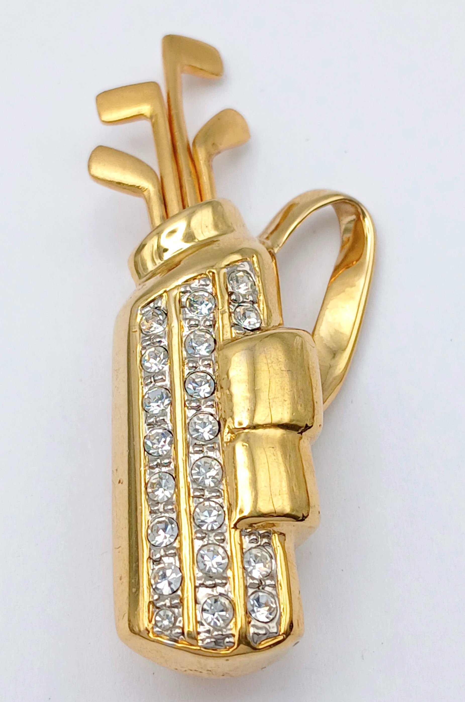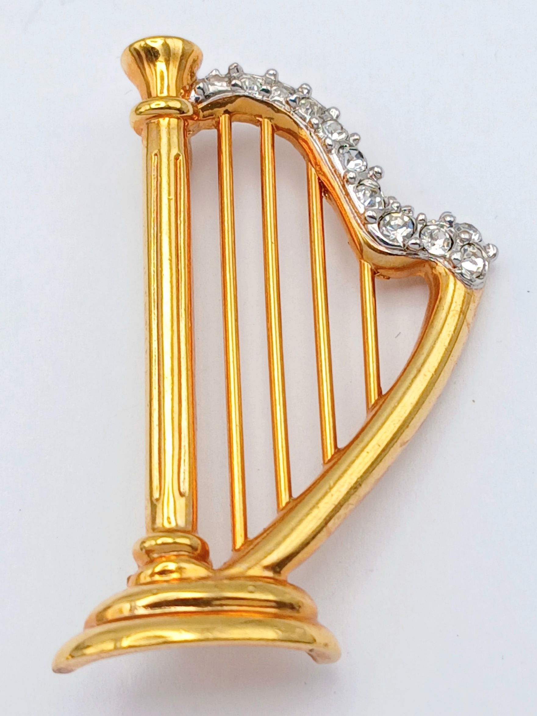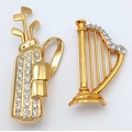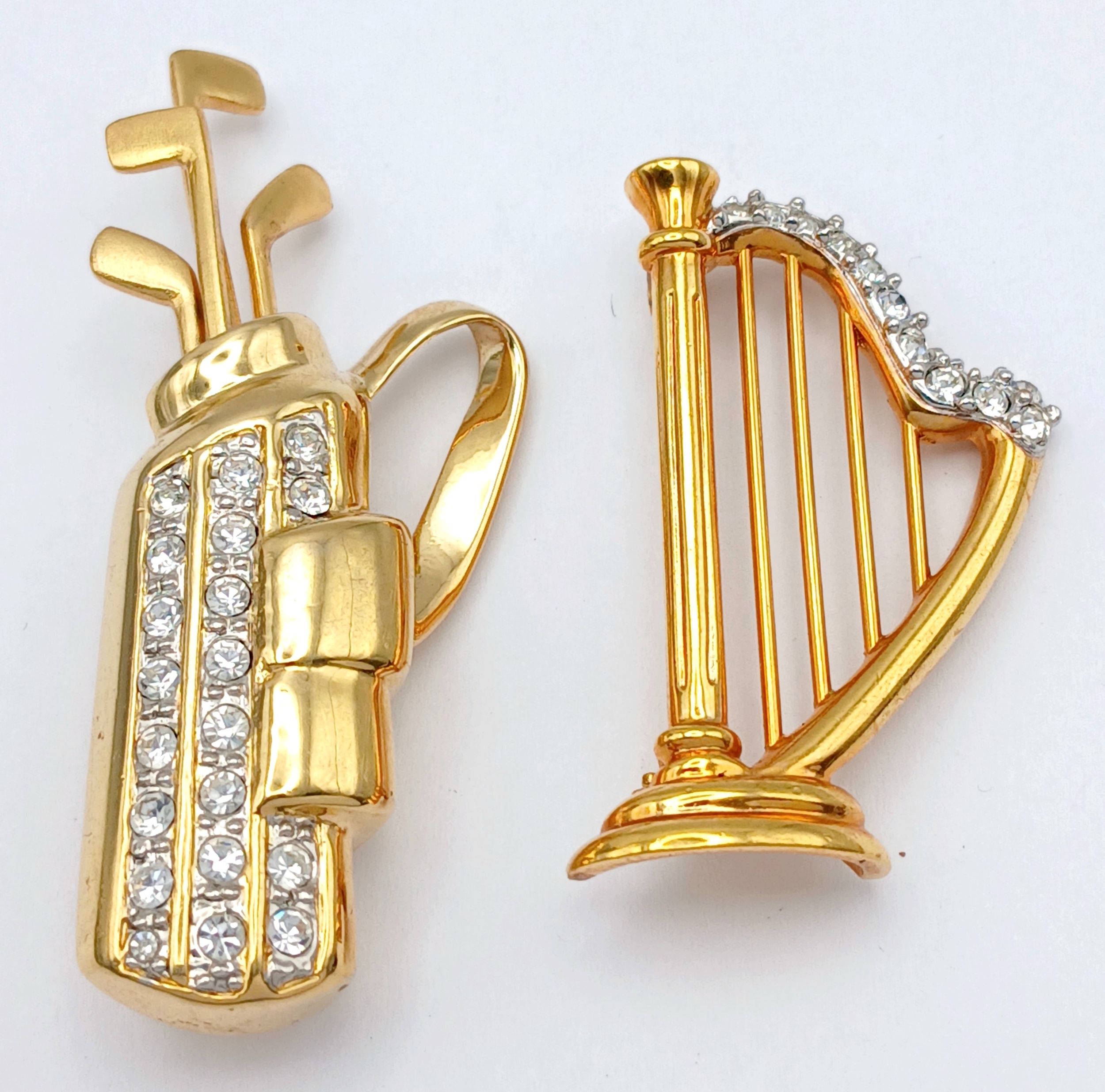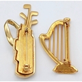 2X large vintage gold-tone stone set golf bag and harp instrument brooches. Total length 4.5 and 6.5 cm