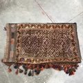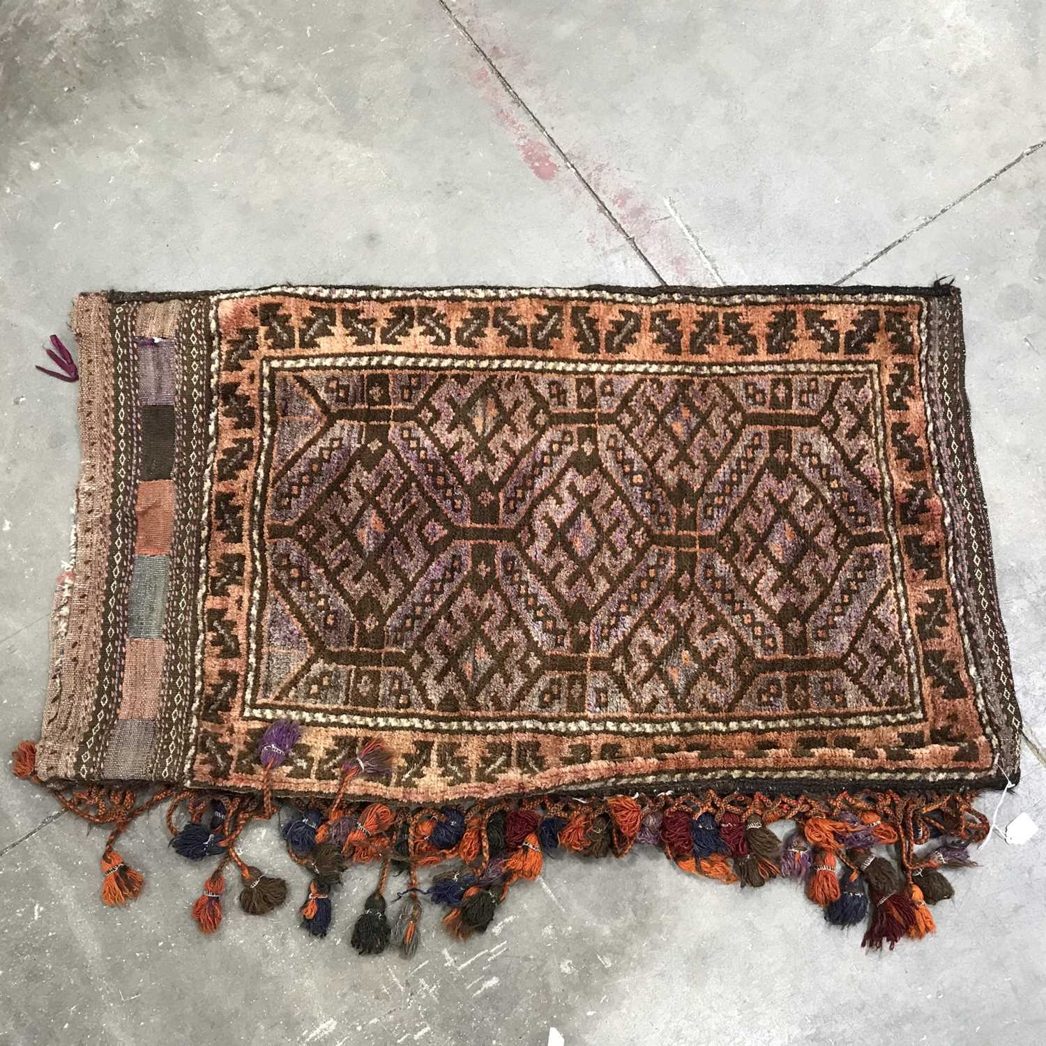 A Kilim tribal carpet bag, tassel fringe, geometric design with leaf border on red ground, 107 by 62cm