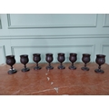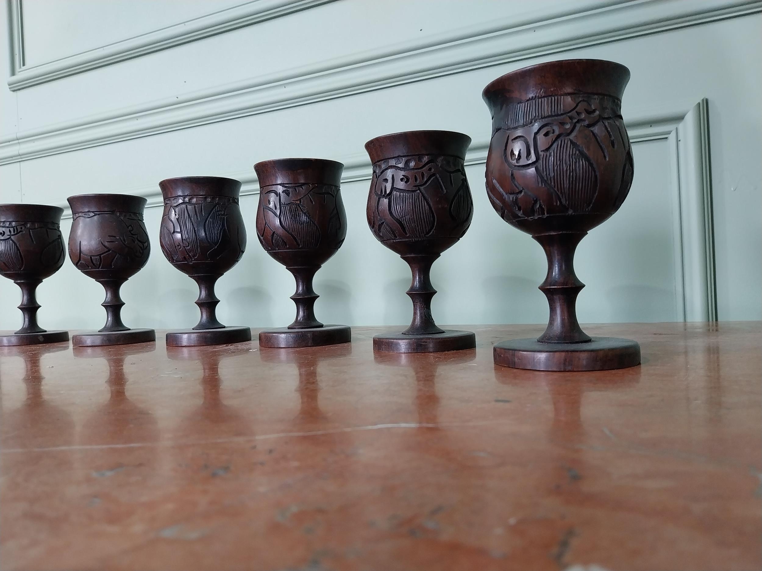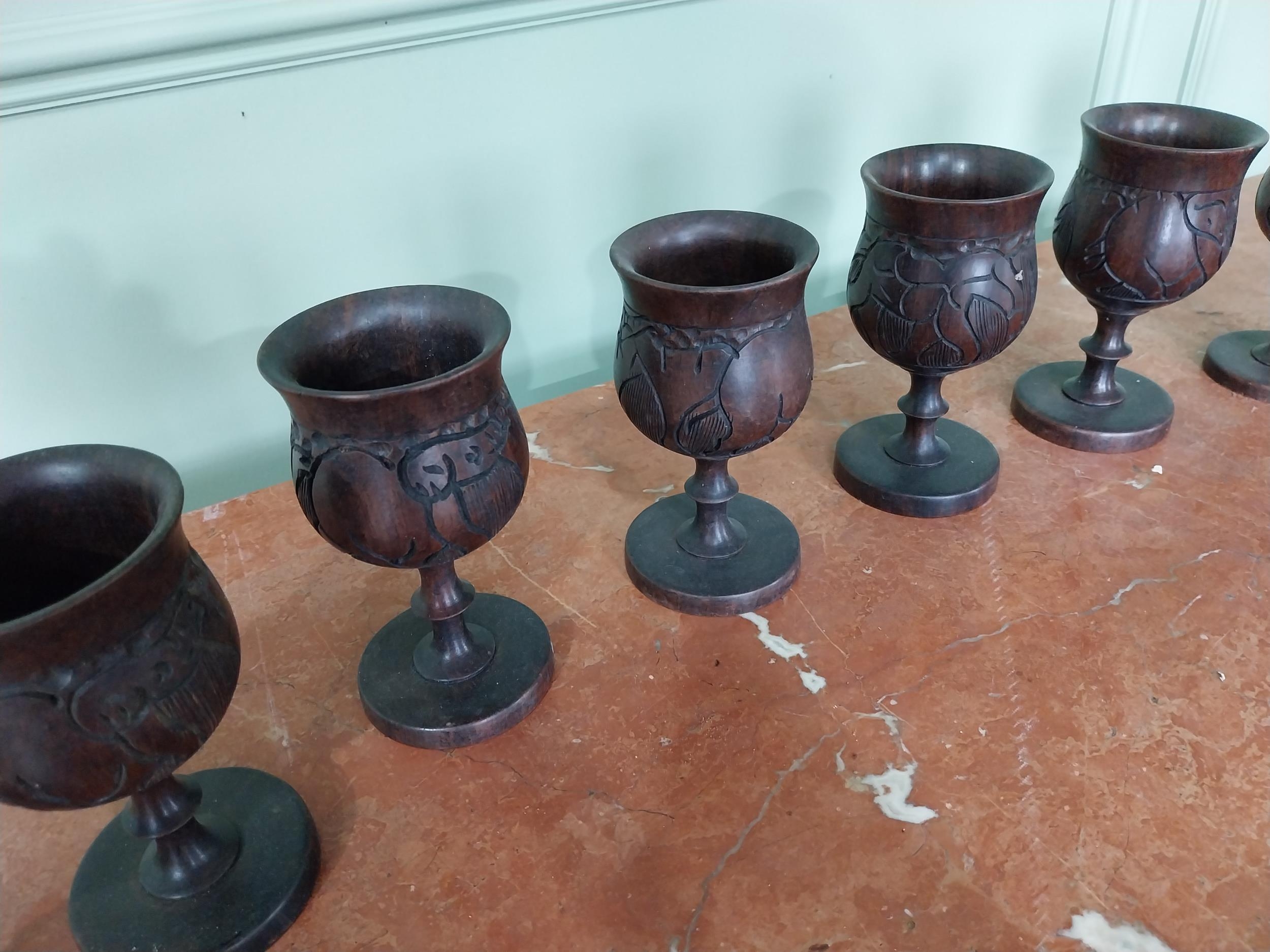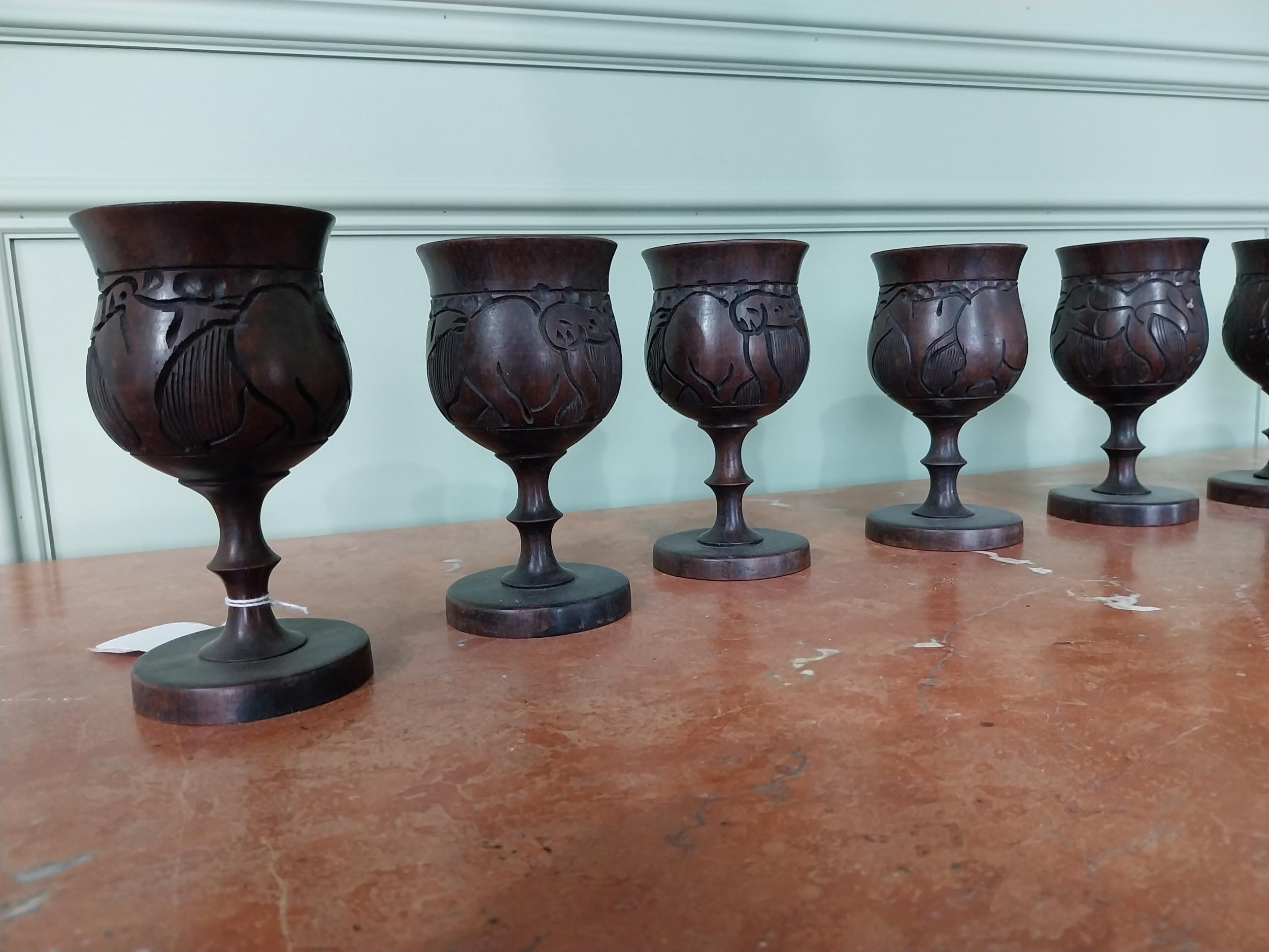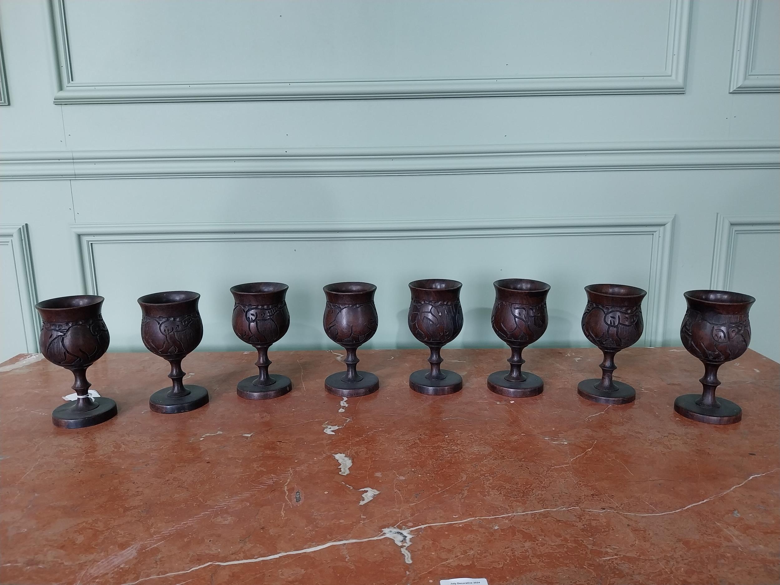 Set of eight carved African hardwood goblets {16 cm H x 8 cm Dia.}.