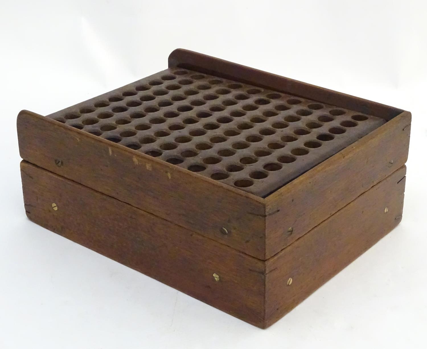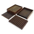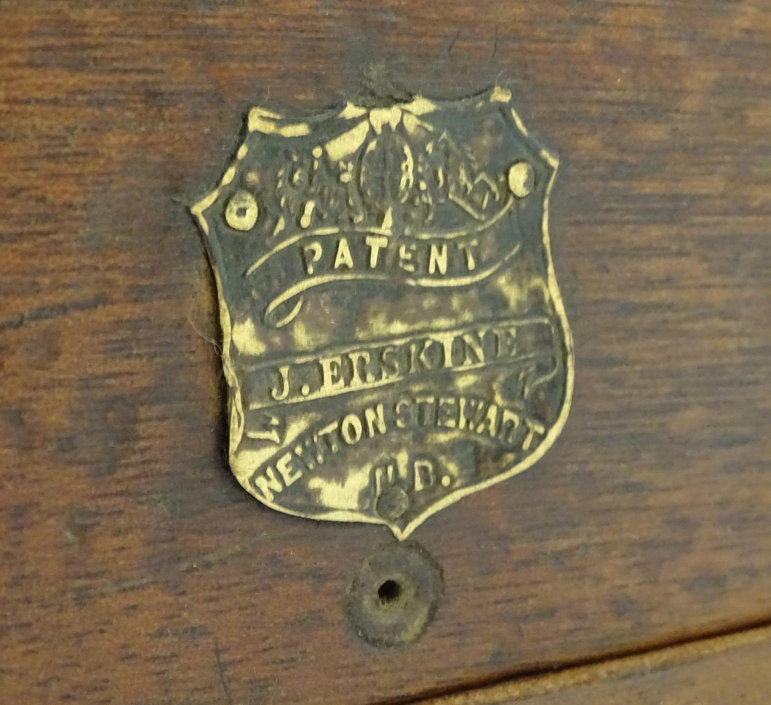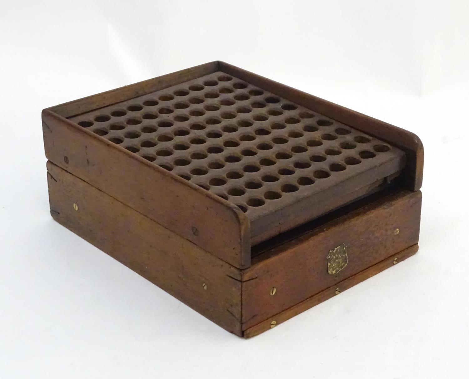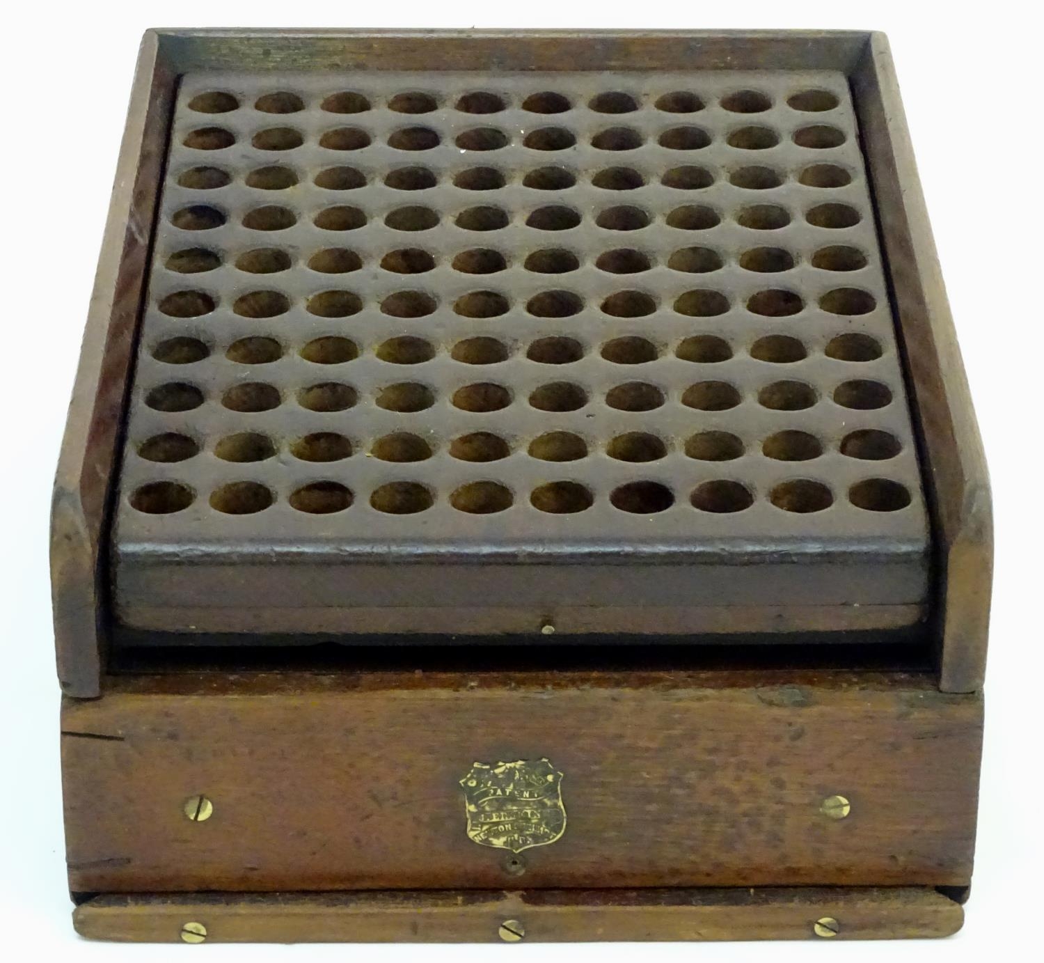 A Victorian mahogany patent cartridge reloading device (12 bore x 100) by J. Erskine, Newton Stewart. 15 1/4" long, 11 1/2" wide, 6" tall