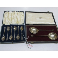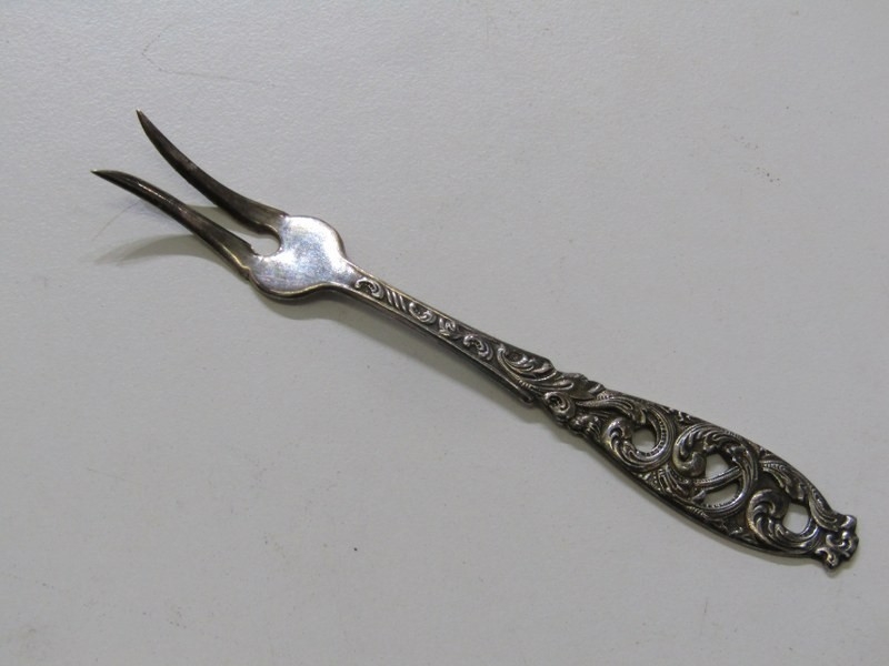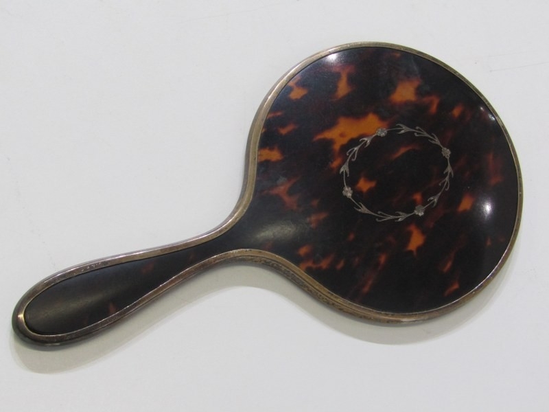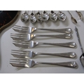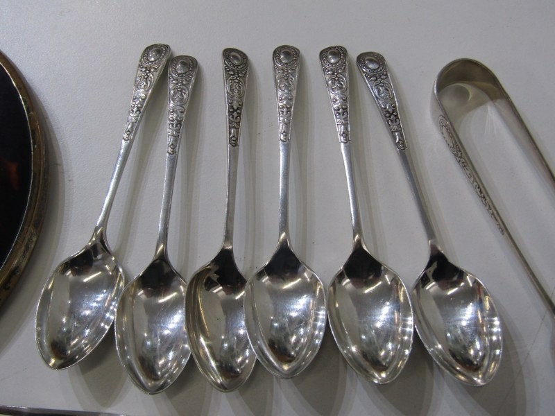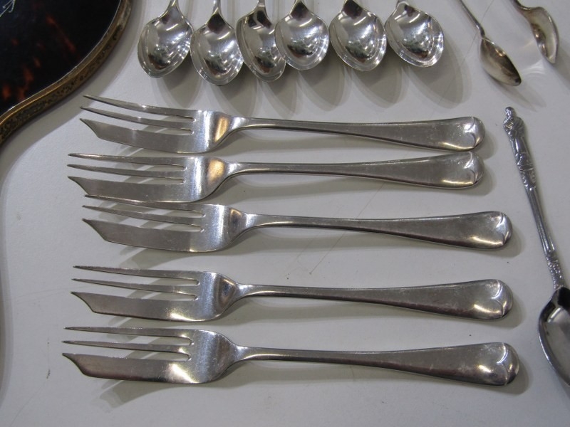 SILVER CUTLERY, assortment of silver spoons and tongs, weighable 96 grams, together with a silver and tortoiseshell hand mirror, 5 plated pastry forks and a silver plated Apostle spoon