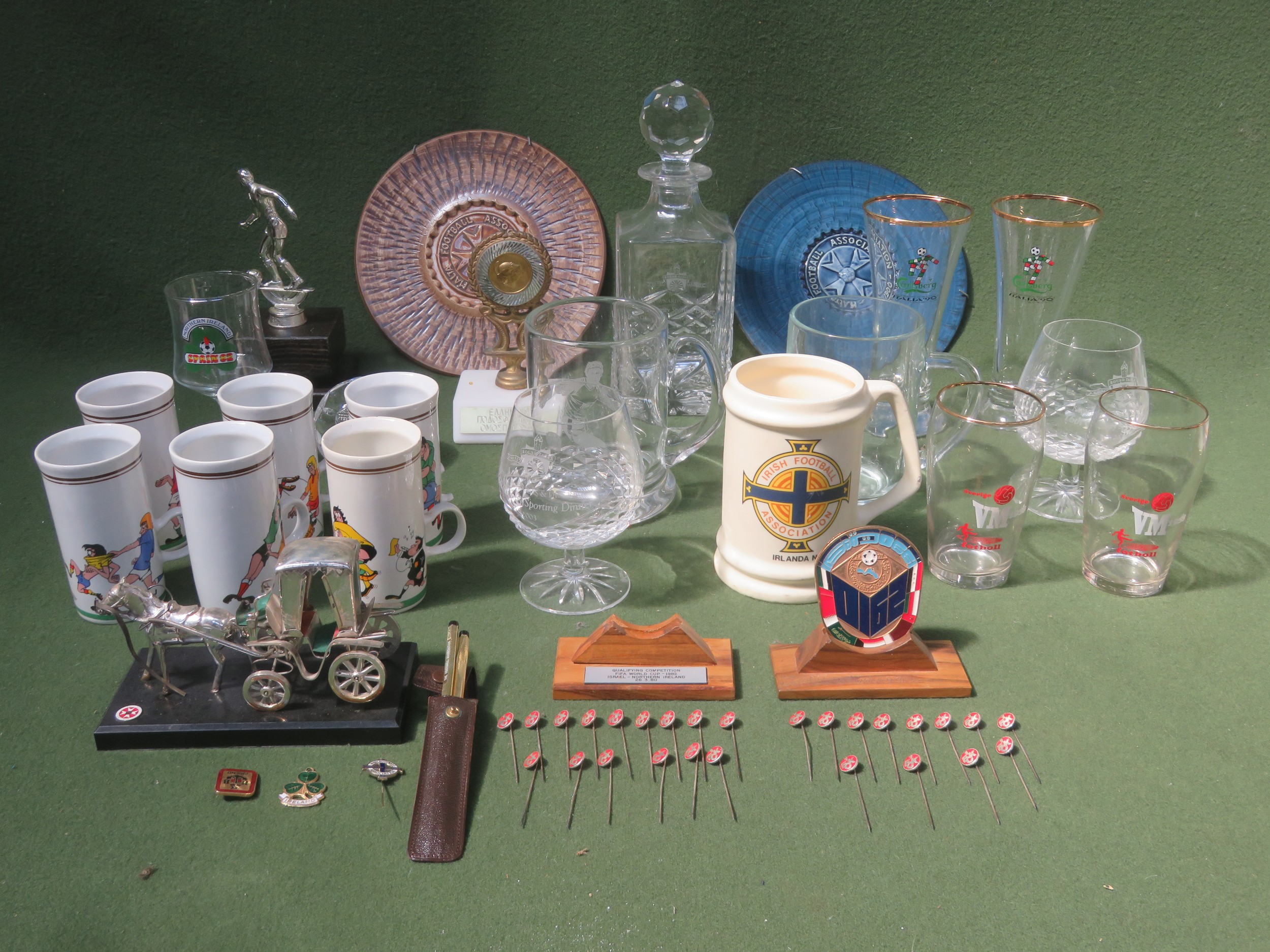 Mixed lot of various football related items including ceramics, tiepins, glass, trophies etc, some relating to football associations including England, Ireland, Malta etc