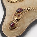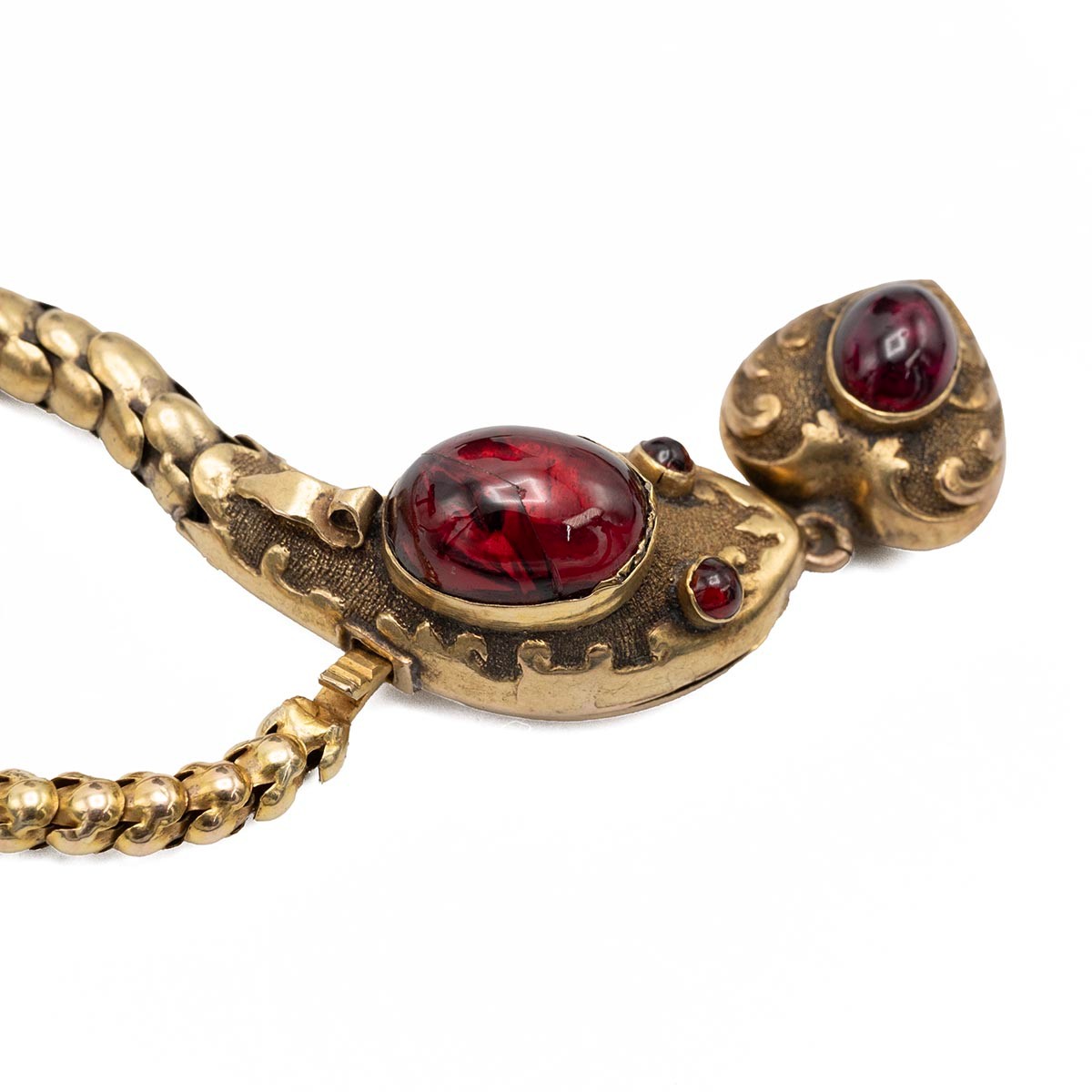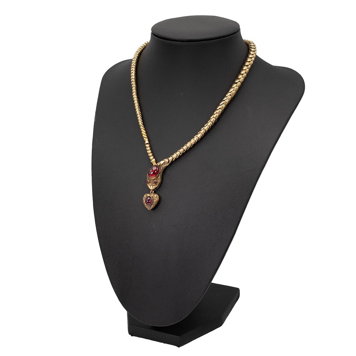 A finely detailed Victorian 15ct gold serpent articulated necklace, set with a garnet cabochon to the head and eyes, with a heart shaped mourning locket with garnet attached to its mouth. In original tooled leather fitted case. L40cm, weight 16.6 grams.
