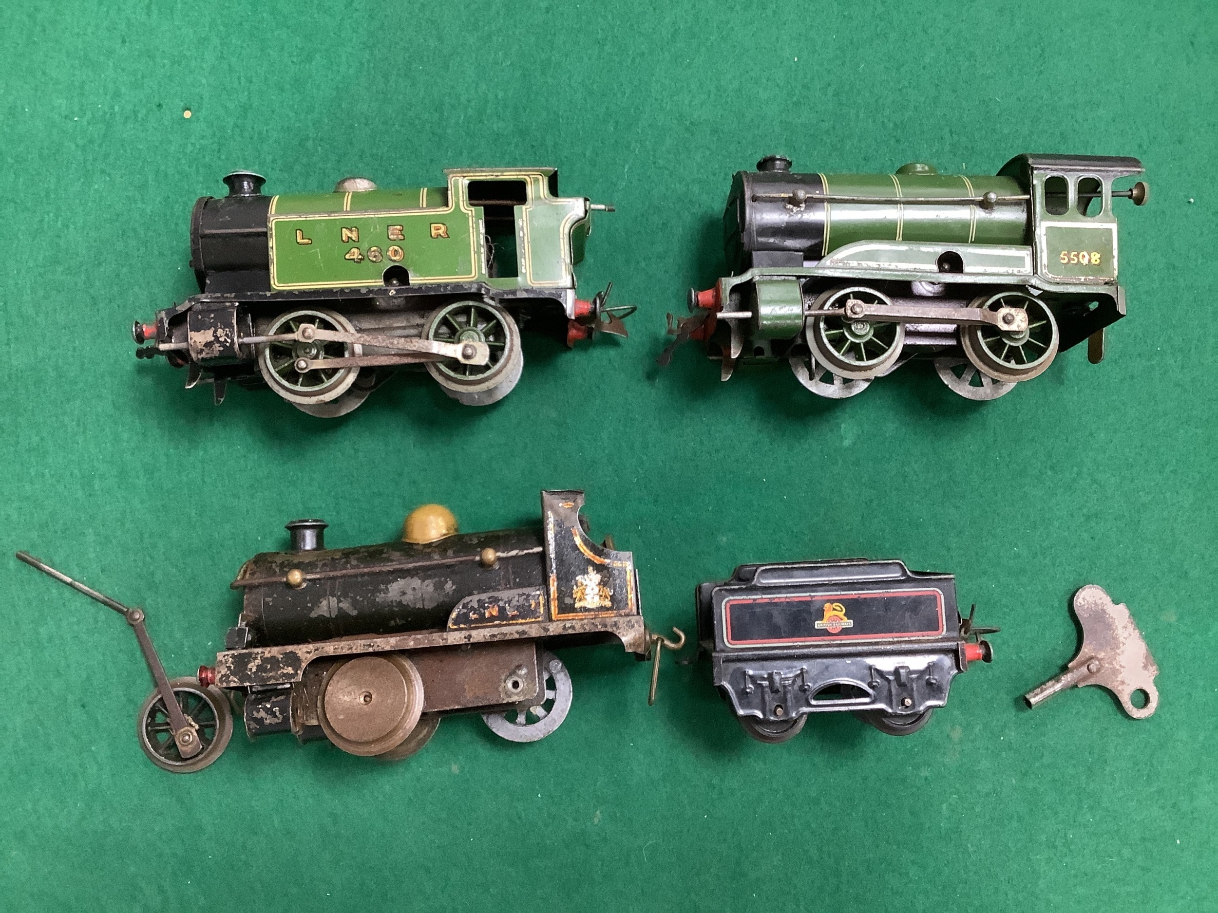 Three Hornby 'O' Gauge Clockwork 0-4-0 Locomotive, 1920's No 1 spares, repair, a 1930's 0-4-0 LNER missing tender and a post-war 0-4-0 LNER, plus a spare post-war tender, all playworn.