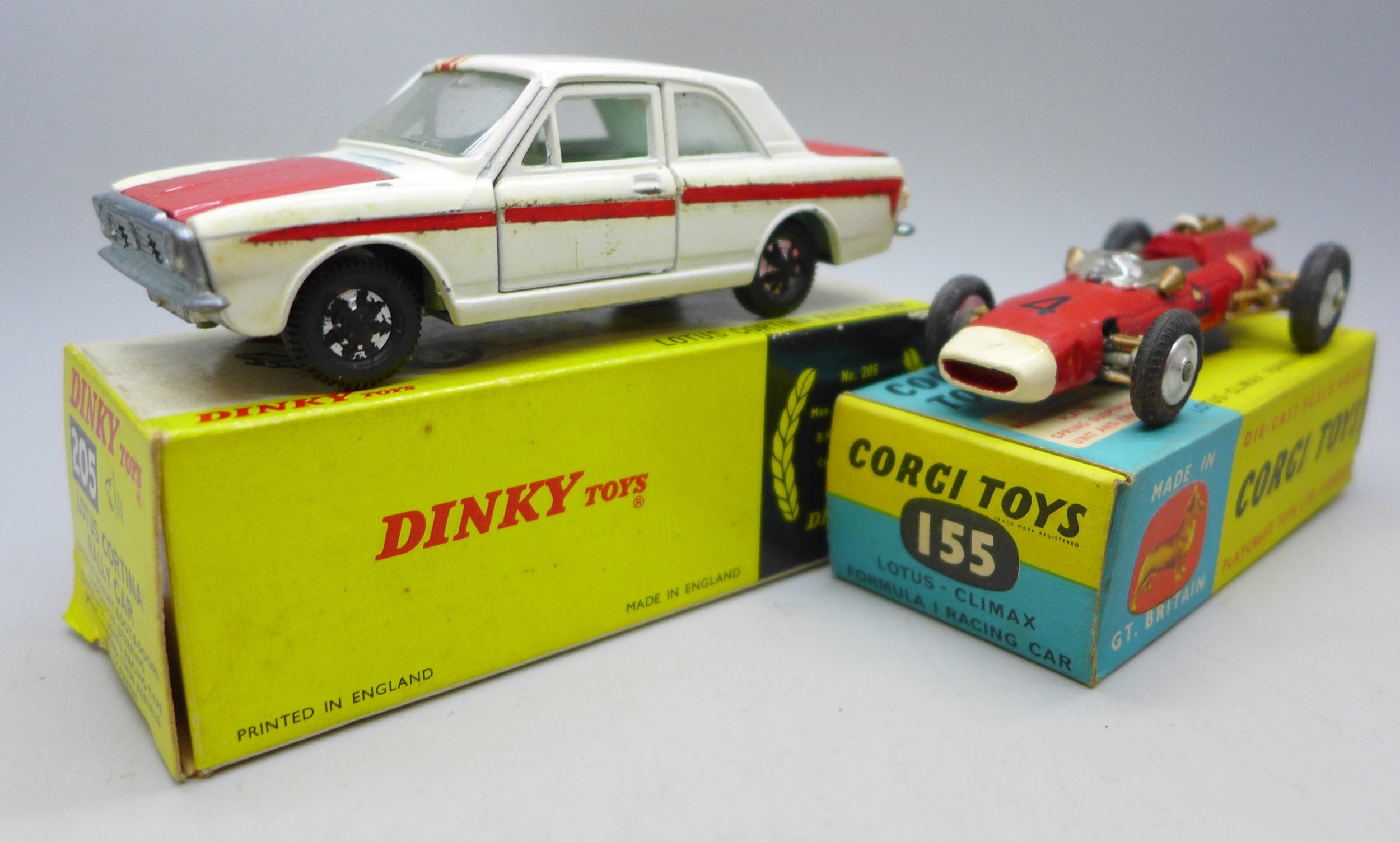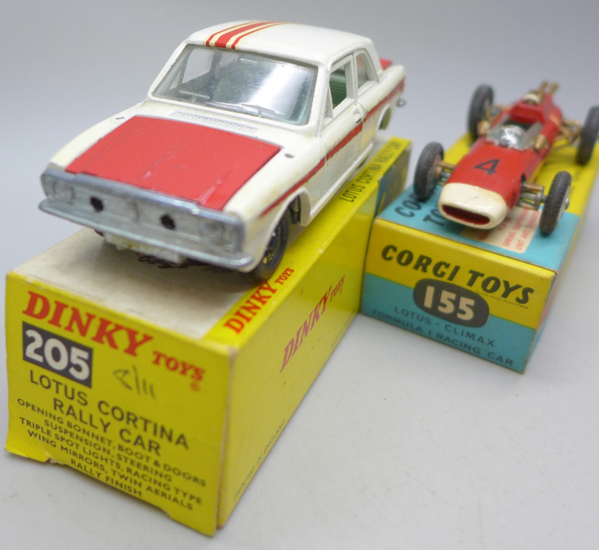A Corgi Toys 155 Lotus-Climax Formula 1 Racing Car and a Dinky Toys 205 Lotus Cortina Rally Car, boxed