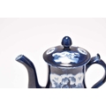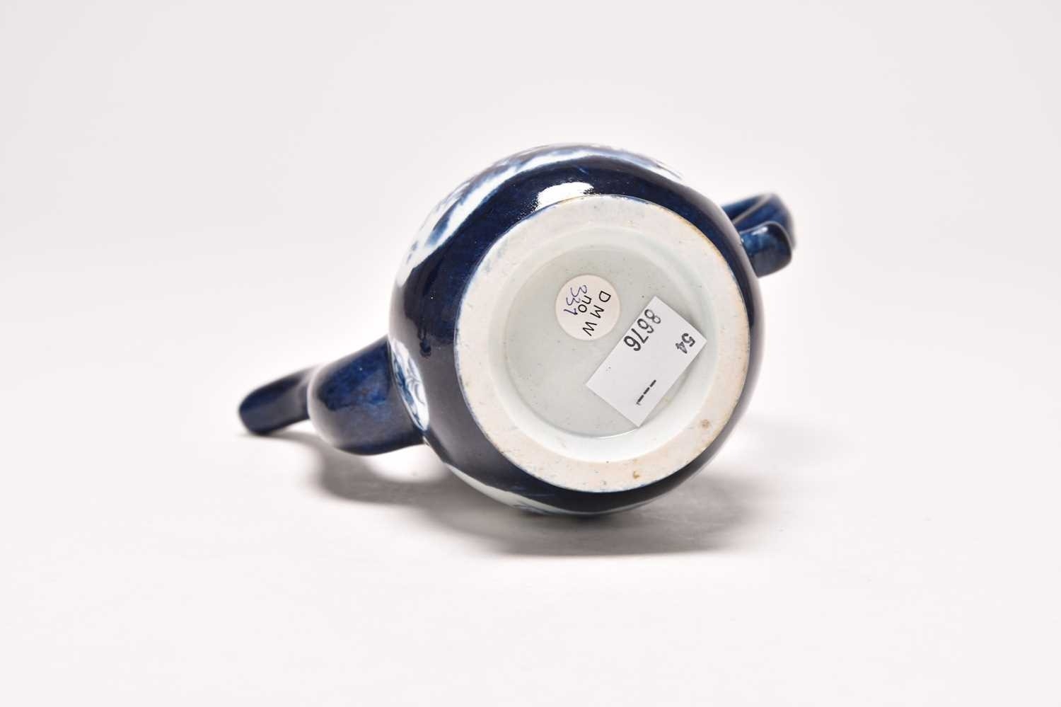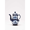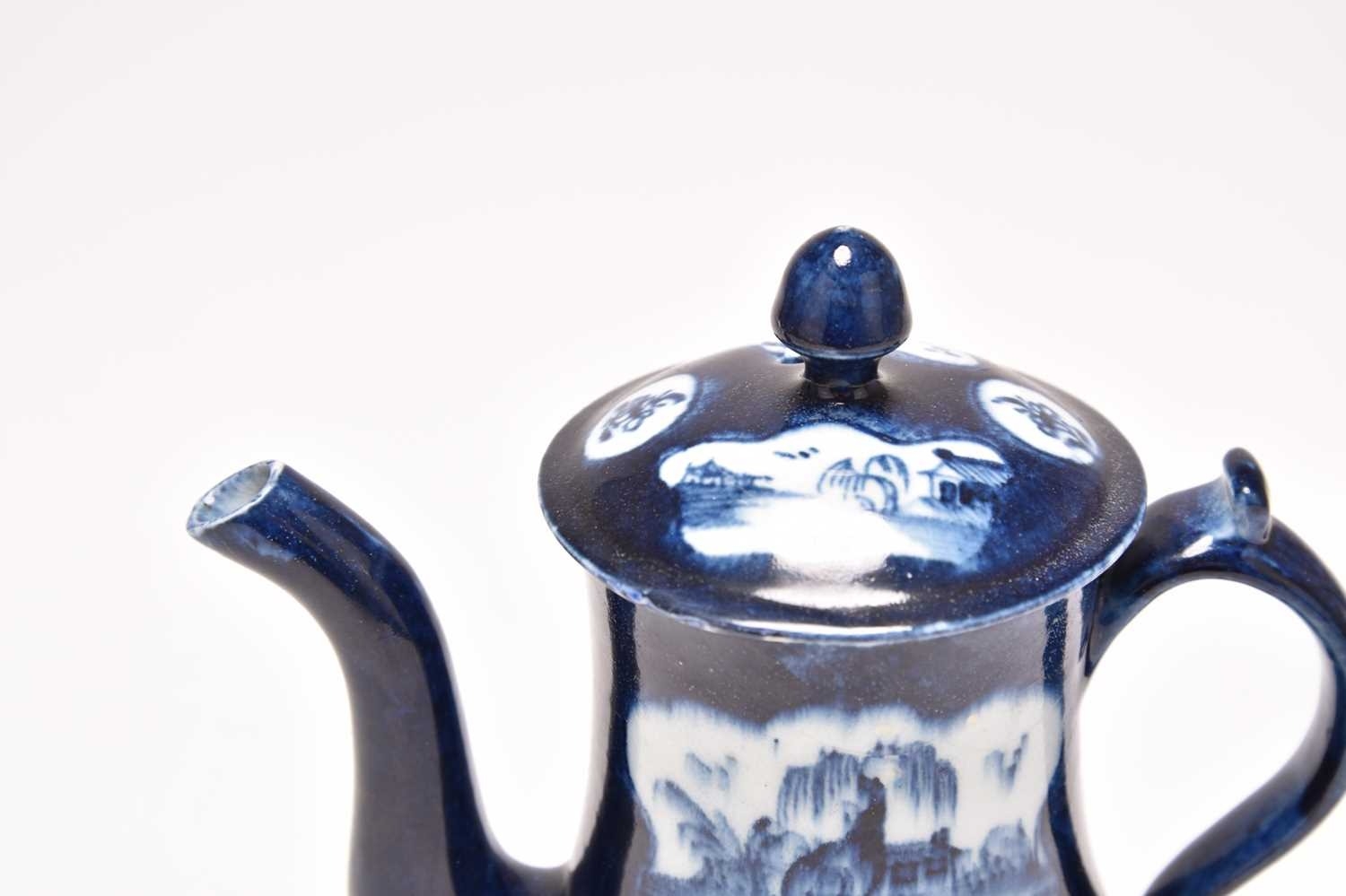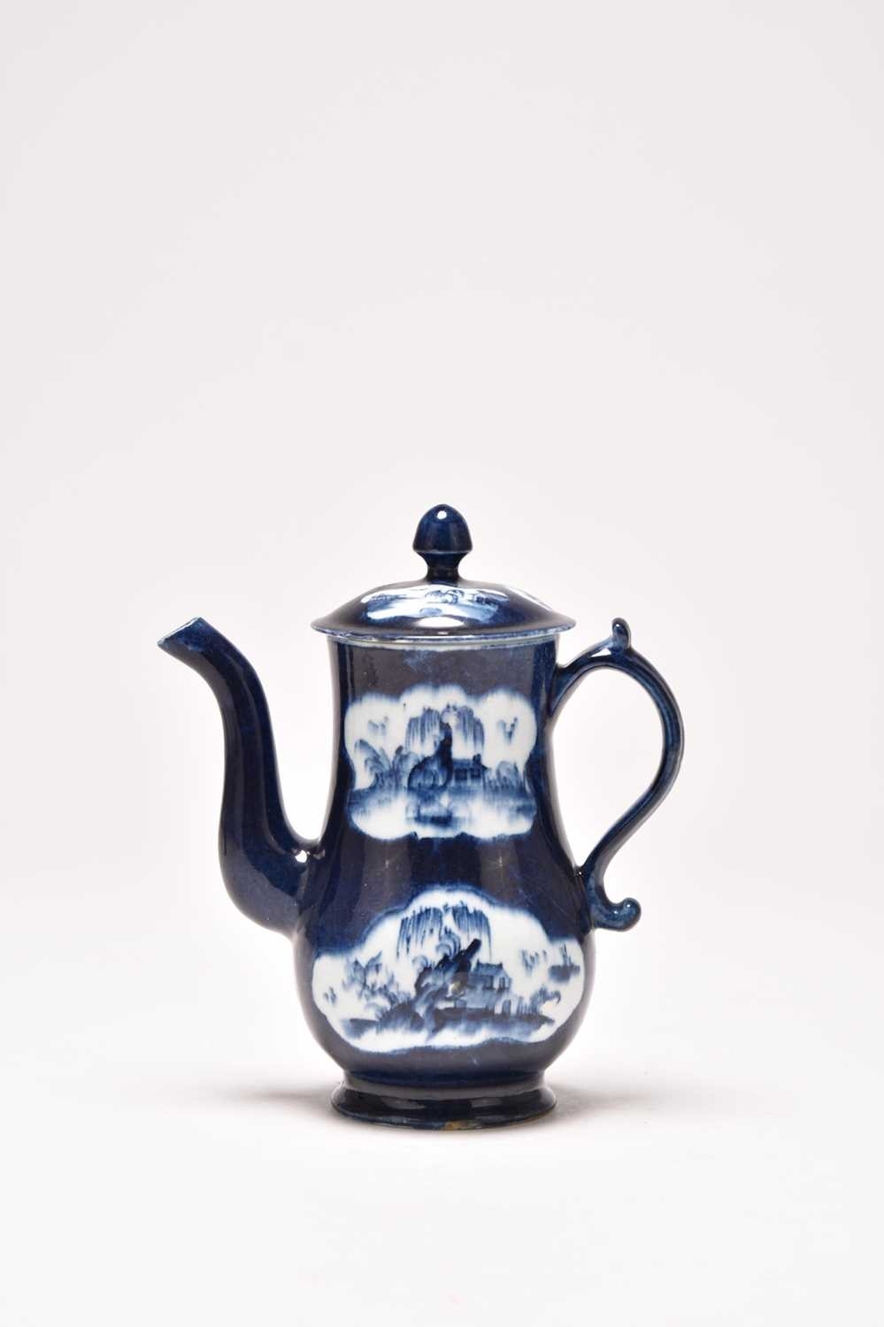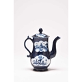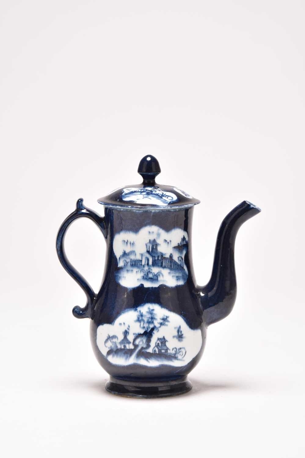 A Lowestoft powder blue coffee pot and cover, circa 1765, of baluster form with scrolling handle and spout, the cover with mushroom finial, painted in underglaze blue to both sides with chinoiserie landscapes including trees and houses, with smaller panels to the cover, reserved against a powder blue ground, ummarked, 19cm high (restored) Provenance: David Waterhouse Collection. DMW no. 337. Condition:Cover with restored rim chip. Further sections of restoration to rim of pot (removed and repair of old stapled repairs), with descending hairline to the body.