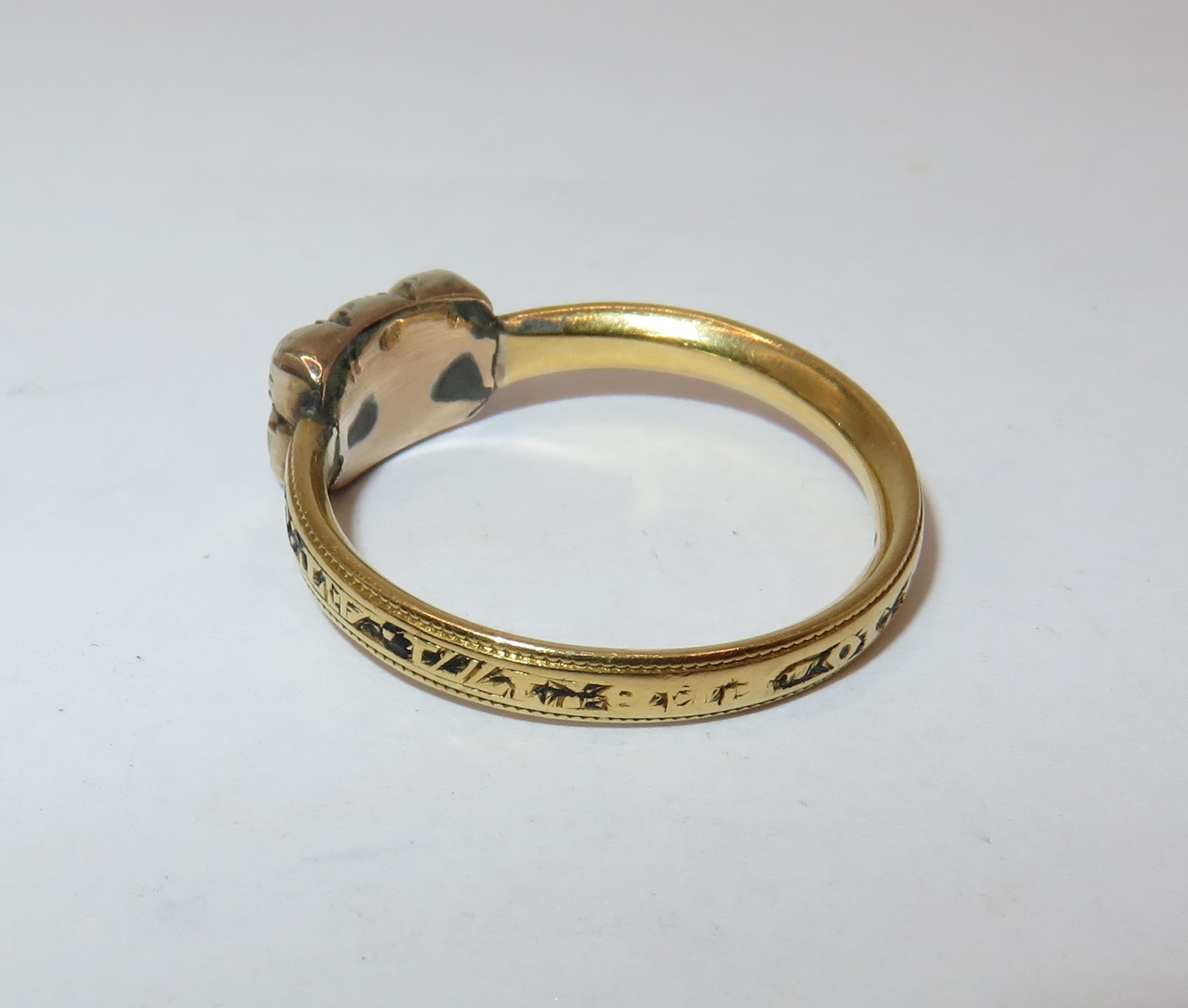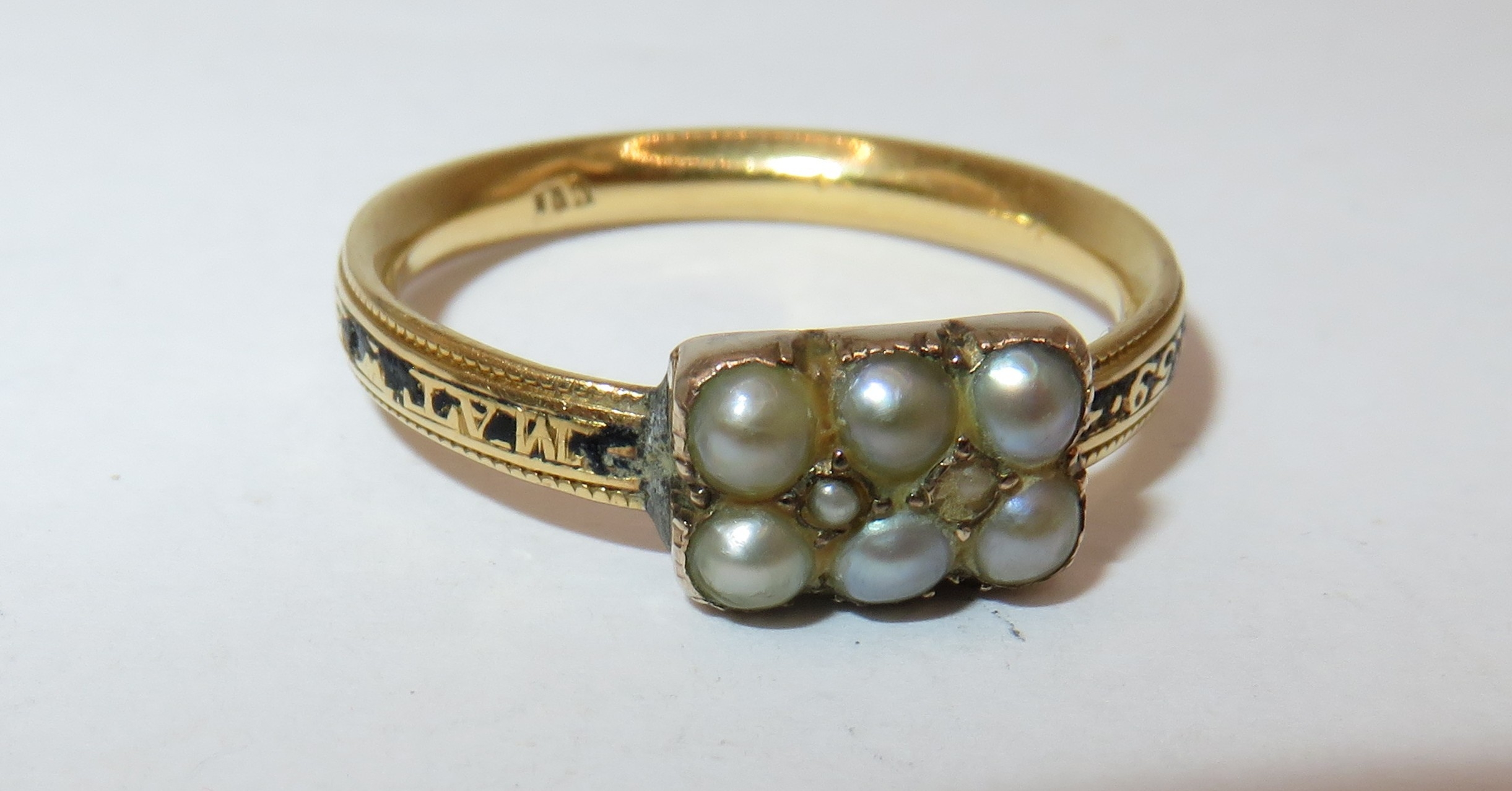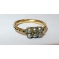 Antique high carat memorial ring set six split pearls, size O, 3.6g