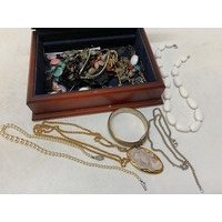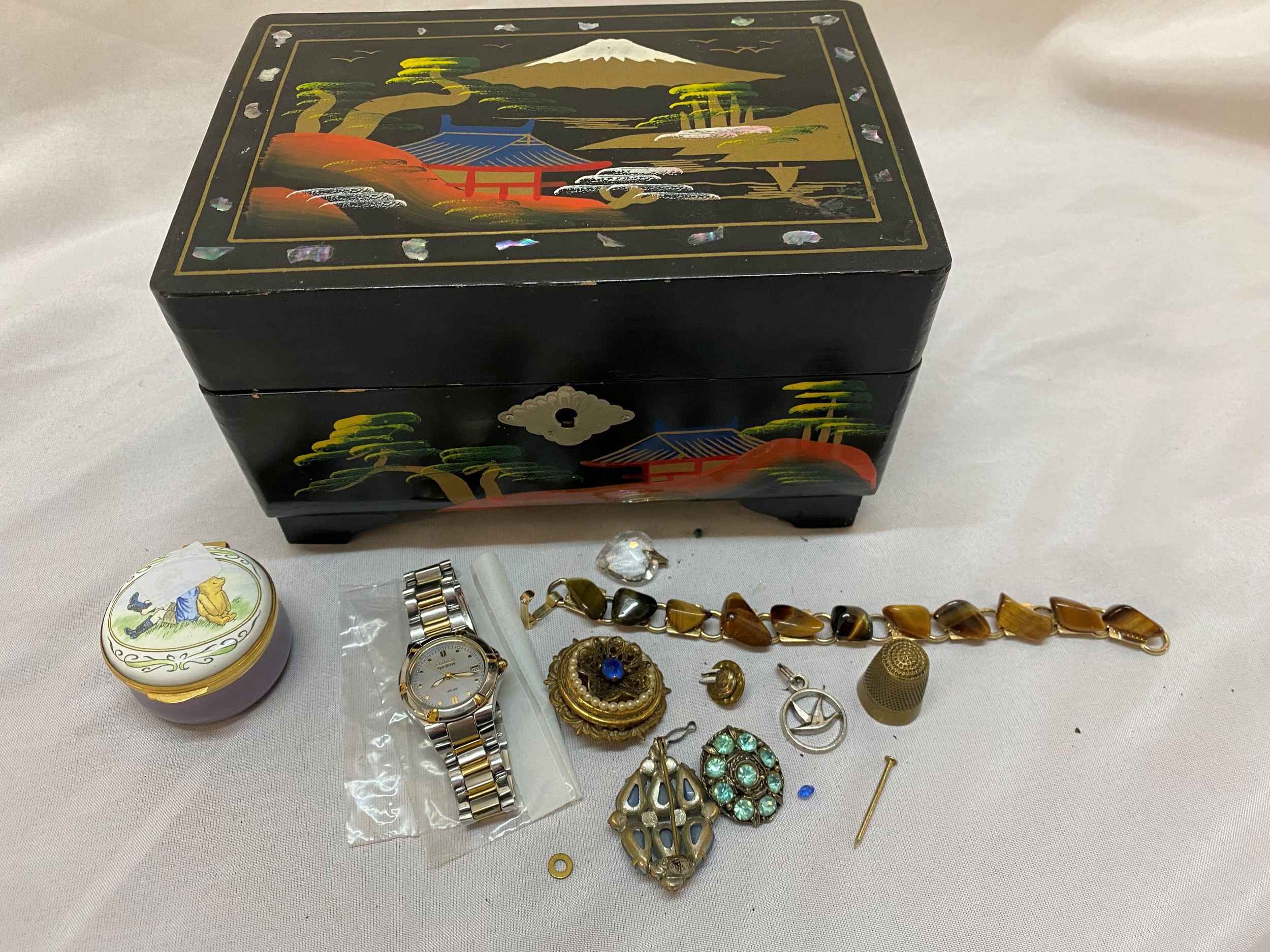 A Japanese jewellery box containing a lady's Citizen Eco-Drive WR100 wristwatch, a Crummles enamel trinket box, the lid depicting Winnie The Pooh and Christopher Robin, an enamel thimble etc..