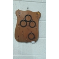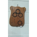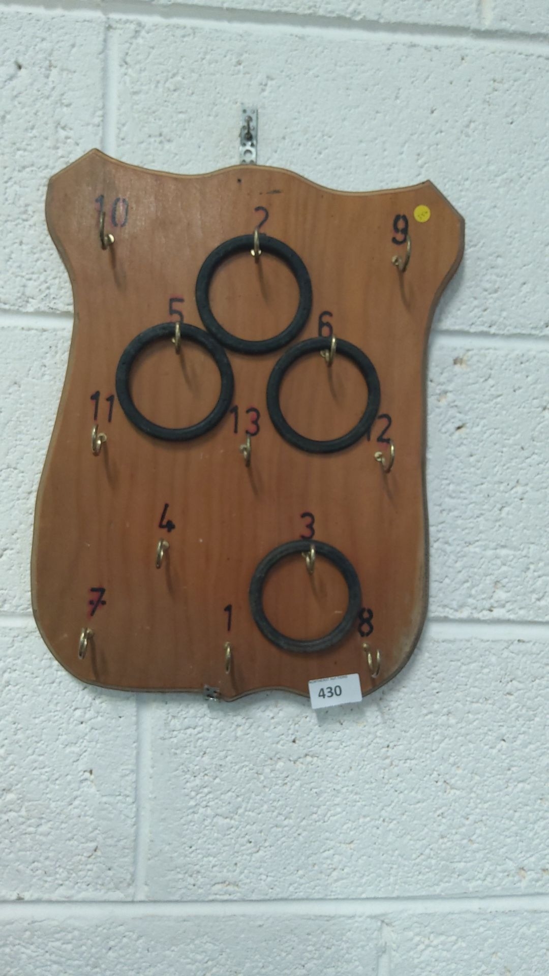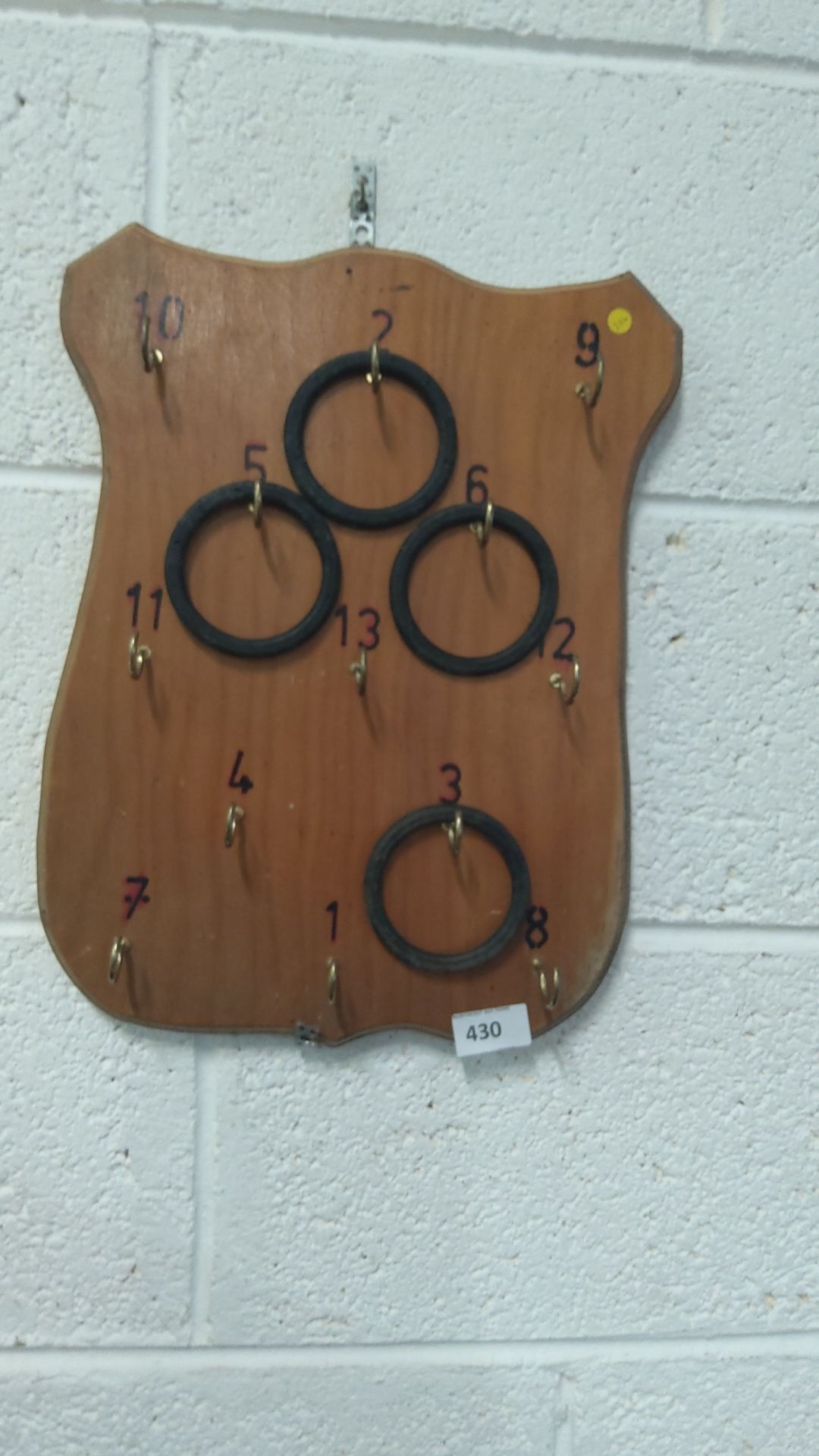 Vintage wooden ring toss game board with numbered hooks and rubber rings.