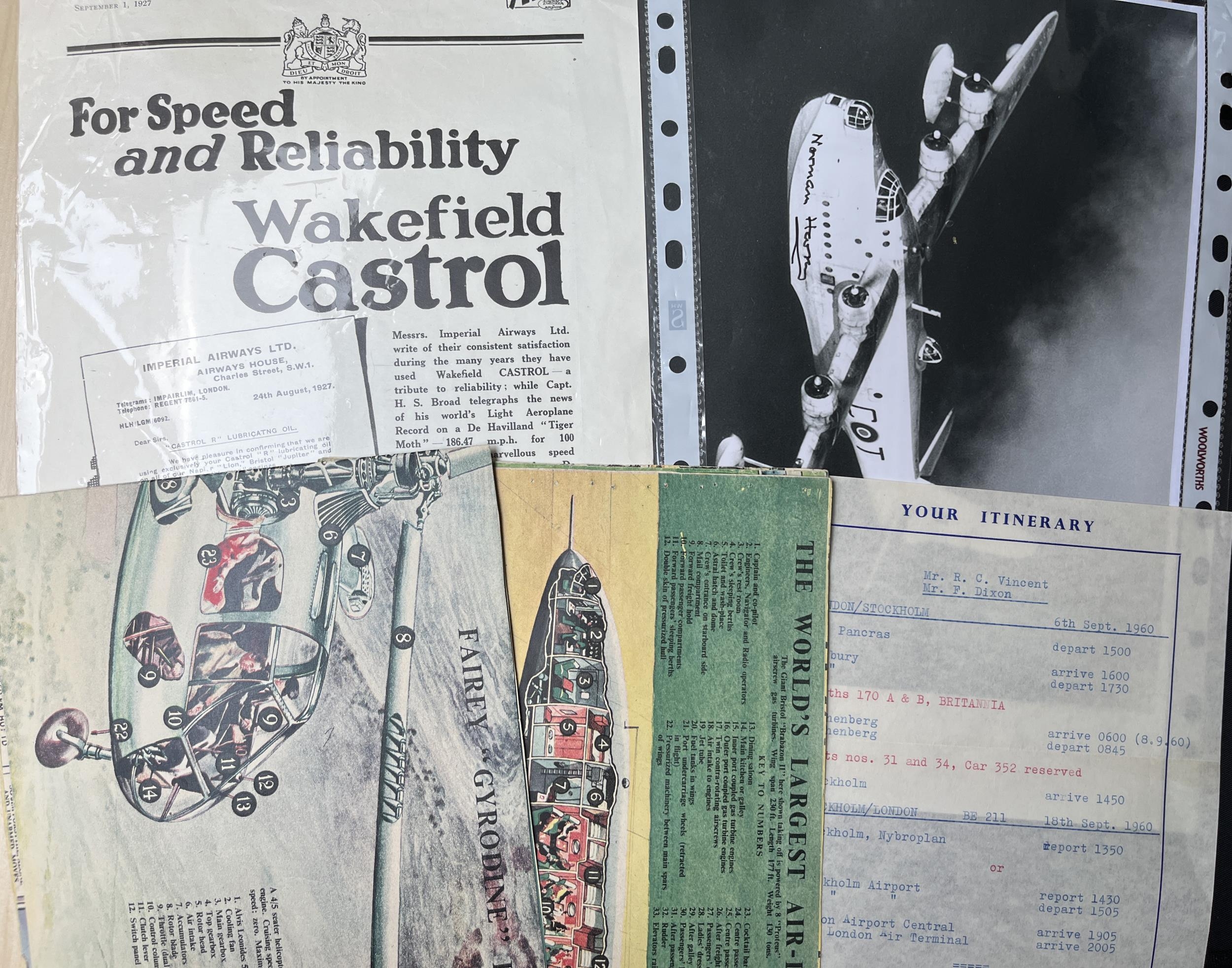 A small group of Aviation related material, including pilot signed picture and flight itinerary.