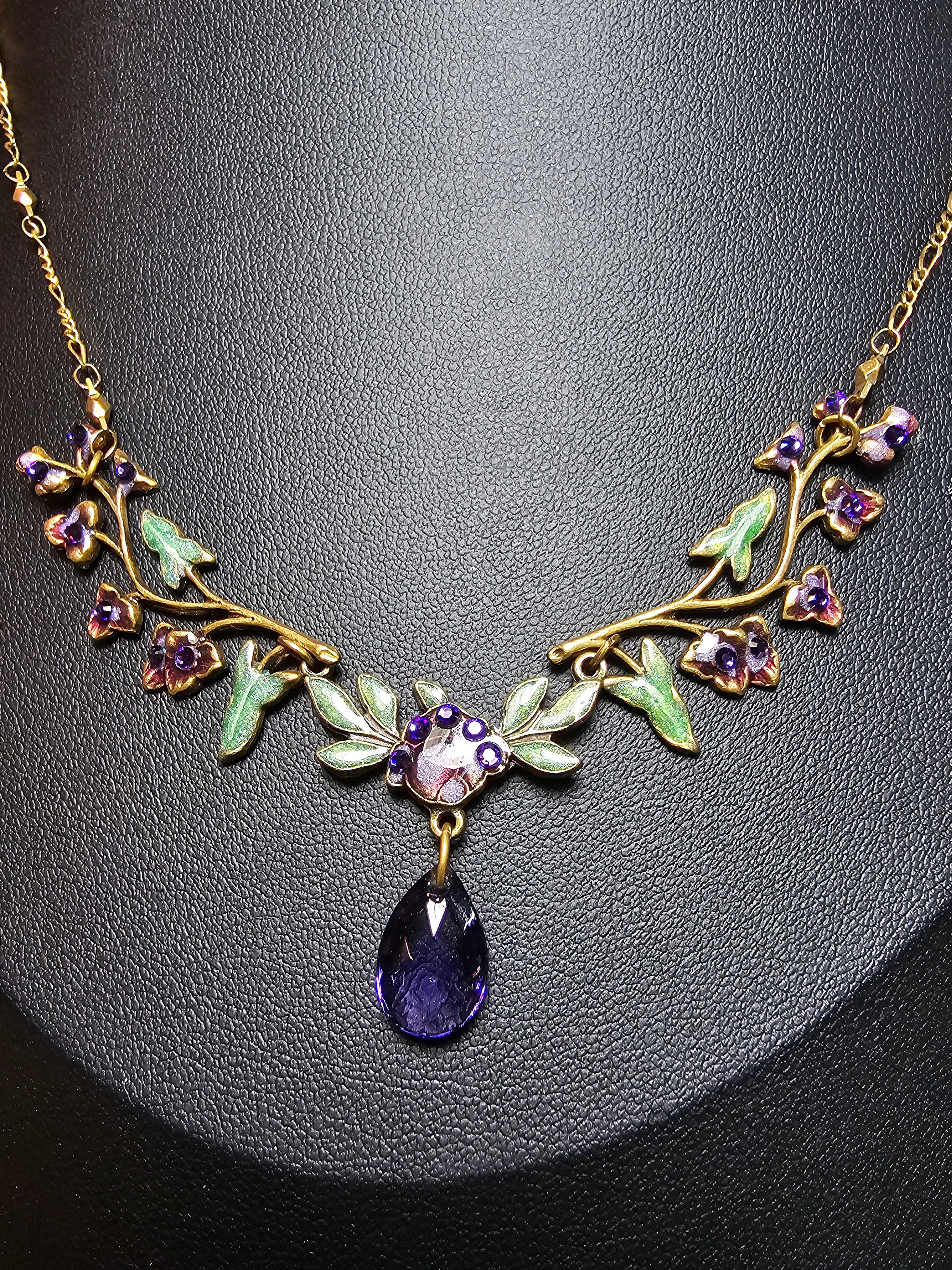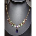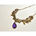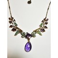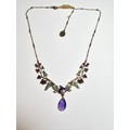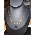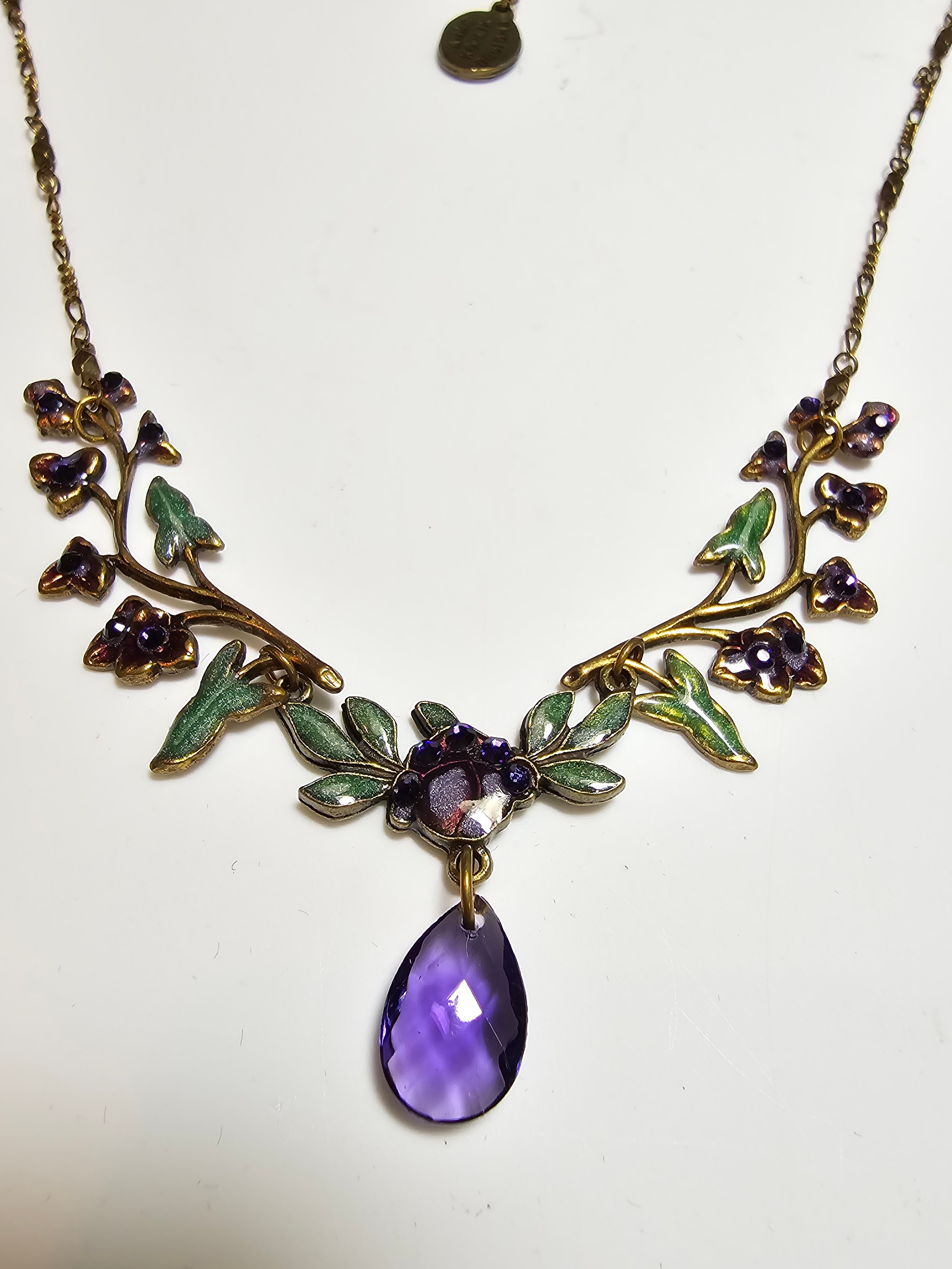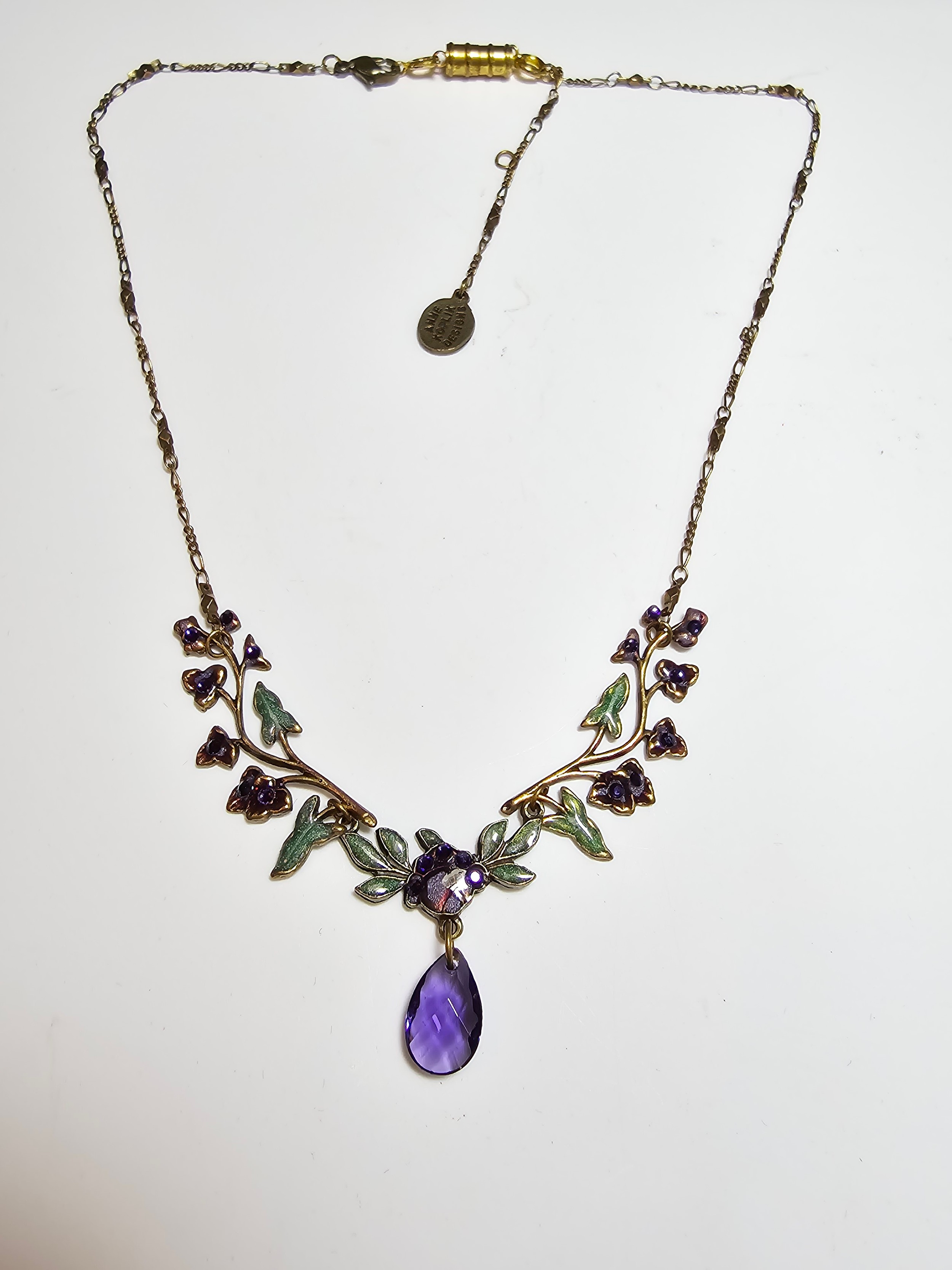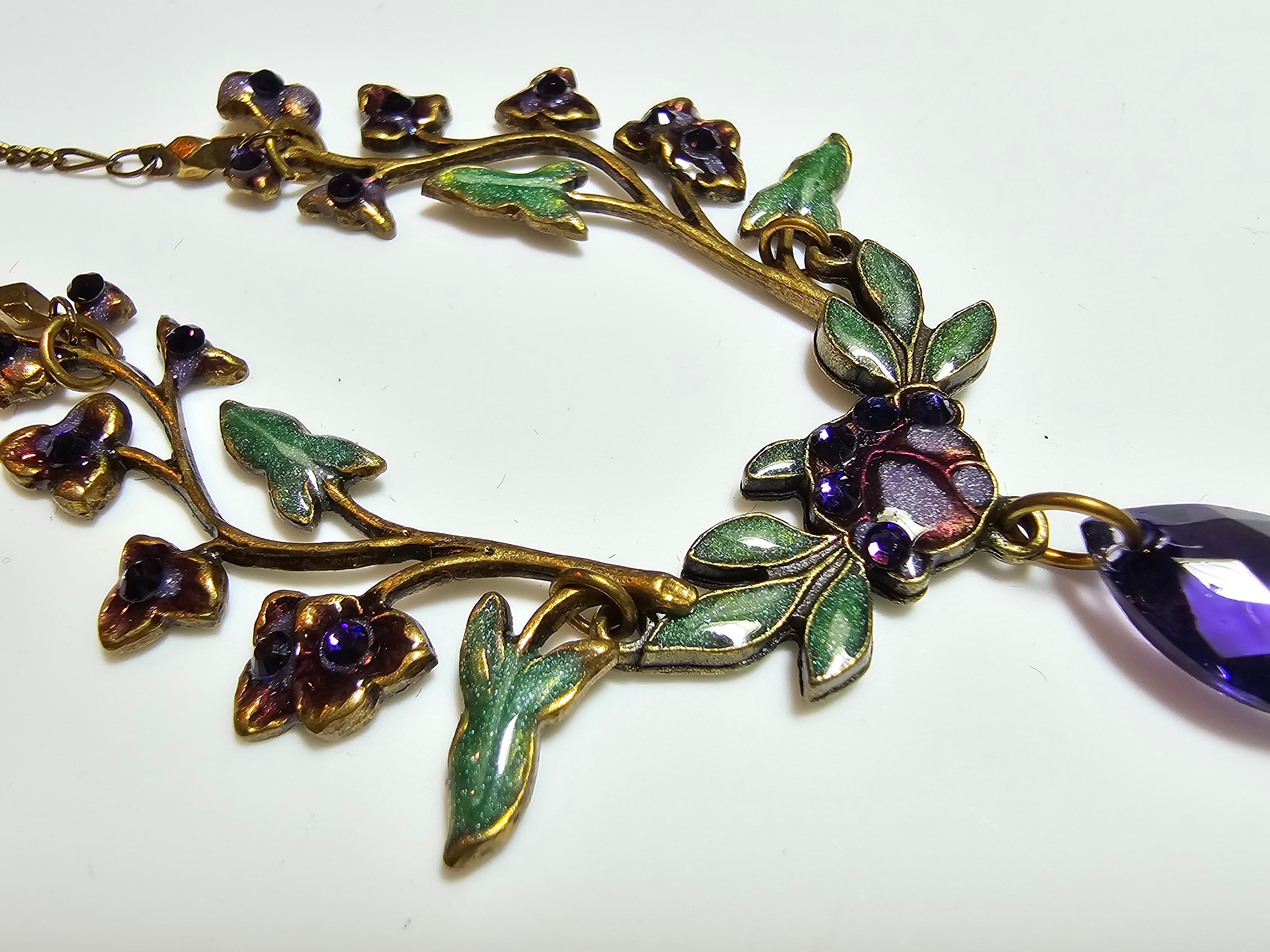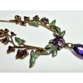 A very pretty vintage necklace by Anne Koplik designs made in USA featuring a pretty enamelled floral design inset with purple glass gems and a faceted purple glass drop having a magnetic barrel clasp, in good condition and boxed. Total length of 16.25".
