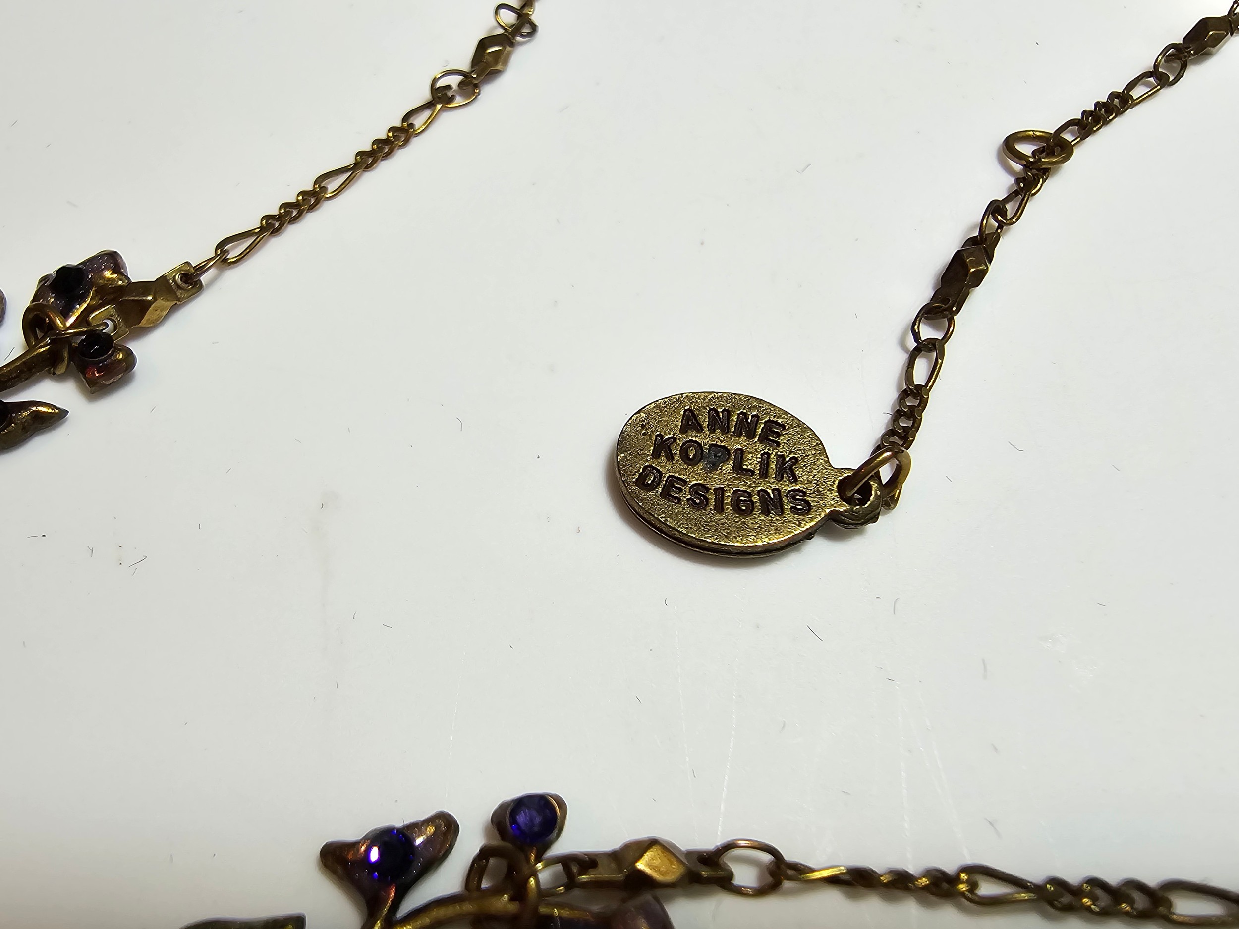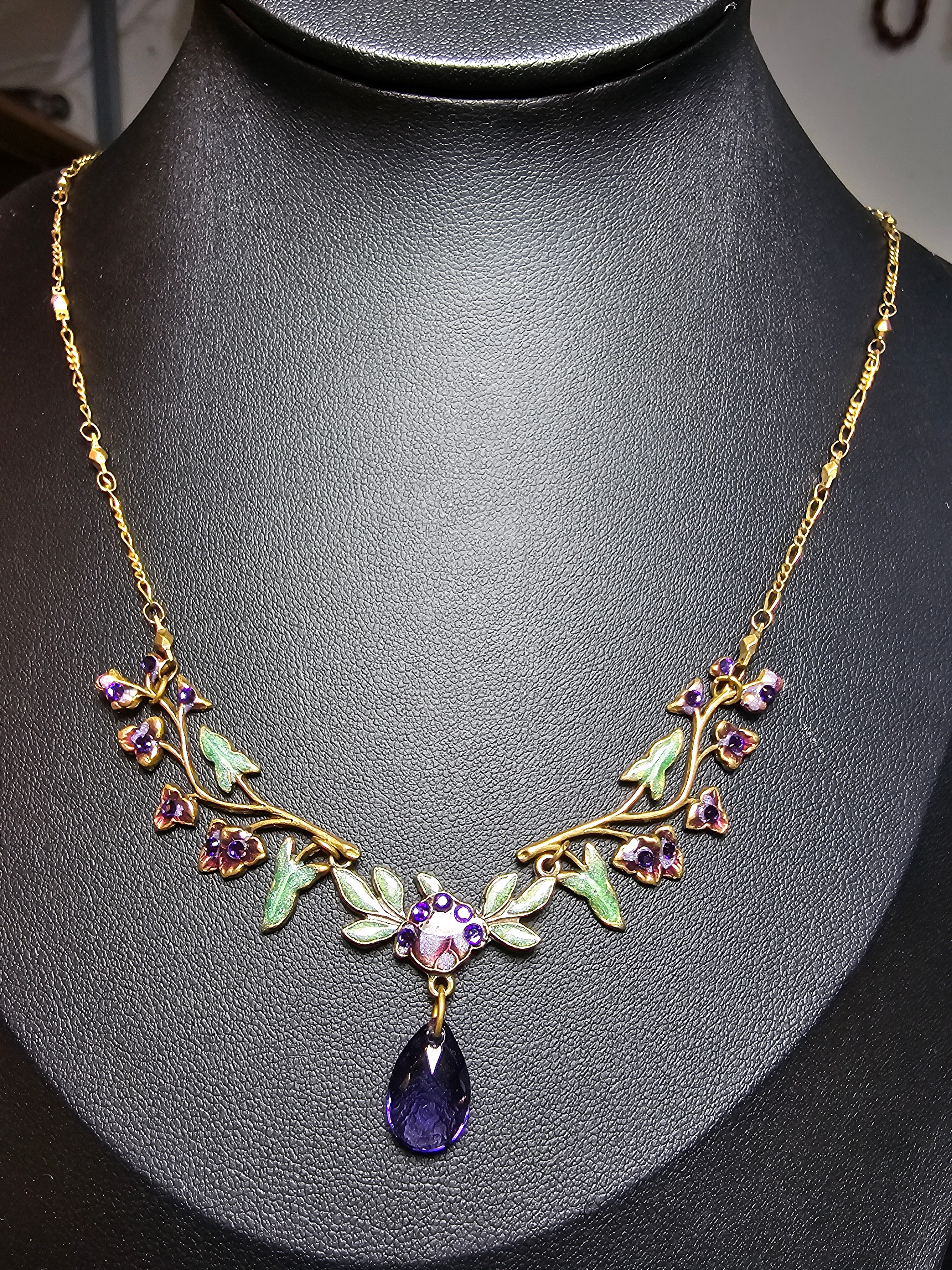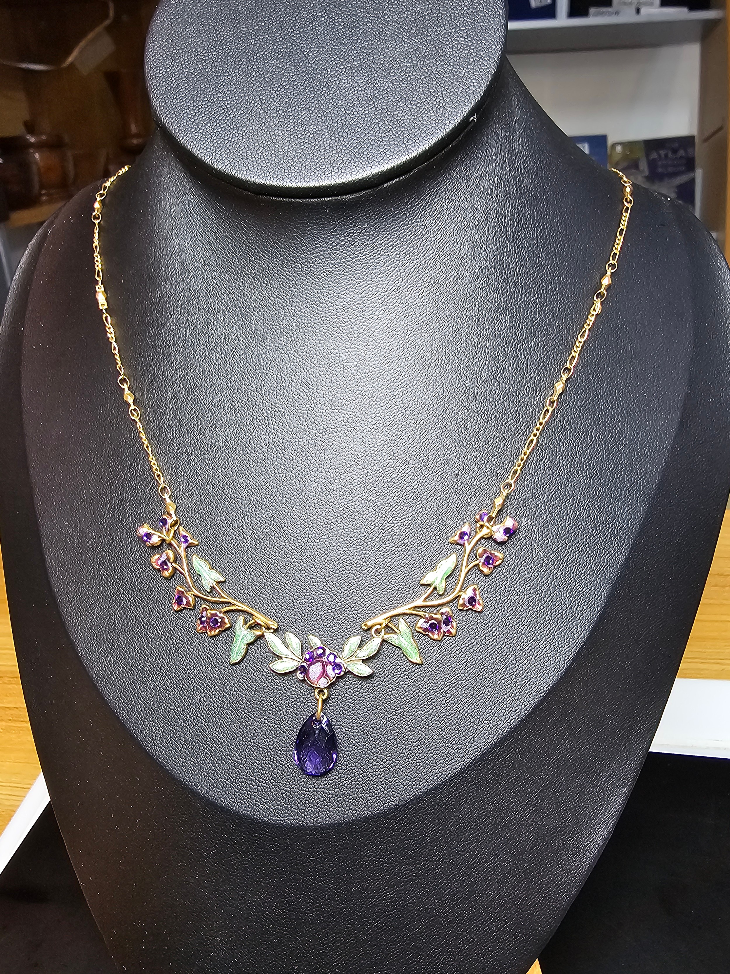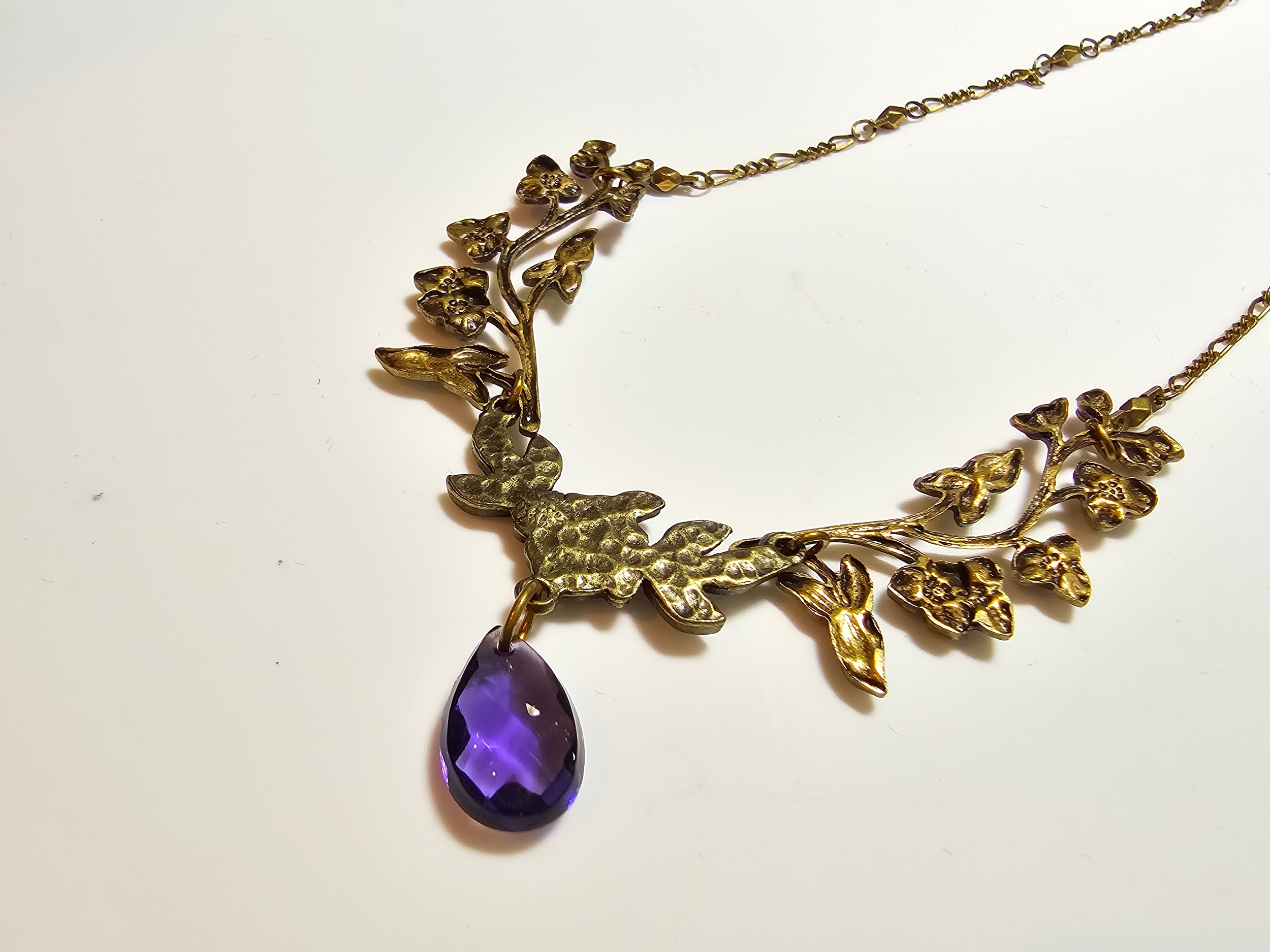 A very pretty vintage necklace by Anne Koplik designs made in USA featuring a pretty enamelled floral design inset with purple glass gems and a faceted purple glass drop having a magnetic barrel clasp, in good condition and boxed. Total length of 16.25".