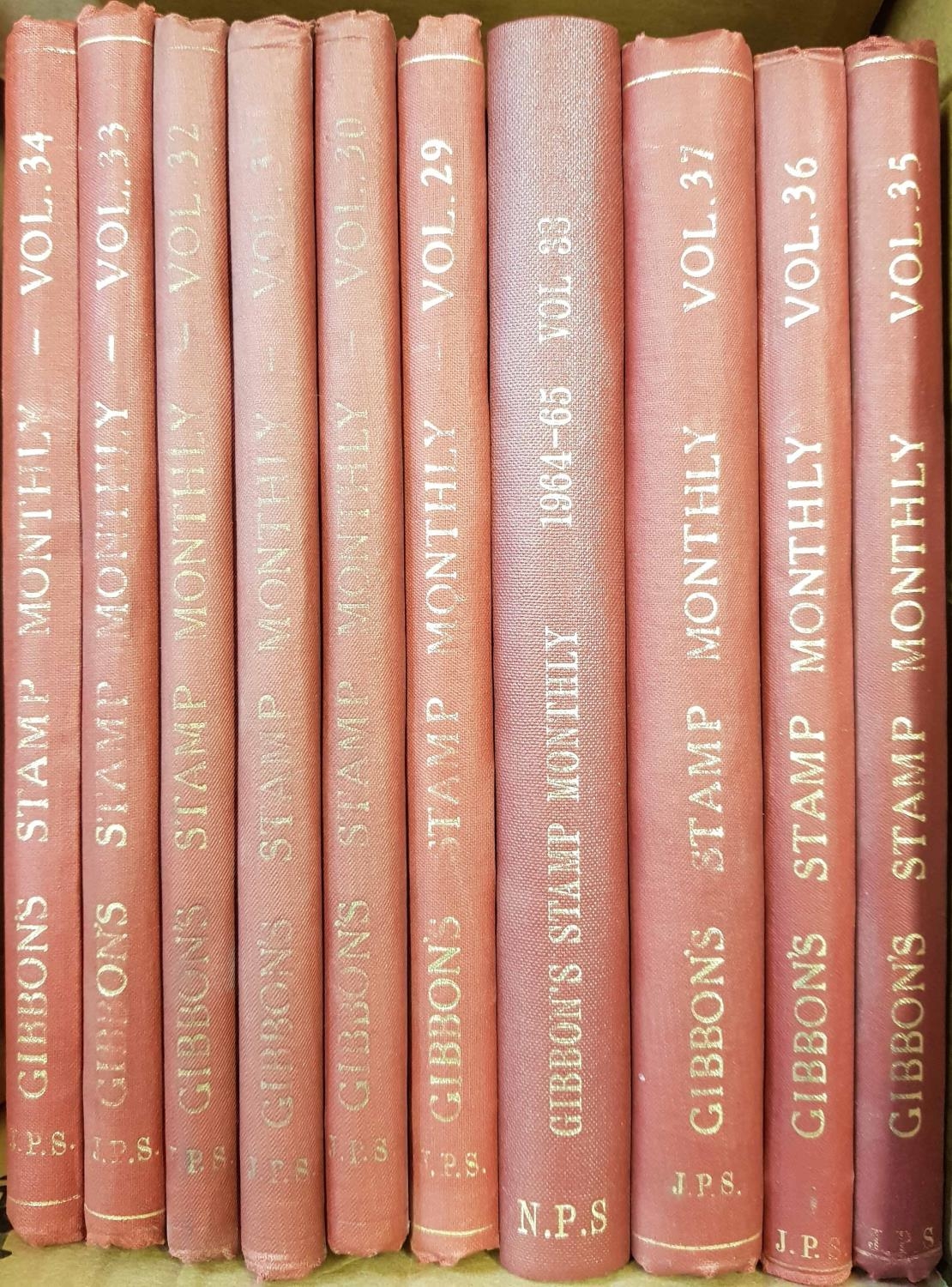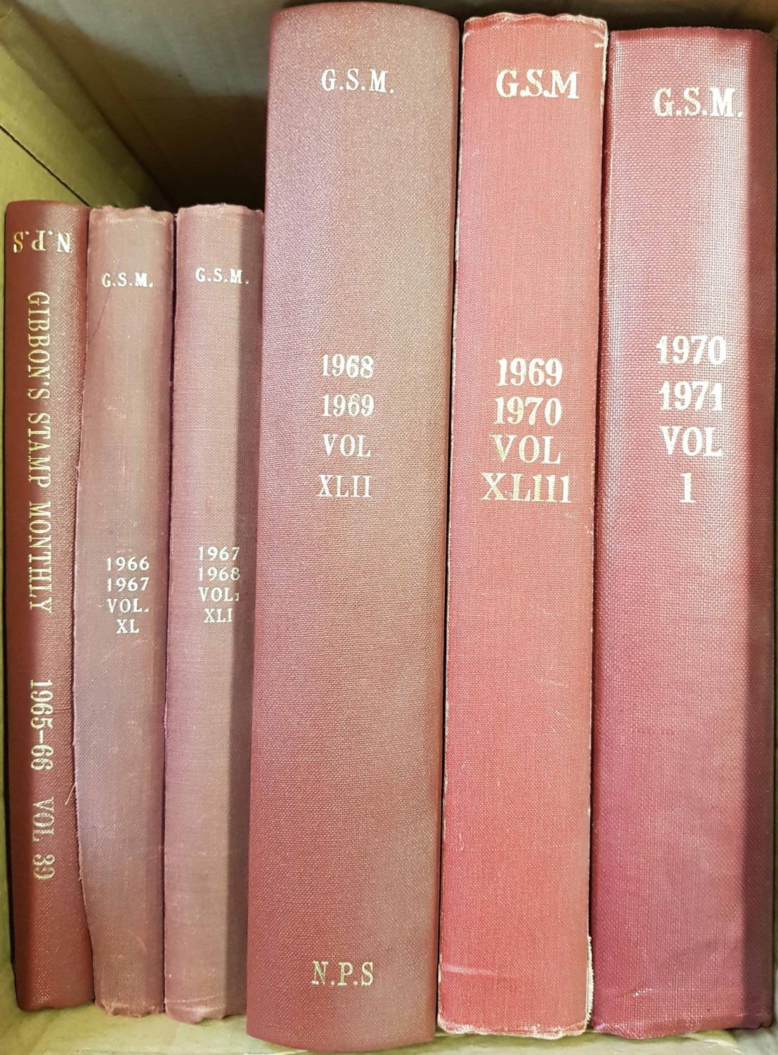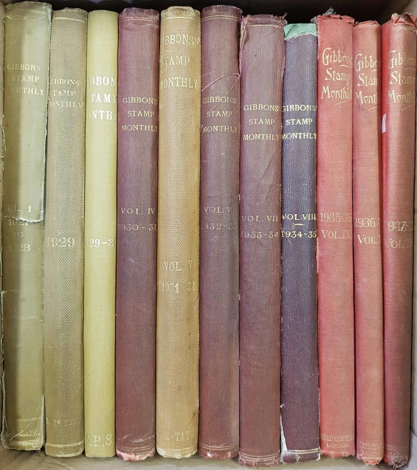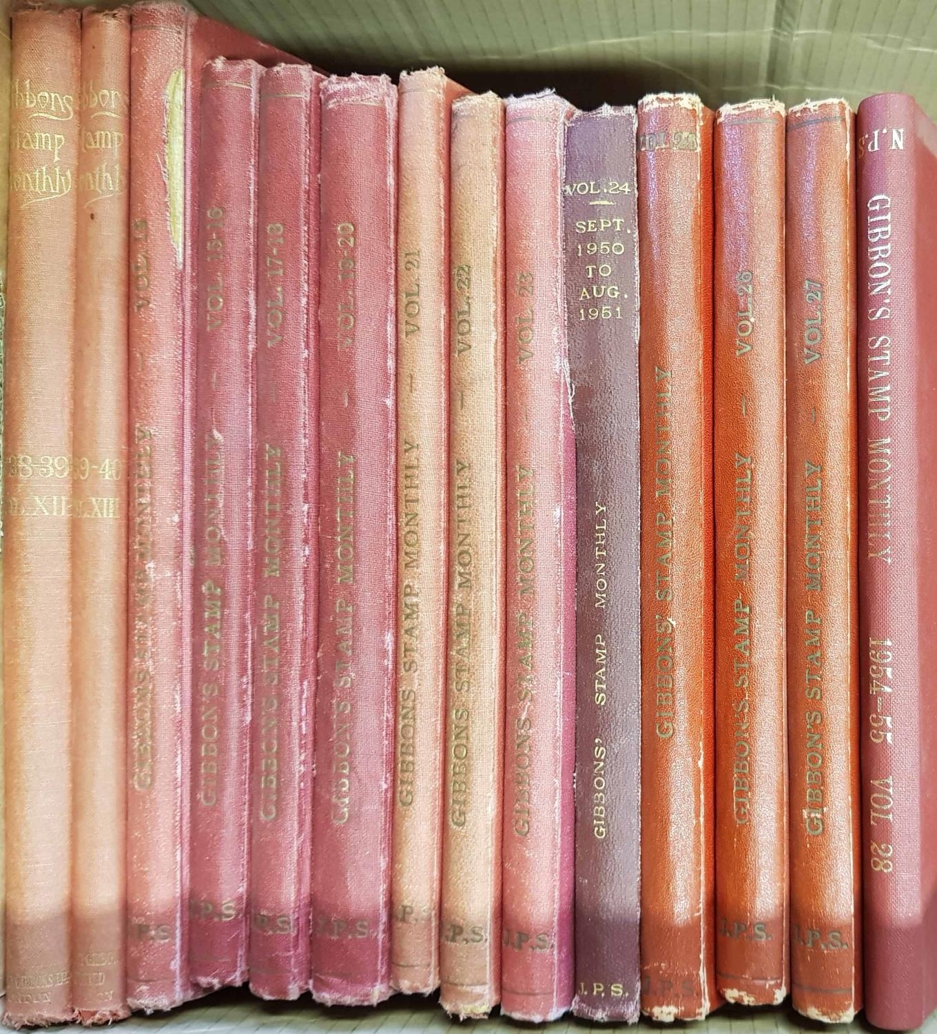 GIBBONS STAMP MONTHLY: Fifteen boxes containing a run 1927-28 through to 2001-2002 (missing one volume 1971-1972). (82)