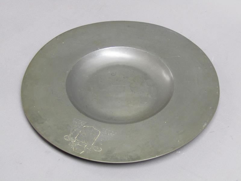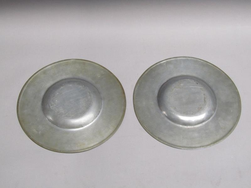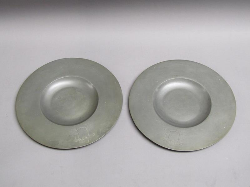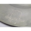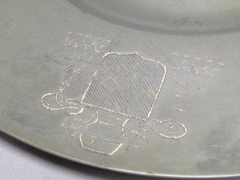 Two 19c pewter platters of circular form with dished centres and etched Coat of Arms, each 30cm diam.