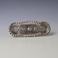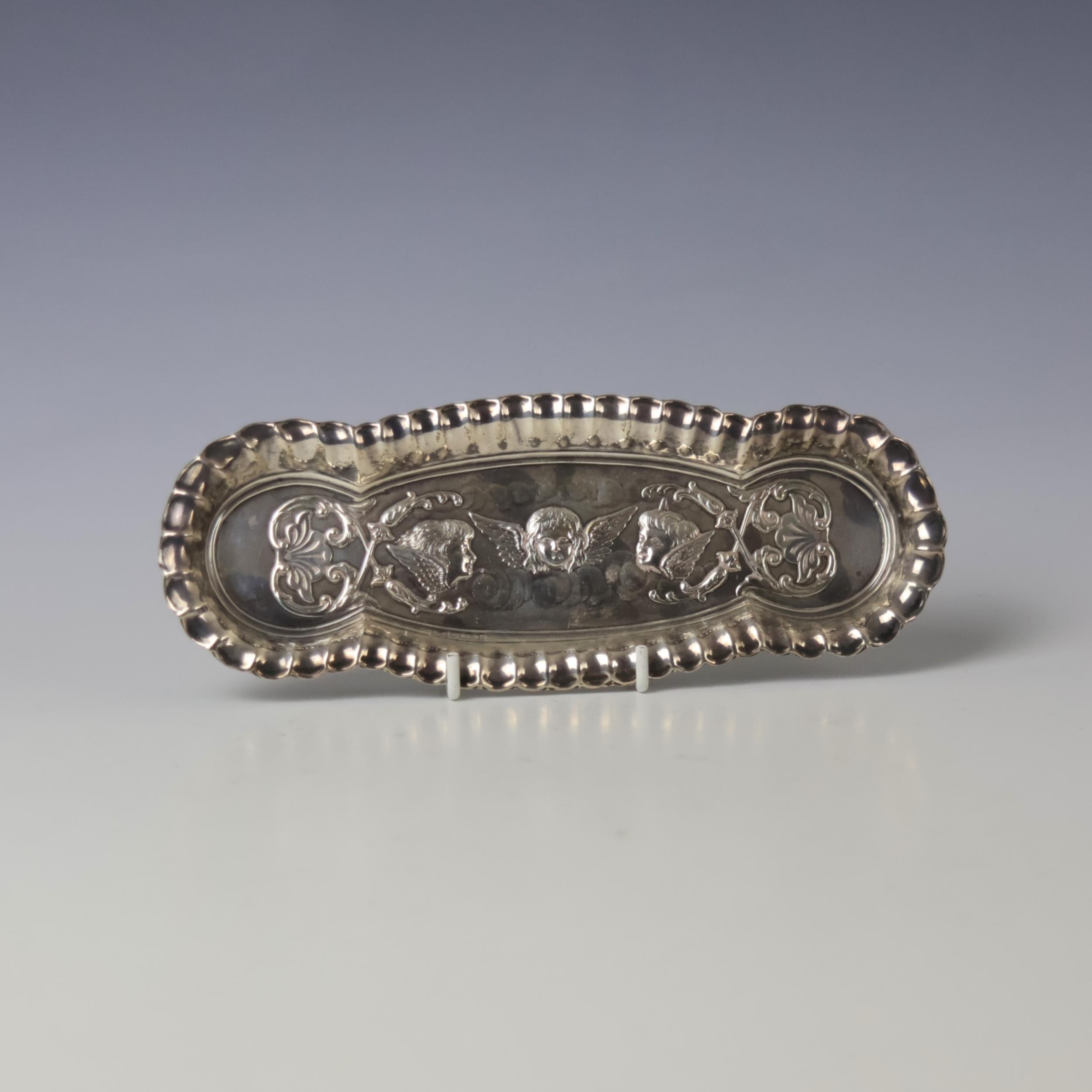 An Edwardian silver dressing table tray, Deakin & Francis Ltd, Birmingham 1901, of oval form with crimped rim above embossed decoration of cherubs, 23cm wide, 2ozt