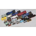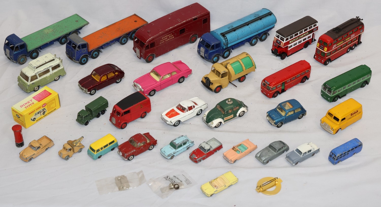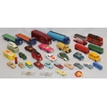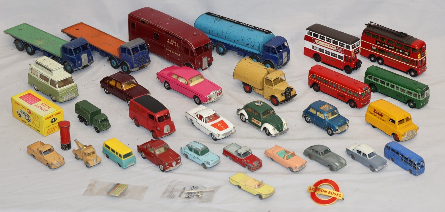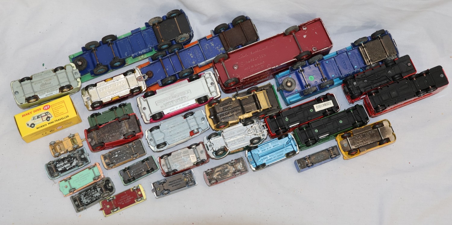 A Dinky Morris Mini Traveller (boxed), 7 Dinky die-cast play worn models of lorries and trucks and 22 various other Lesney and Corgi die-cast play worn models of buses, cars etc. (3)