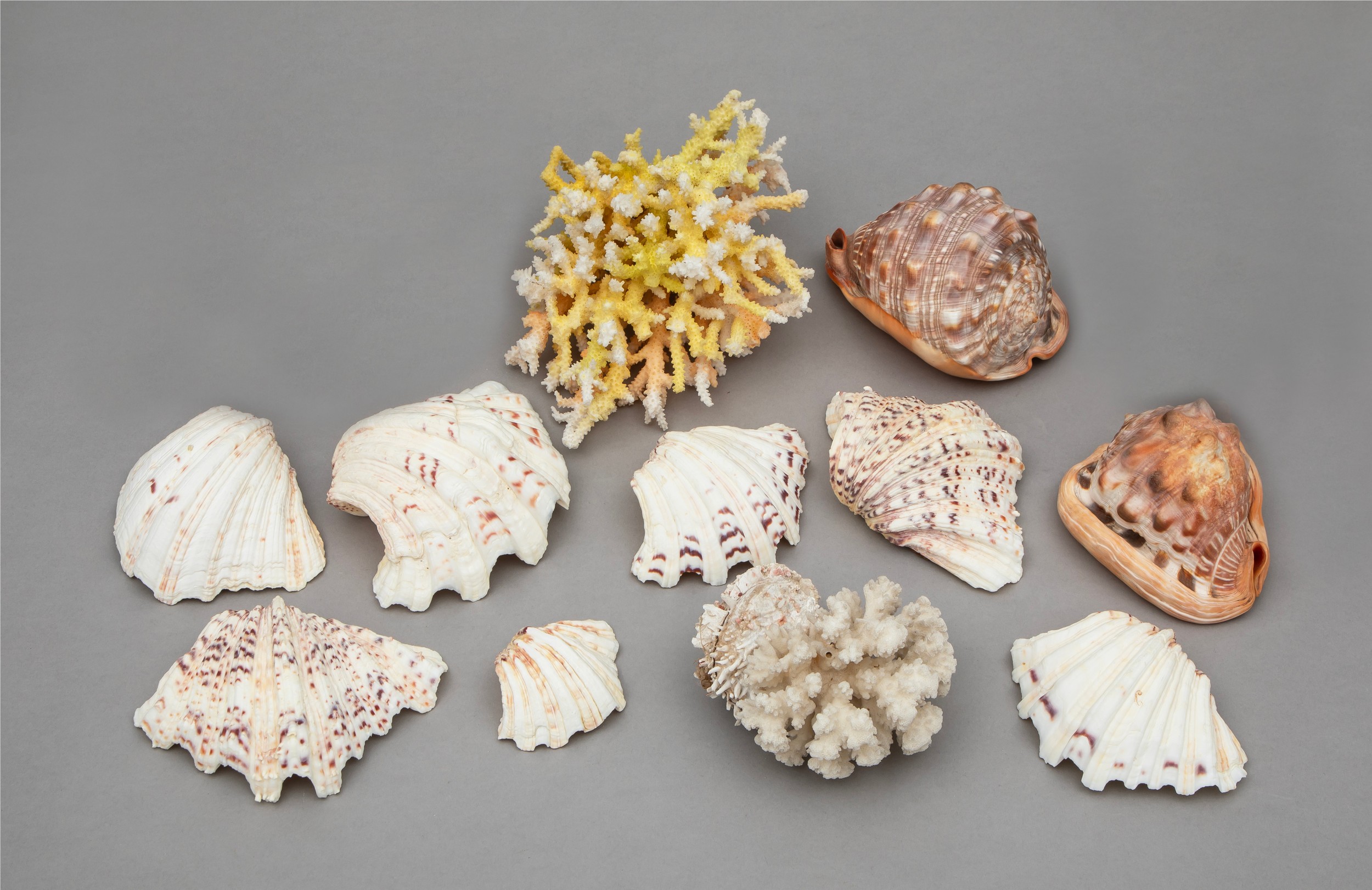 Comprising: Nine shells and two decorative coral clusters, one yellow and one white,