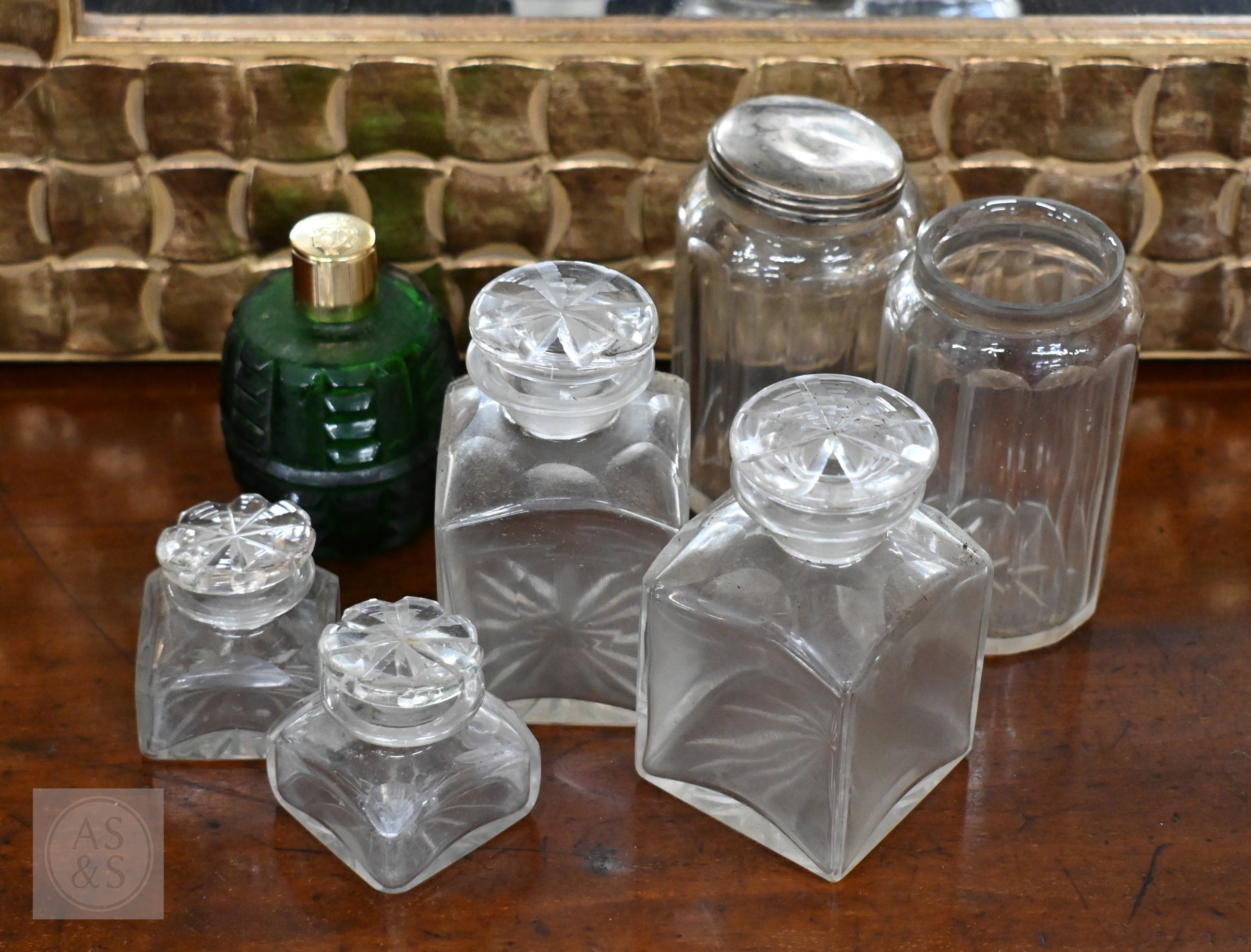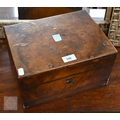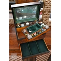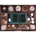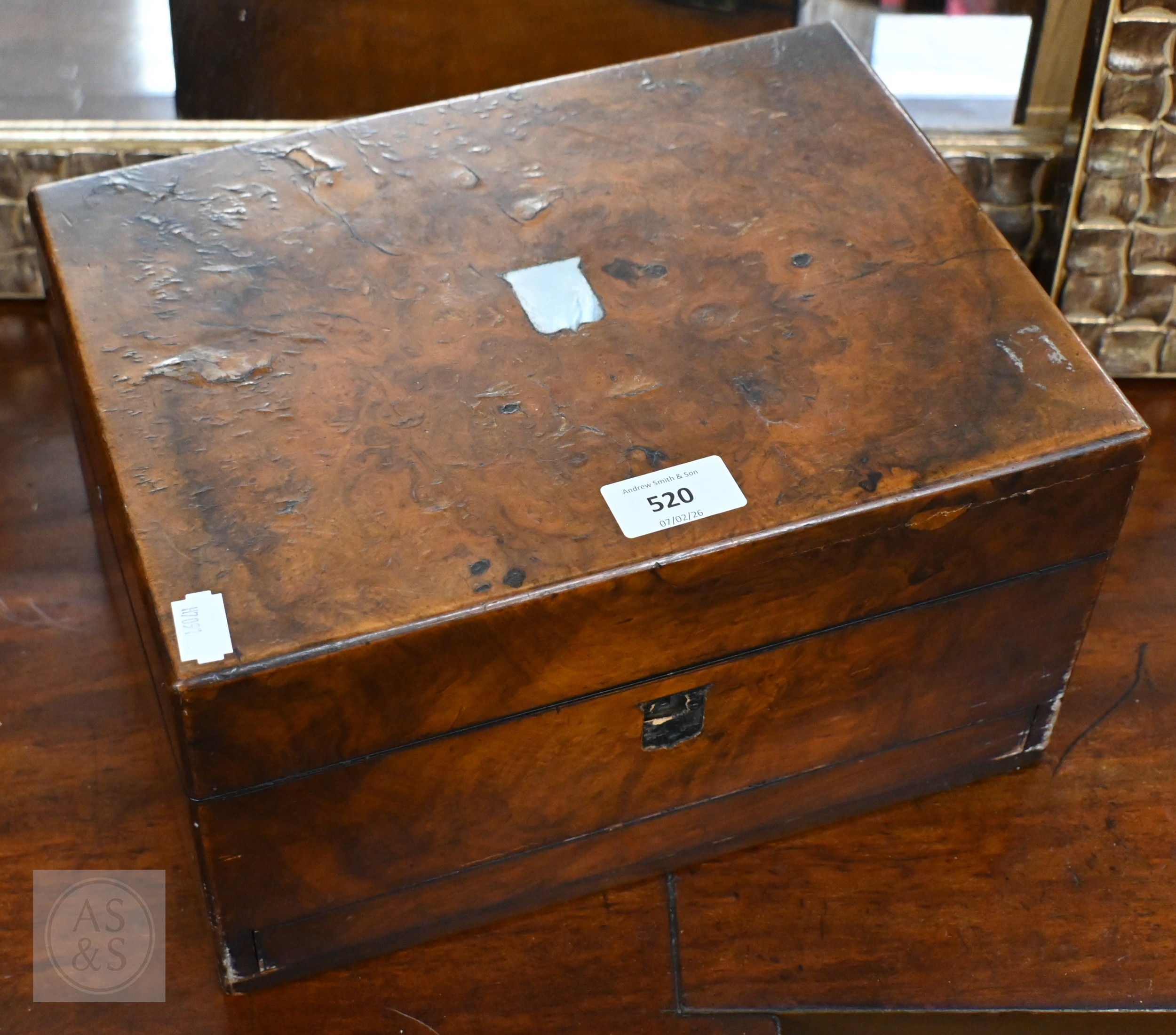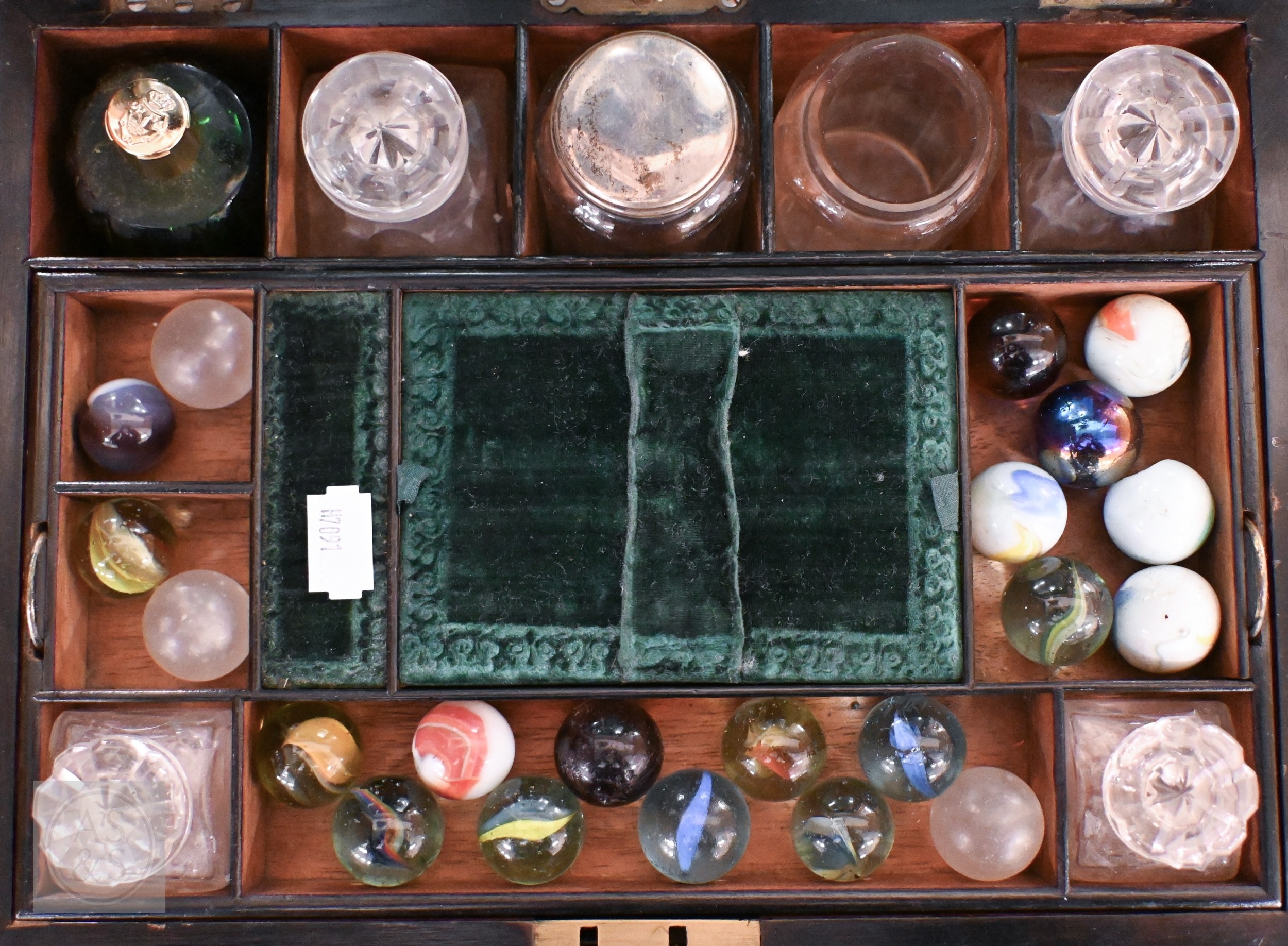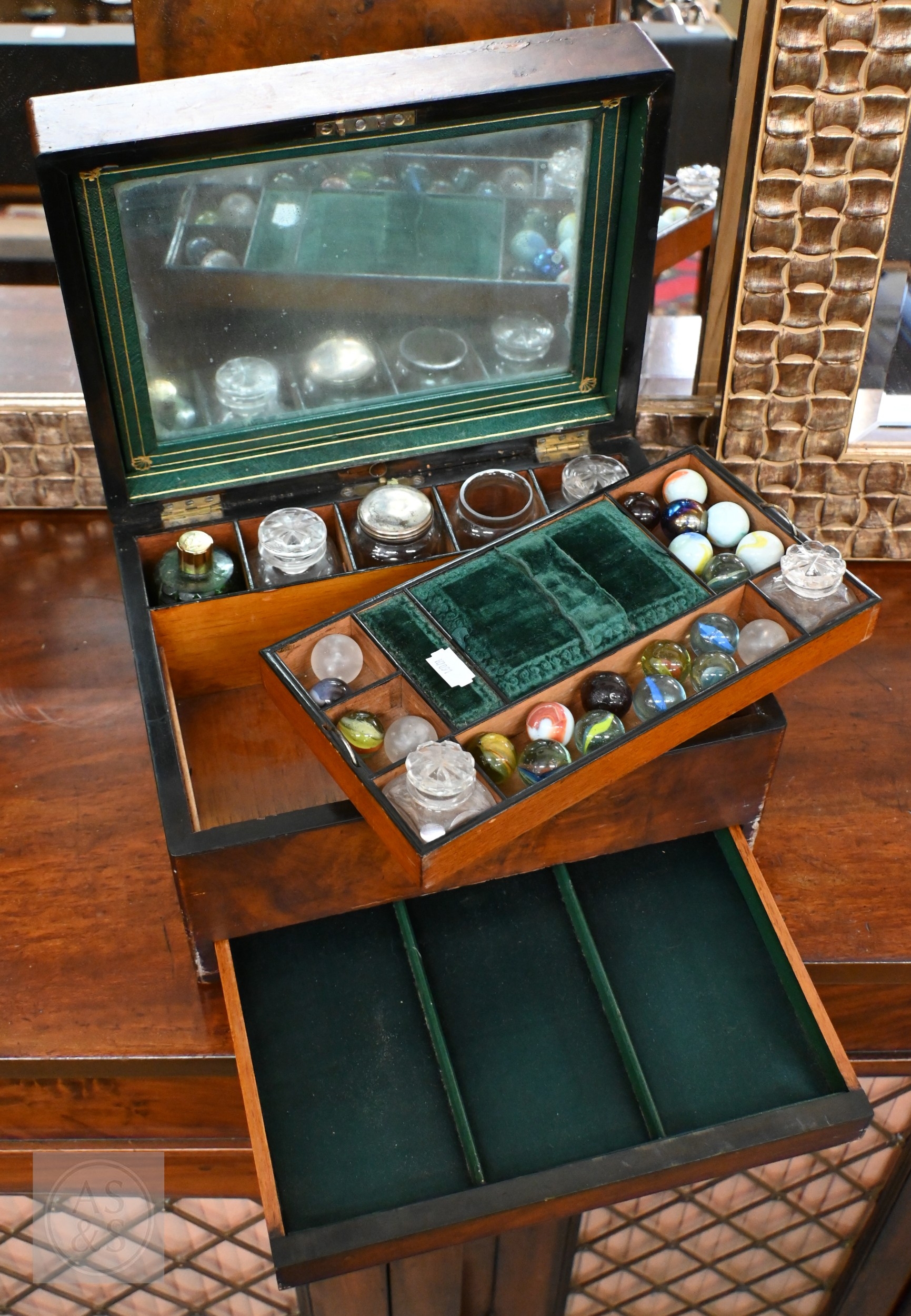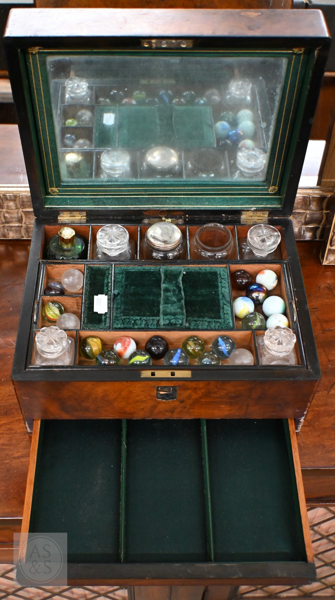 A Victorian walnut toilet case with part fittings, marbles, etc