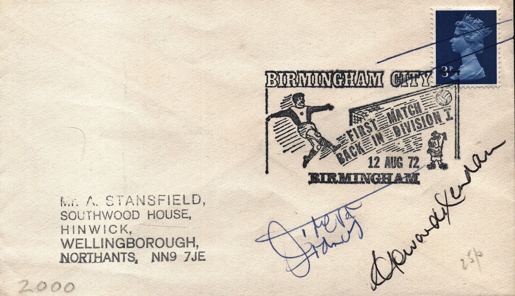 Howard Kendall & Trevor Francis multi signed FD. Birmingham City. Single stamp plus Single post marked 12 Aug 72.