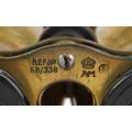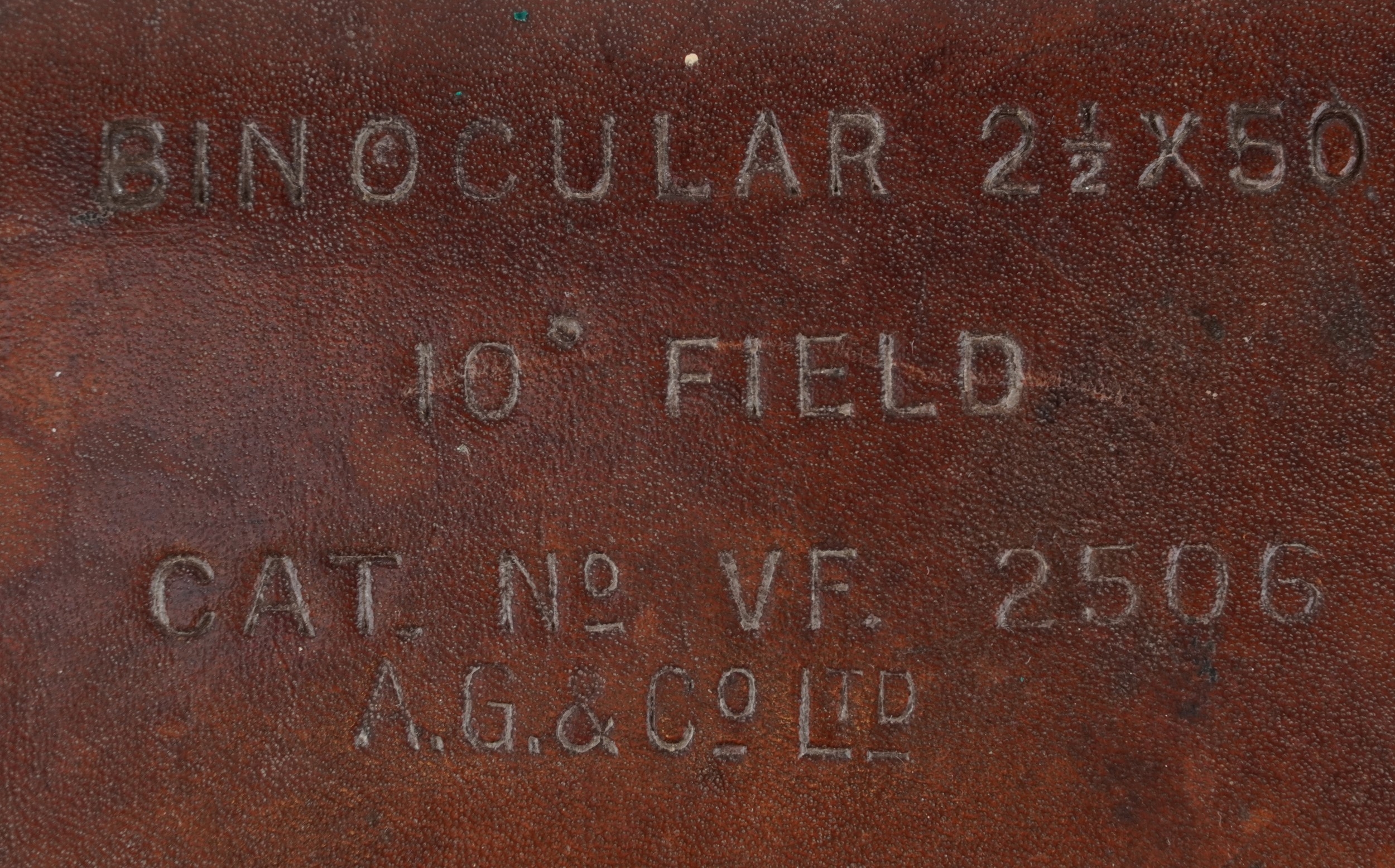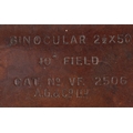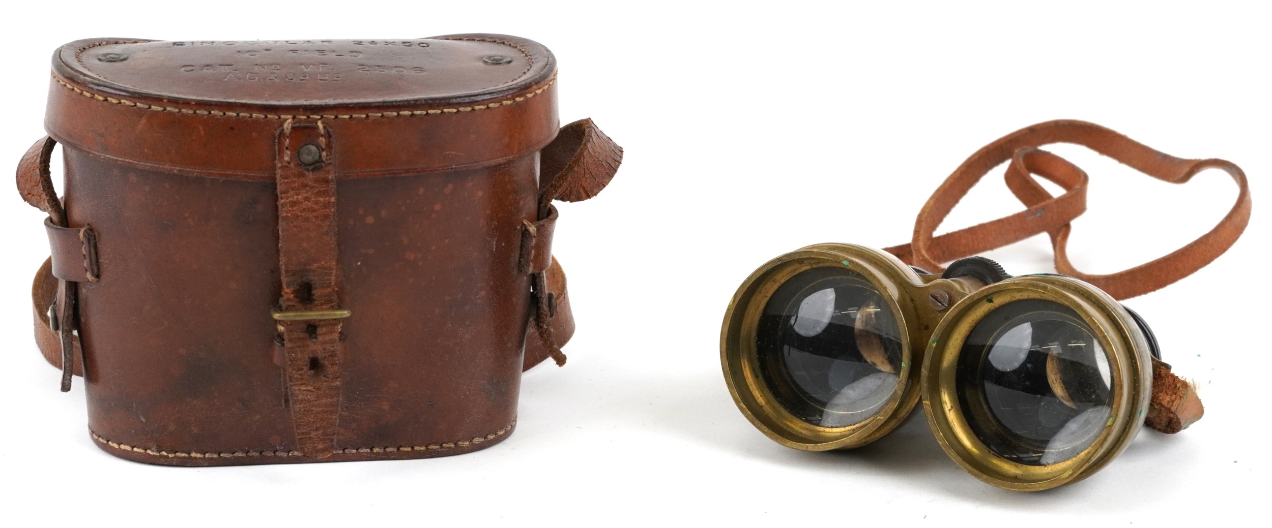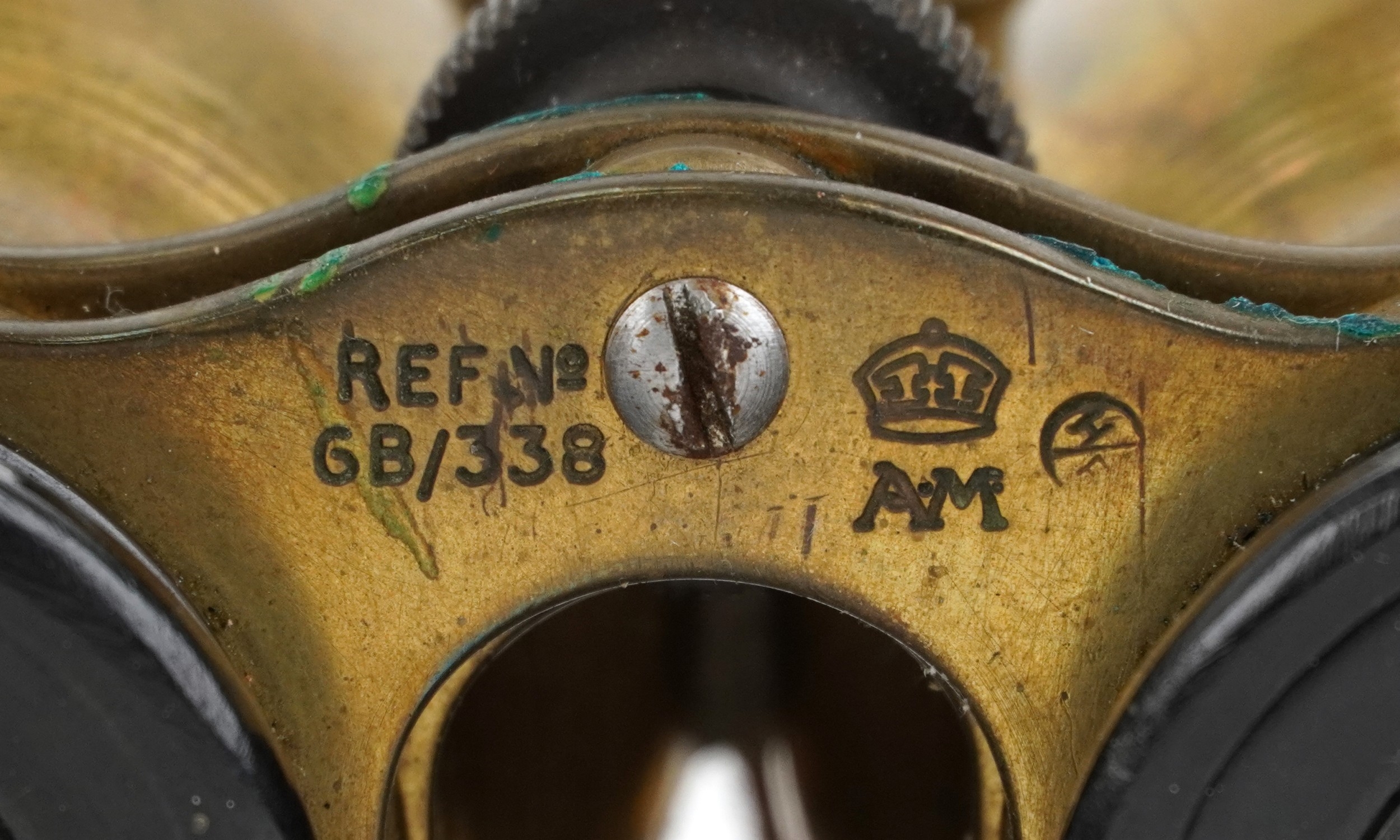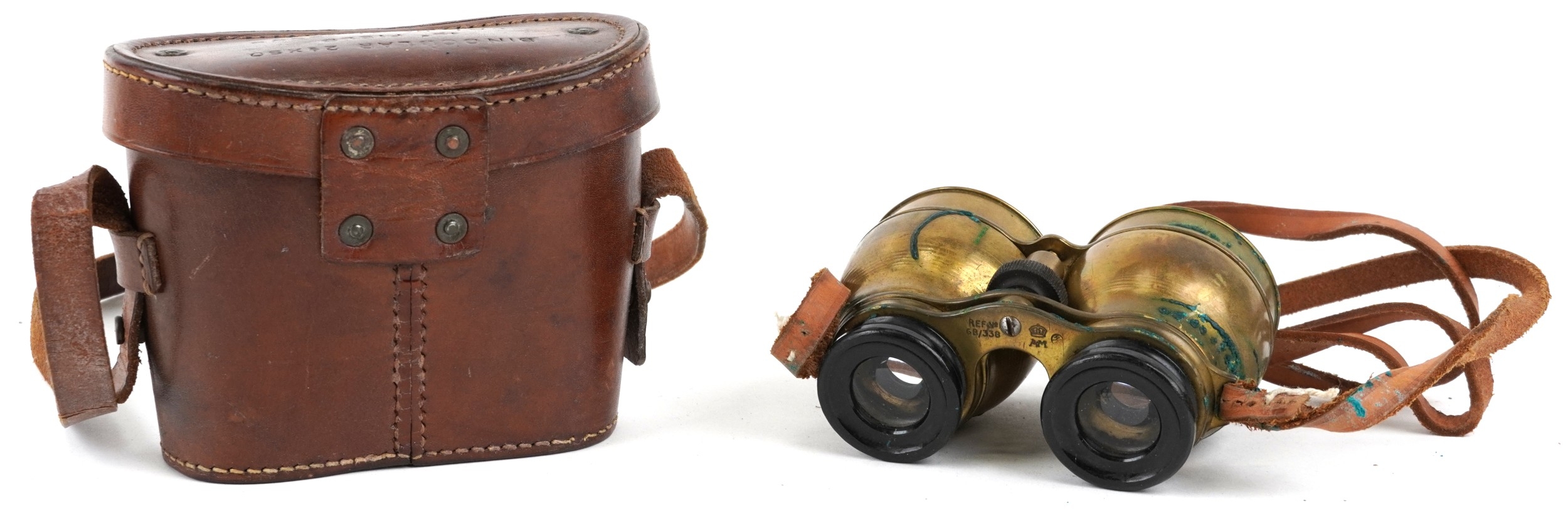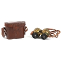 A pair of early 20th century brass binoculars, possibly military, bearing reference number GB/338, 13cm wide, with original leather case.