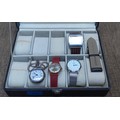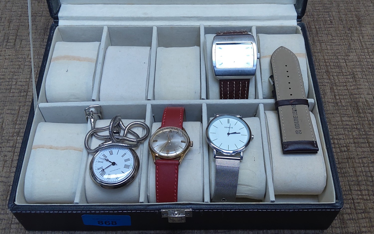 Faux leather watch box with three watches including Avia and an antimagnetic pocket watch.
