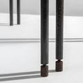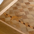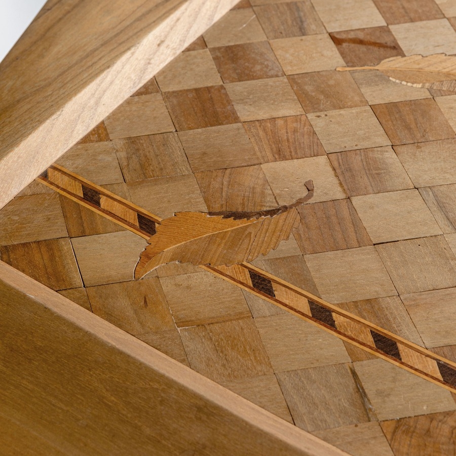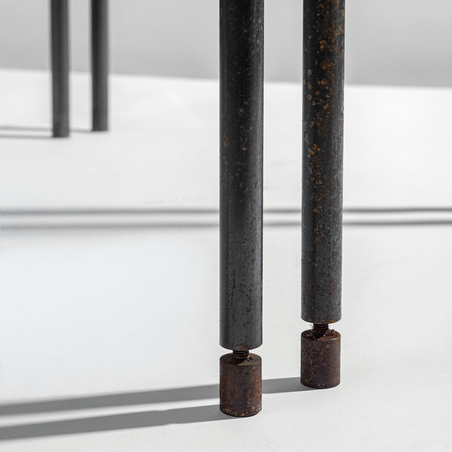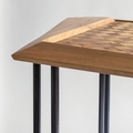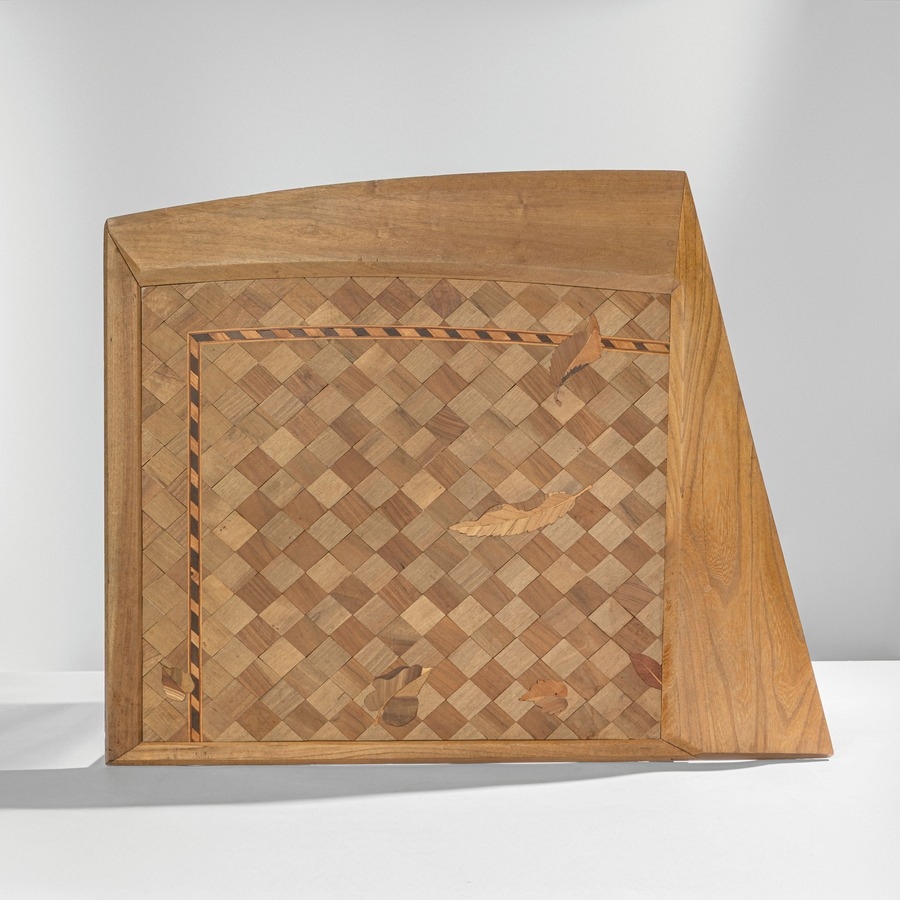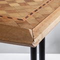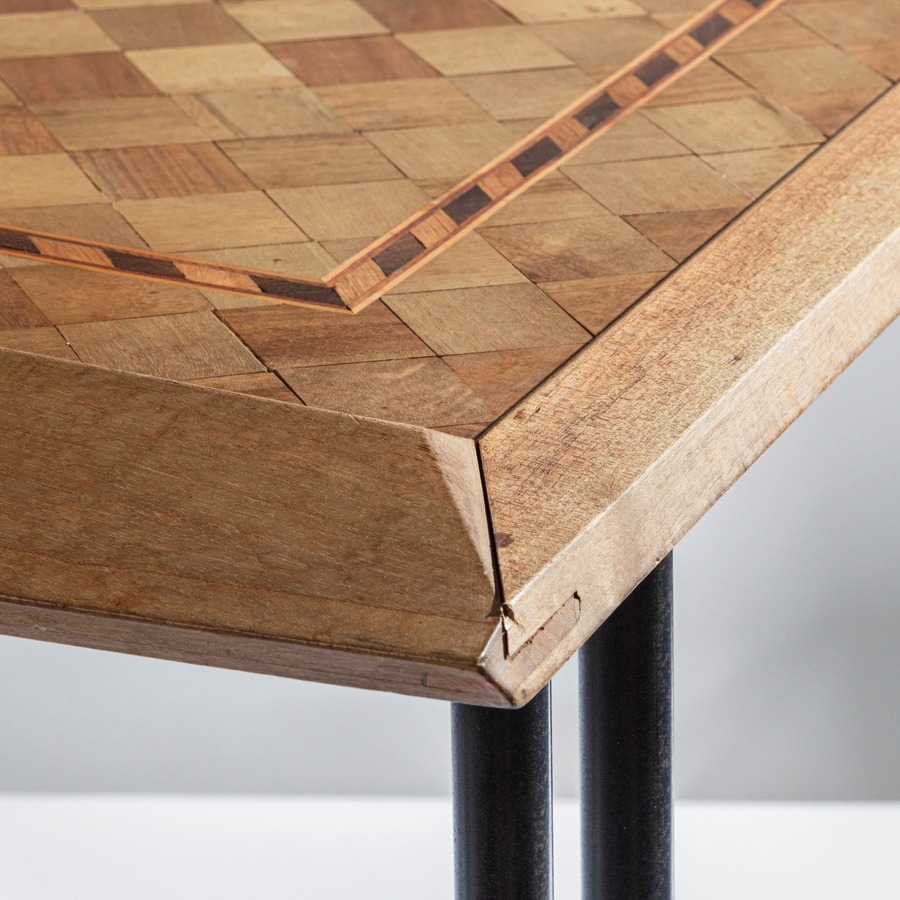 Tavolo da appoggio per TopTen Torino. Ferro patinato, legni di frassino massello, marqueterie in essenze di pregio. Esecuzione L. Ribolzi, Italia 1990 ca.