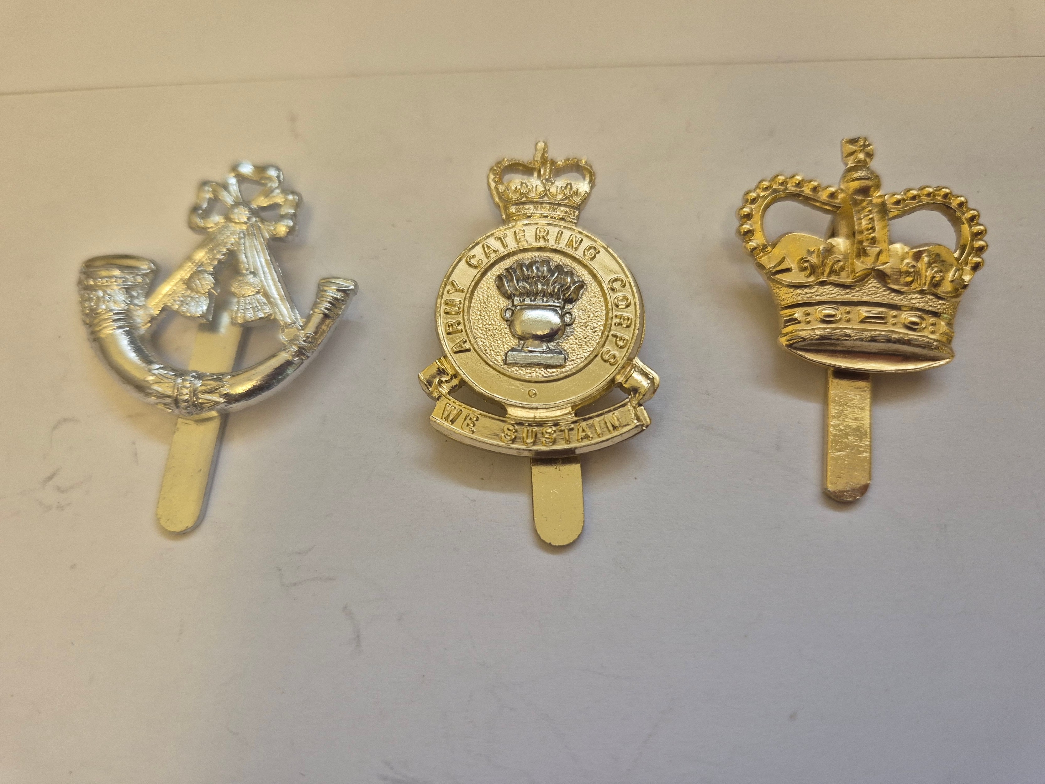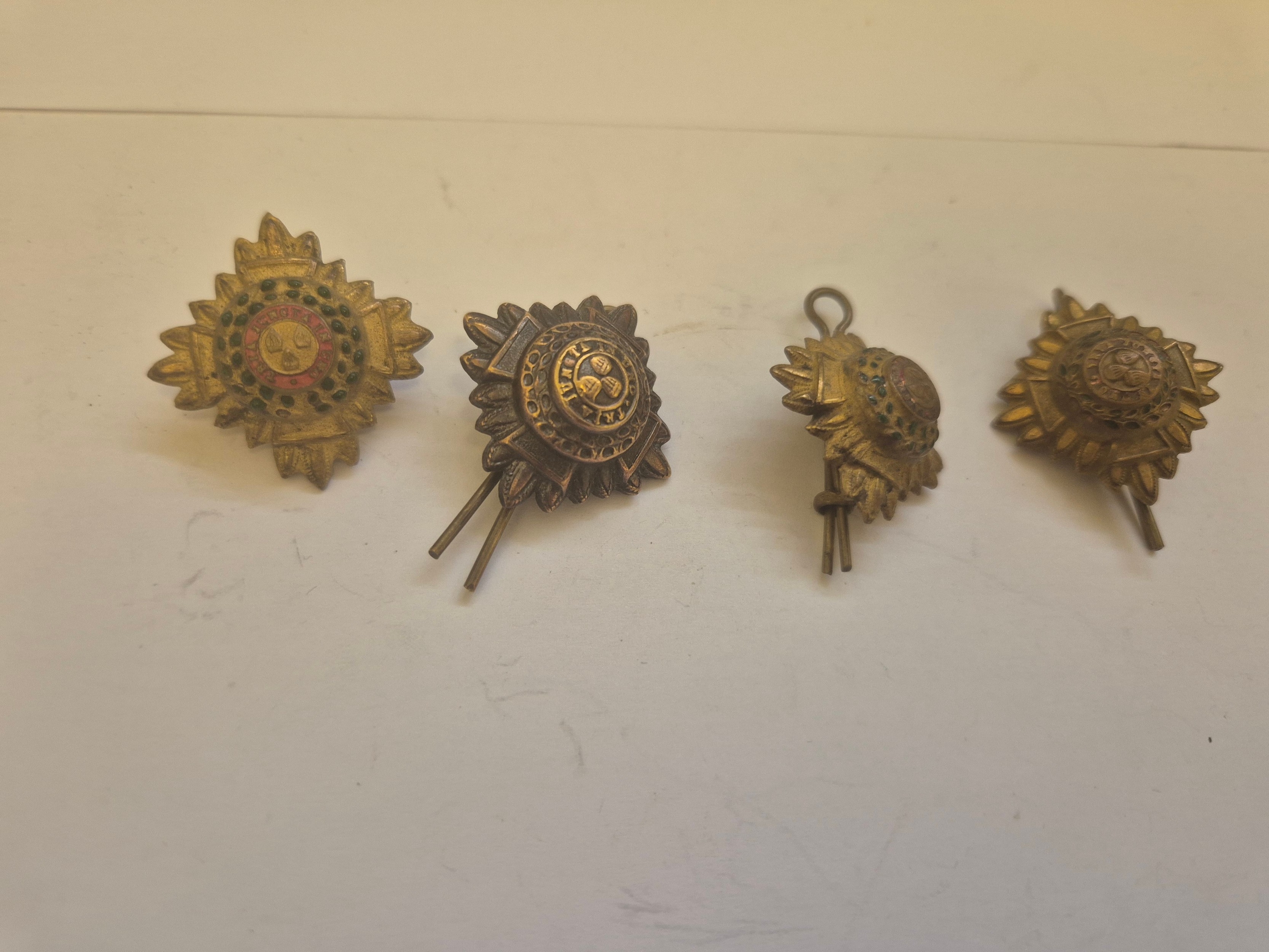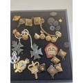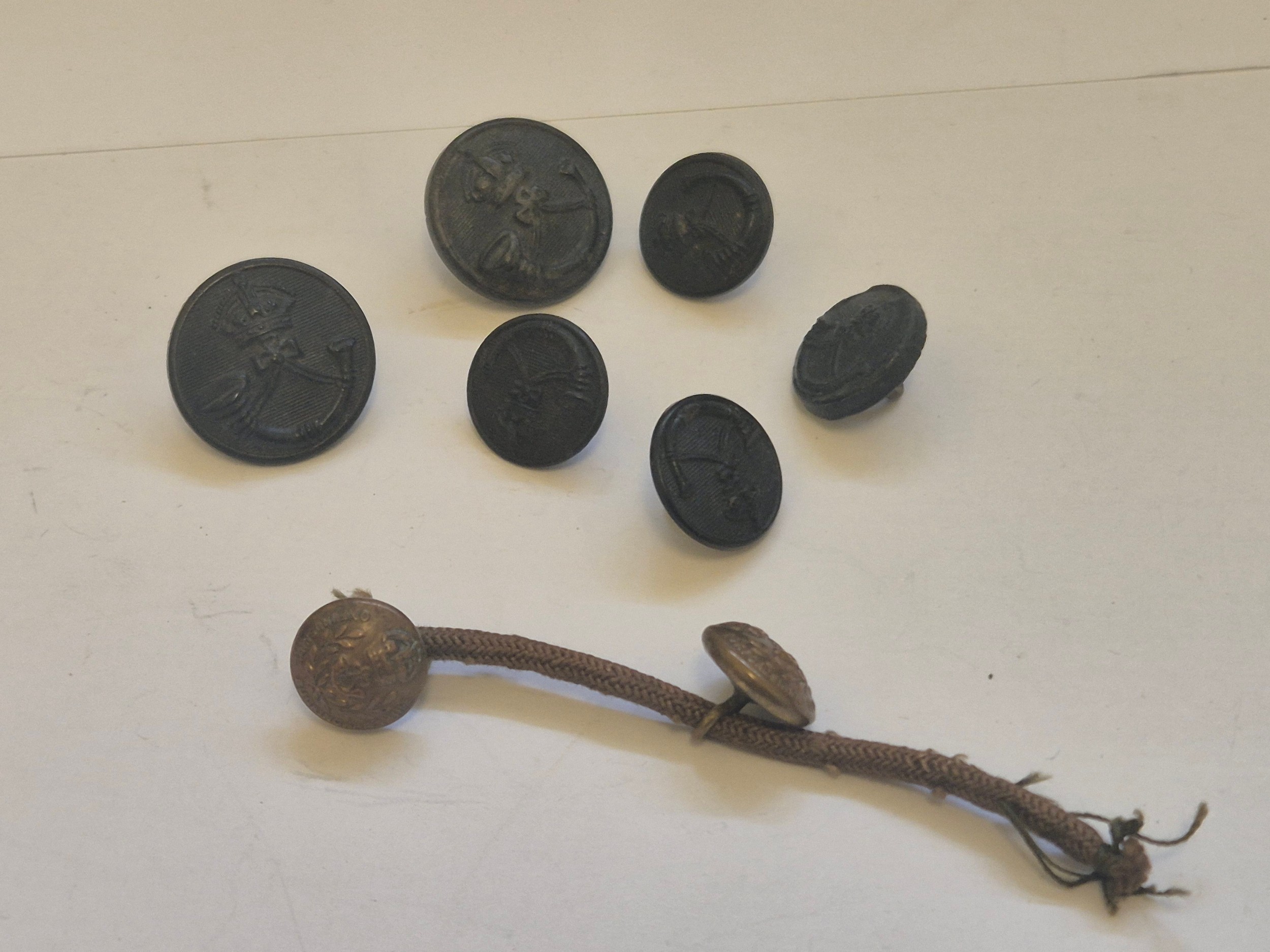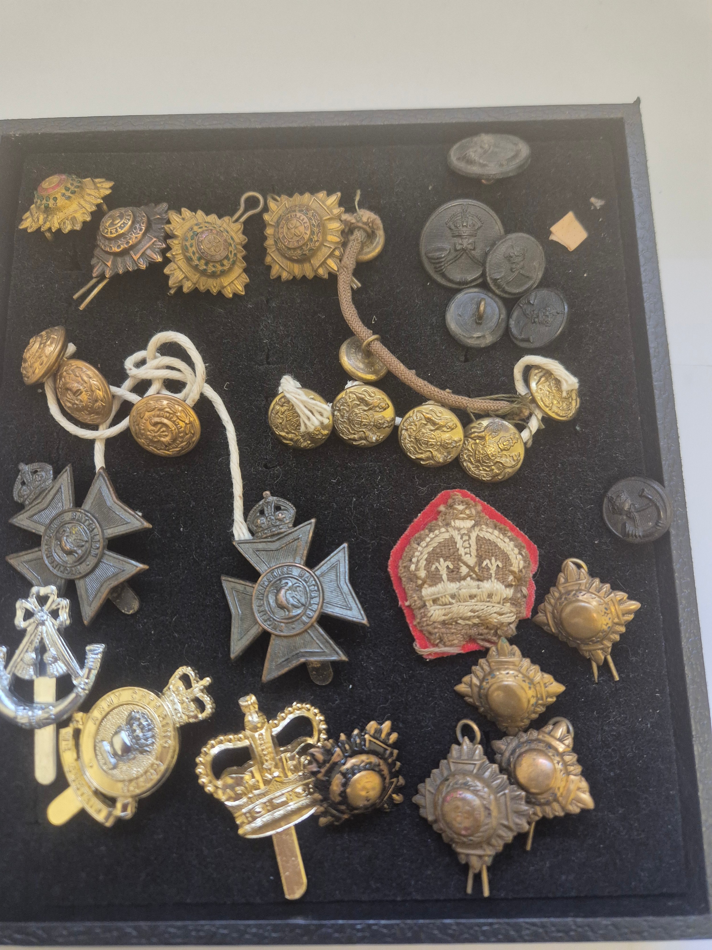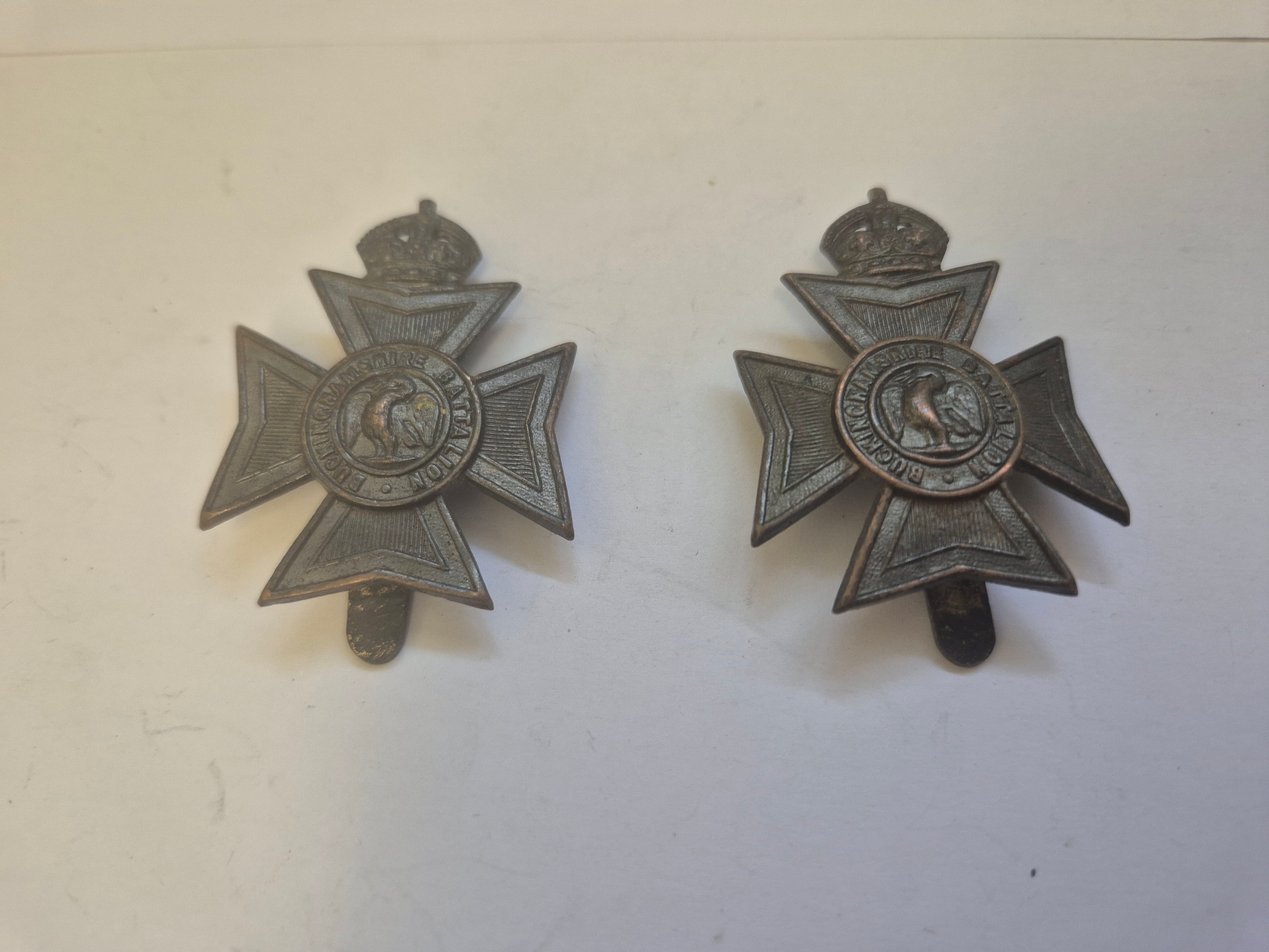 Group of militaria WW1 & WW2 badges and buttons including Officer's Pips, 2 Buckinghamshire Battalion cap badges, rifle brigade buttons etc